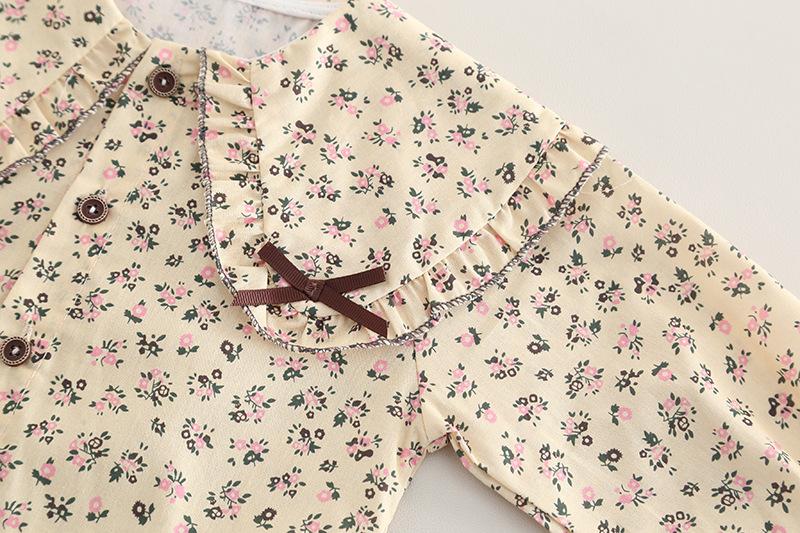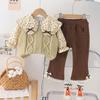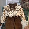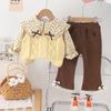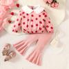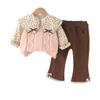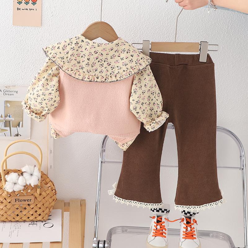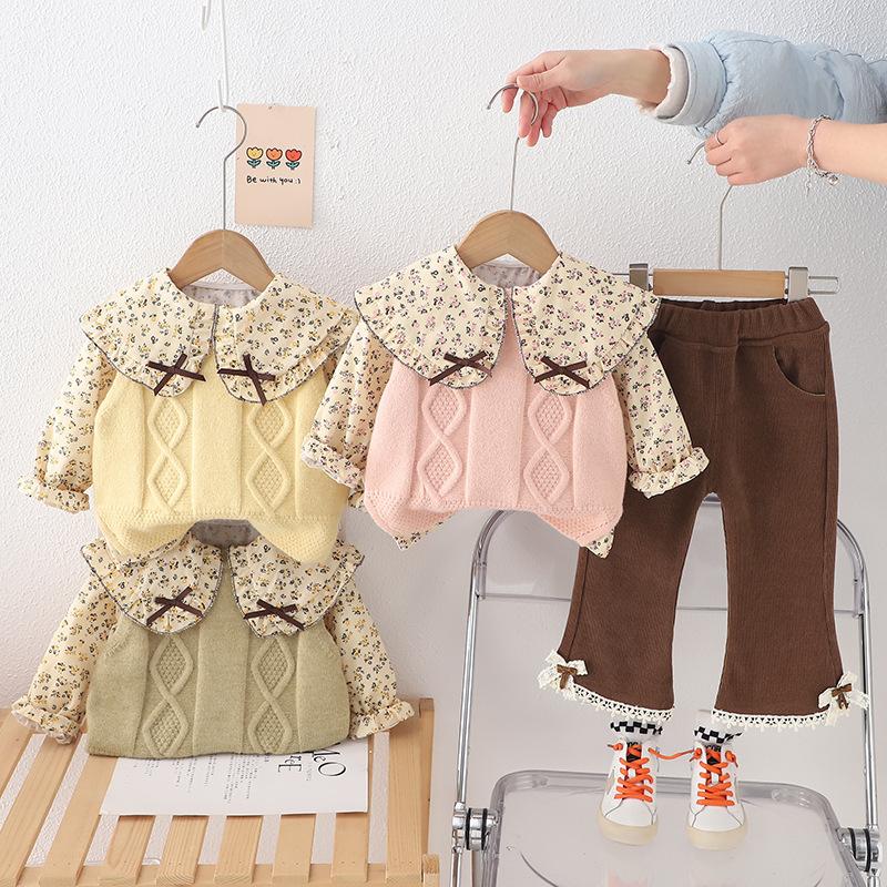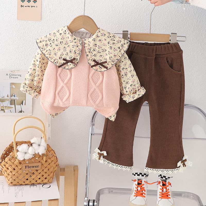 Traje de niña para primavera y otoño, nuevo suéter con giro, chaleco, lazo floral, cuello de muñeca, camisa, pantalones acampanados, traje