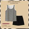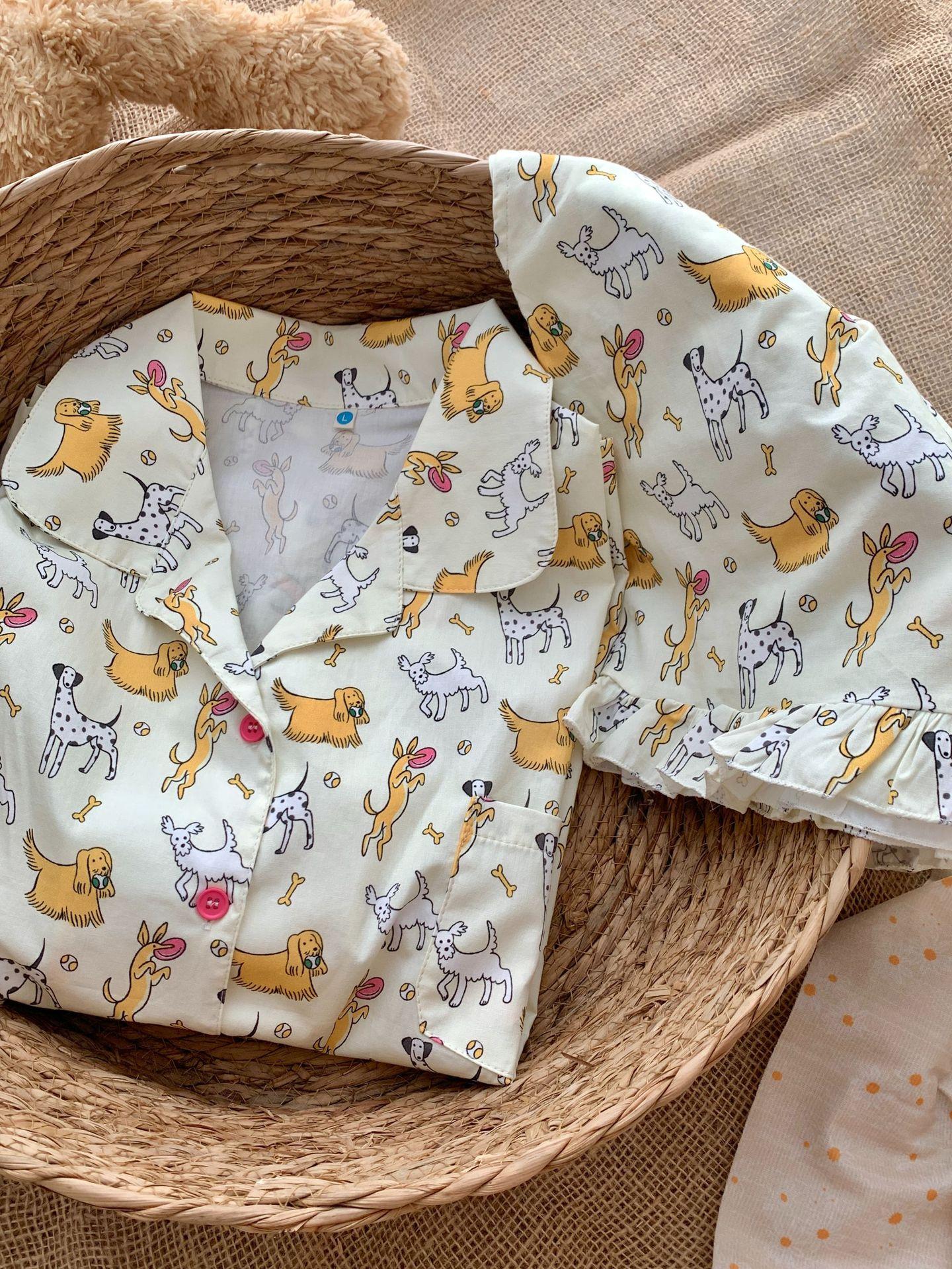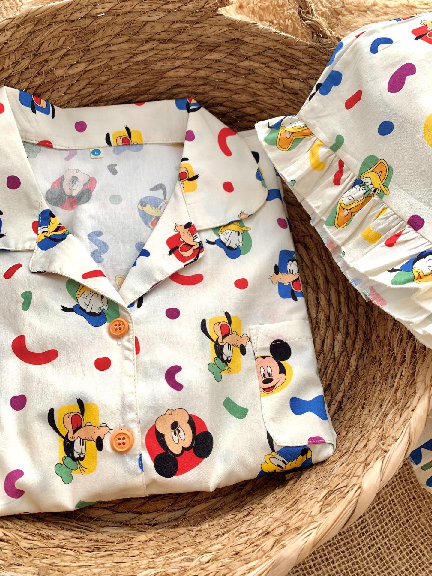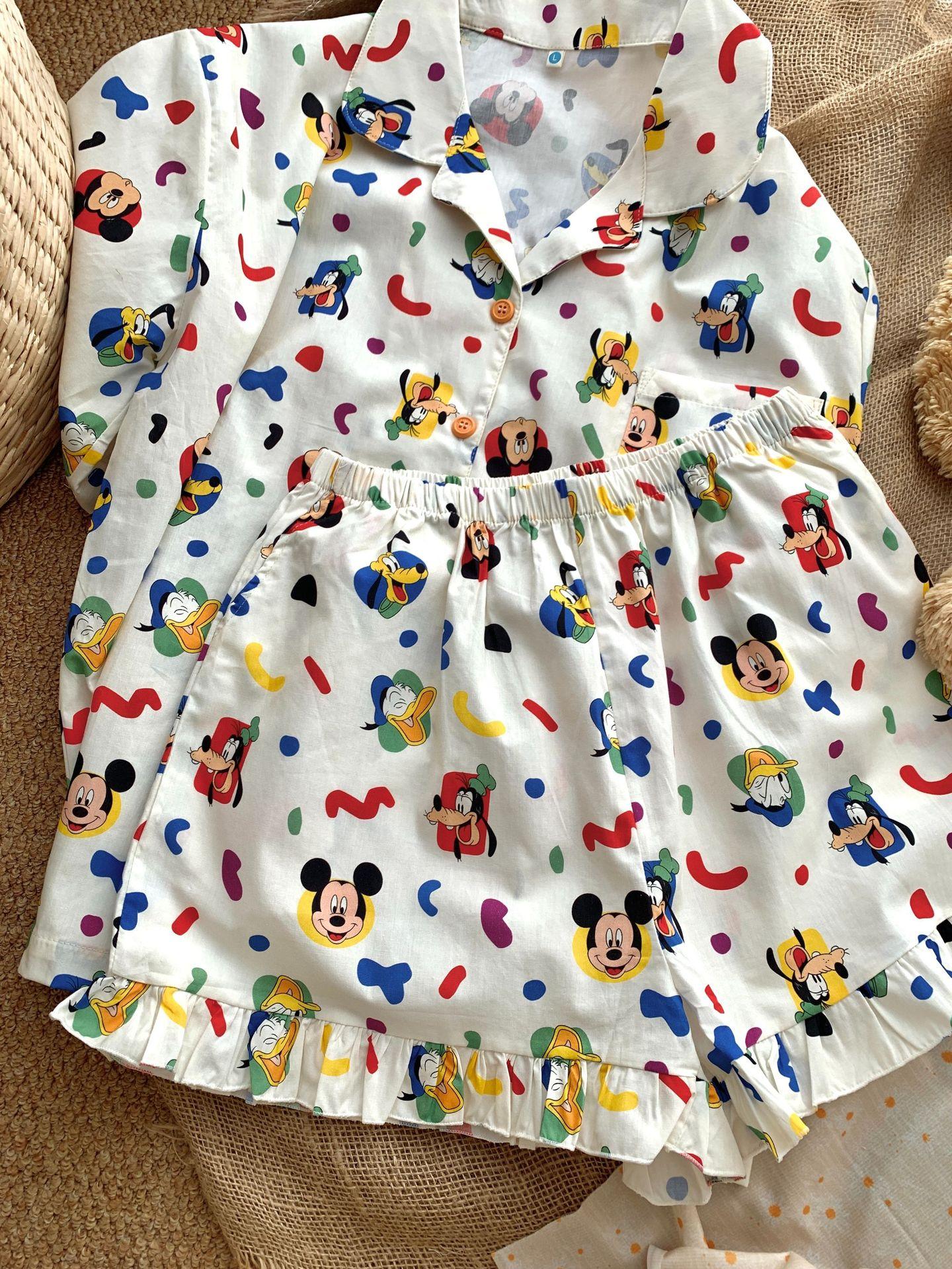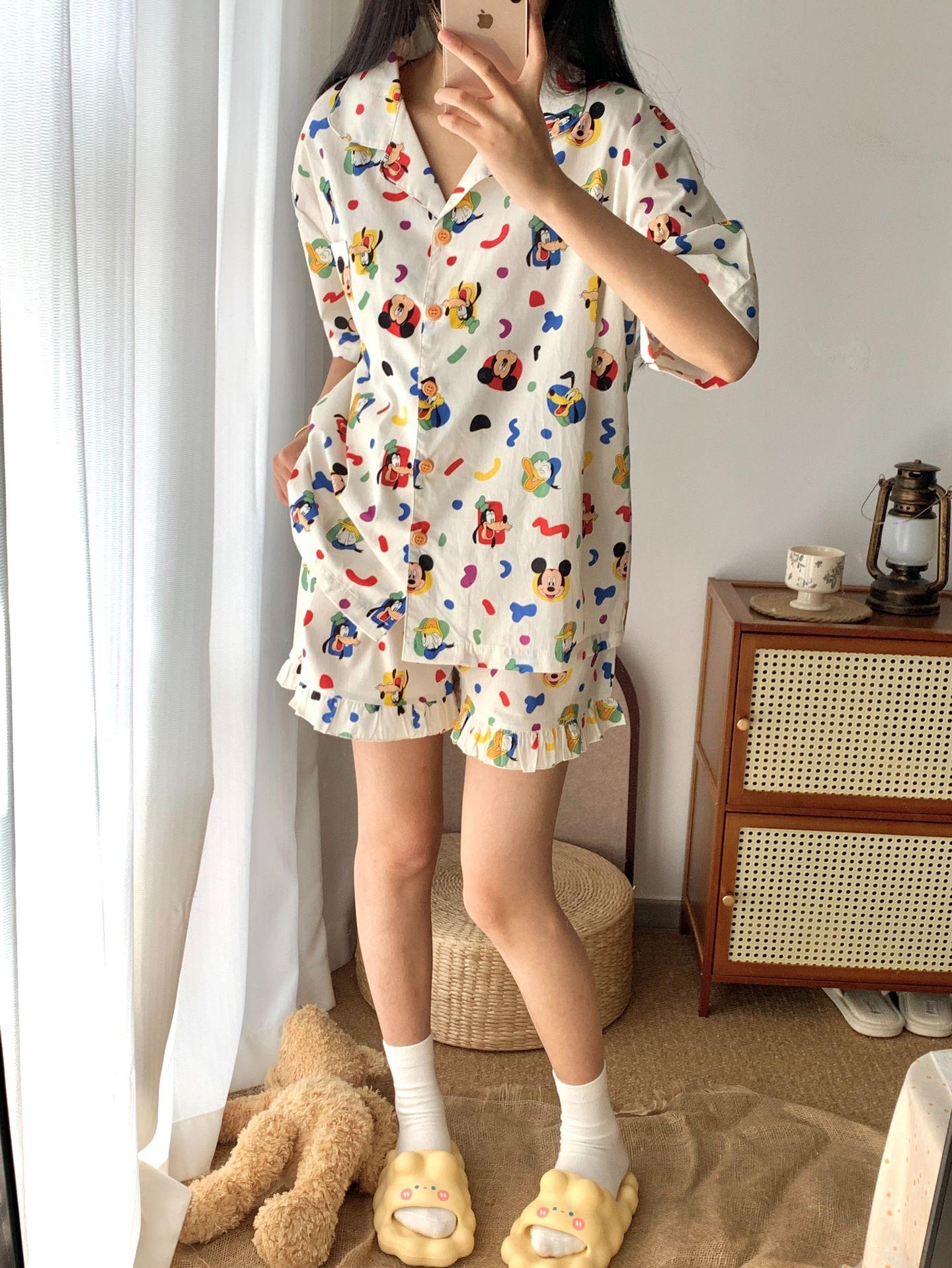 White mickey-woven cotton short-sleeved shorts, Pug-woven cotton short-sleeved shorts, Black bottom small flow...