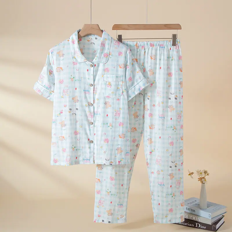 Pijama corto de gasa de verano para mujer, de manga corta, transpirable, de algodón puro, con solapa, holgado, con dibujos animados, fino, para el hogar