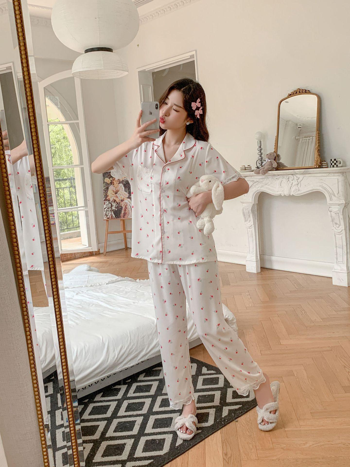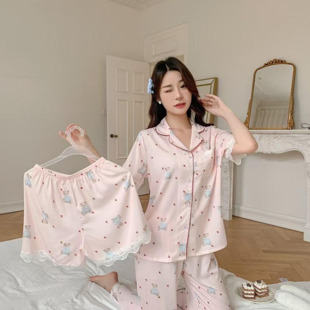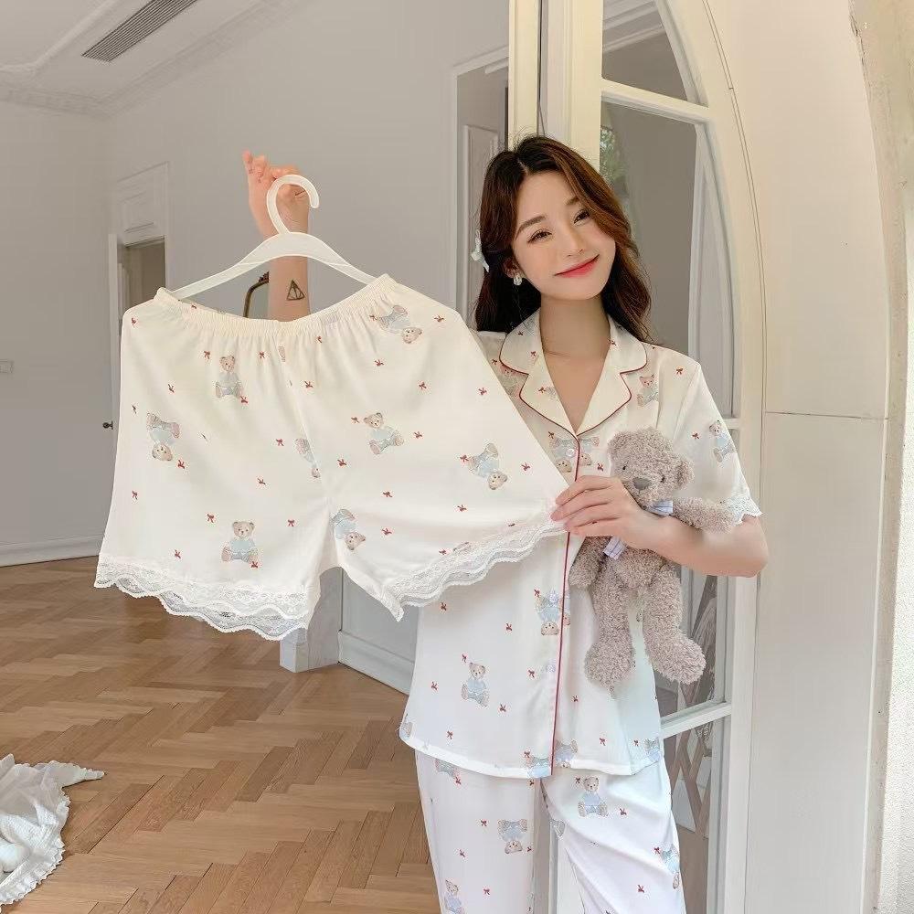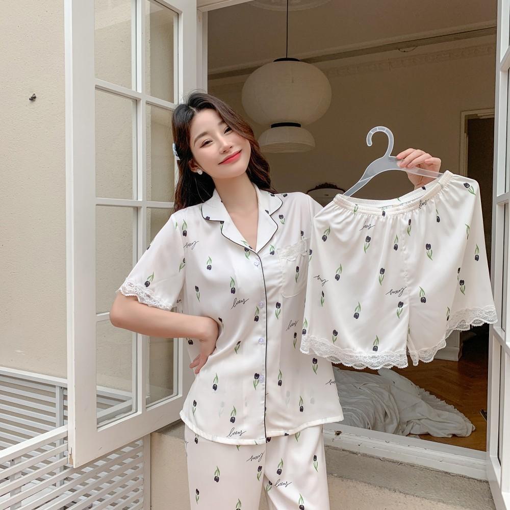 Compra Pijama de Verano de Seda de Hielo para Mujer de Manga Corta con Pantalón Estampado de Ácido Acético Dulce Floral Set de Tres Piezas Estilo Fresco Traje de Ropa para el Hogar al por mayor en Joom.pro