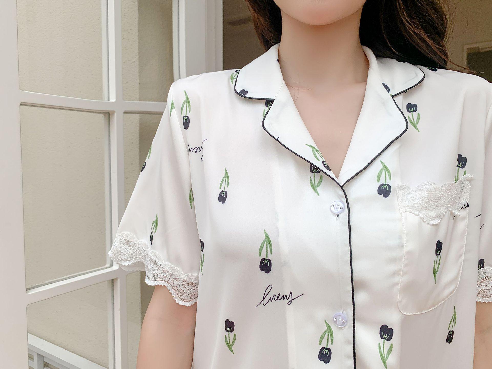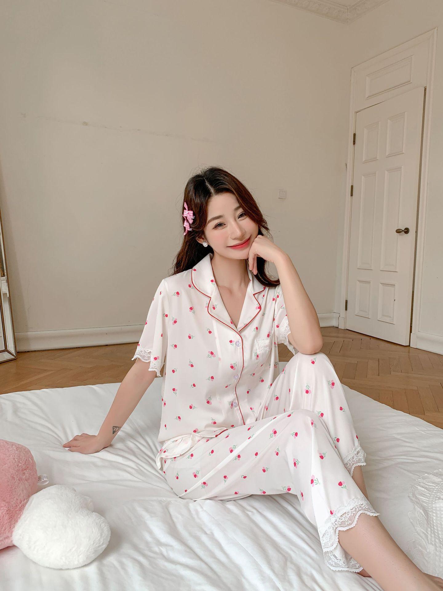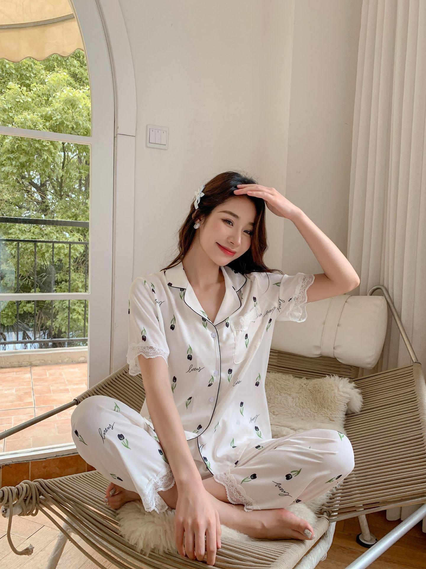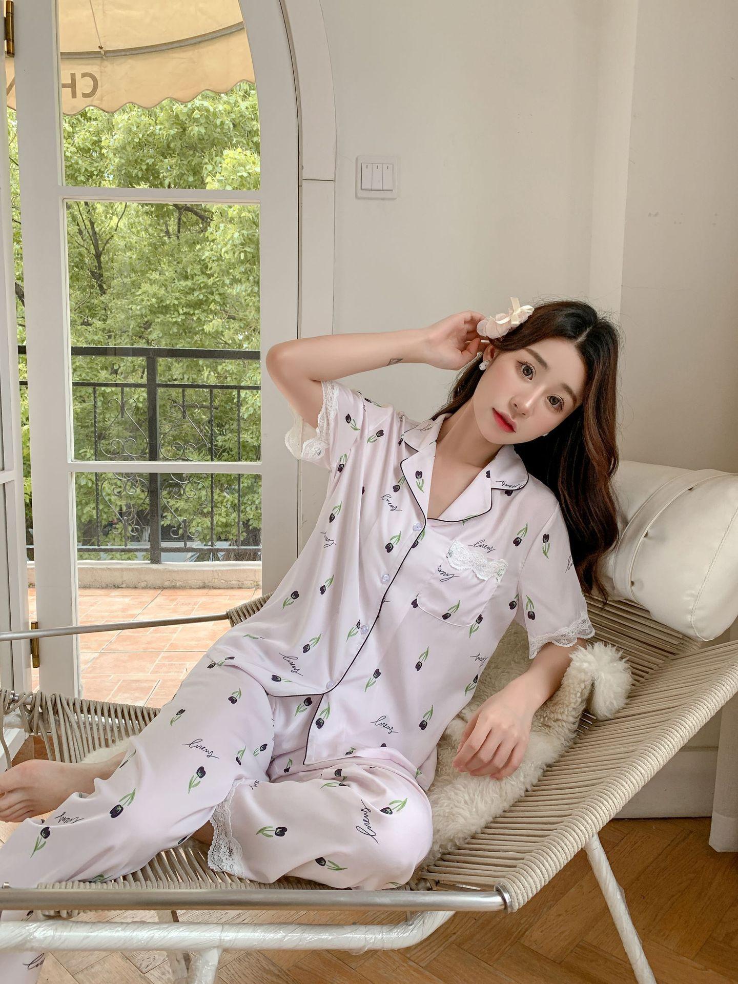 Compra Pijama de Verano de Seda de Hielo para Mujer de Manga Corta con Pantalón Estampado de Ácido Acético Dulce Floral Set de Tres Piezas Estilo Fresco Traje de Ropa para el Hogar al por mayor en Joom.pro
