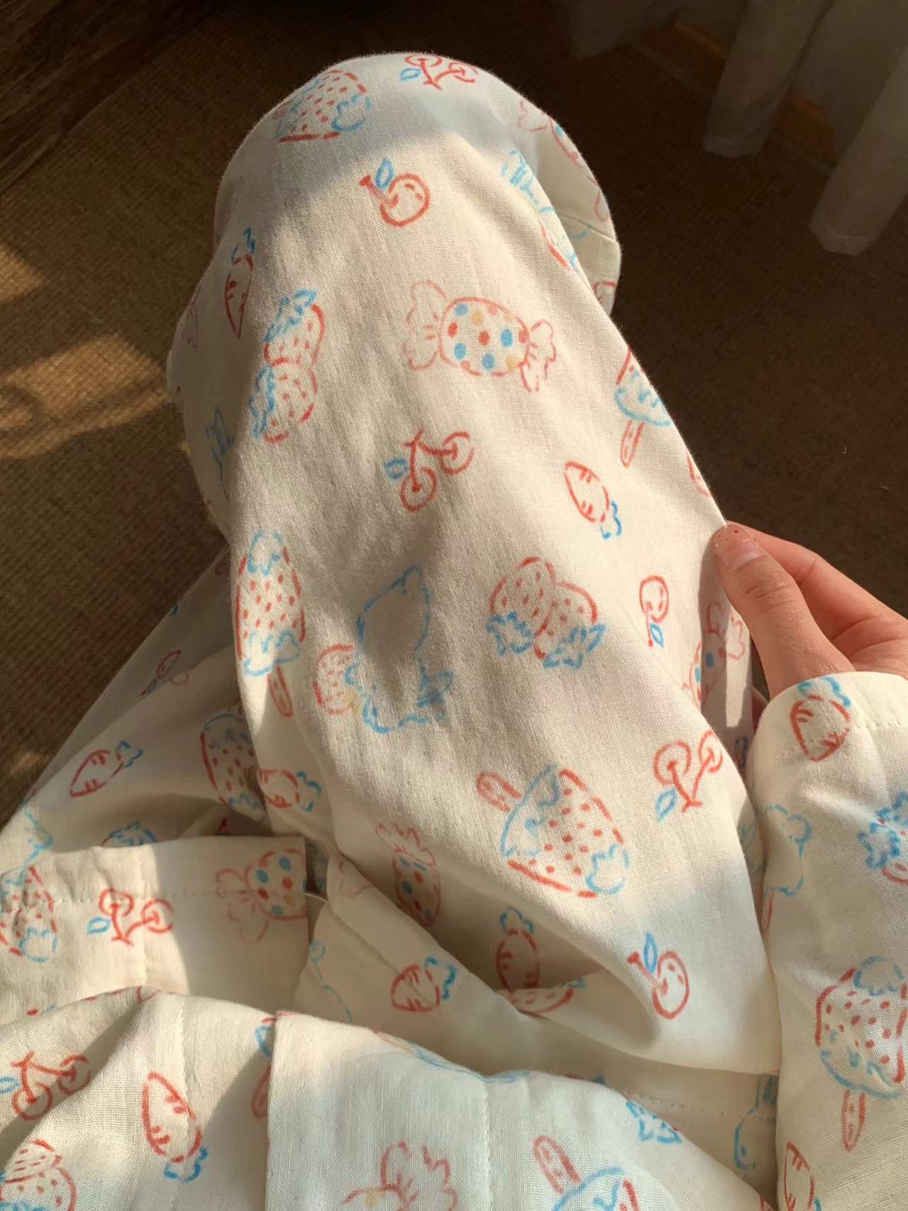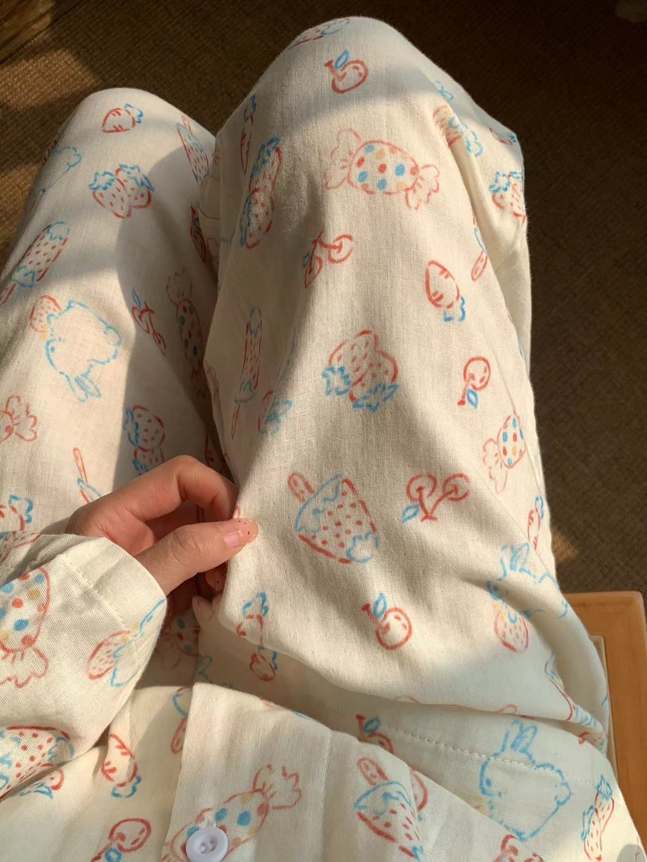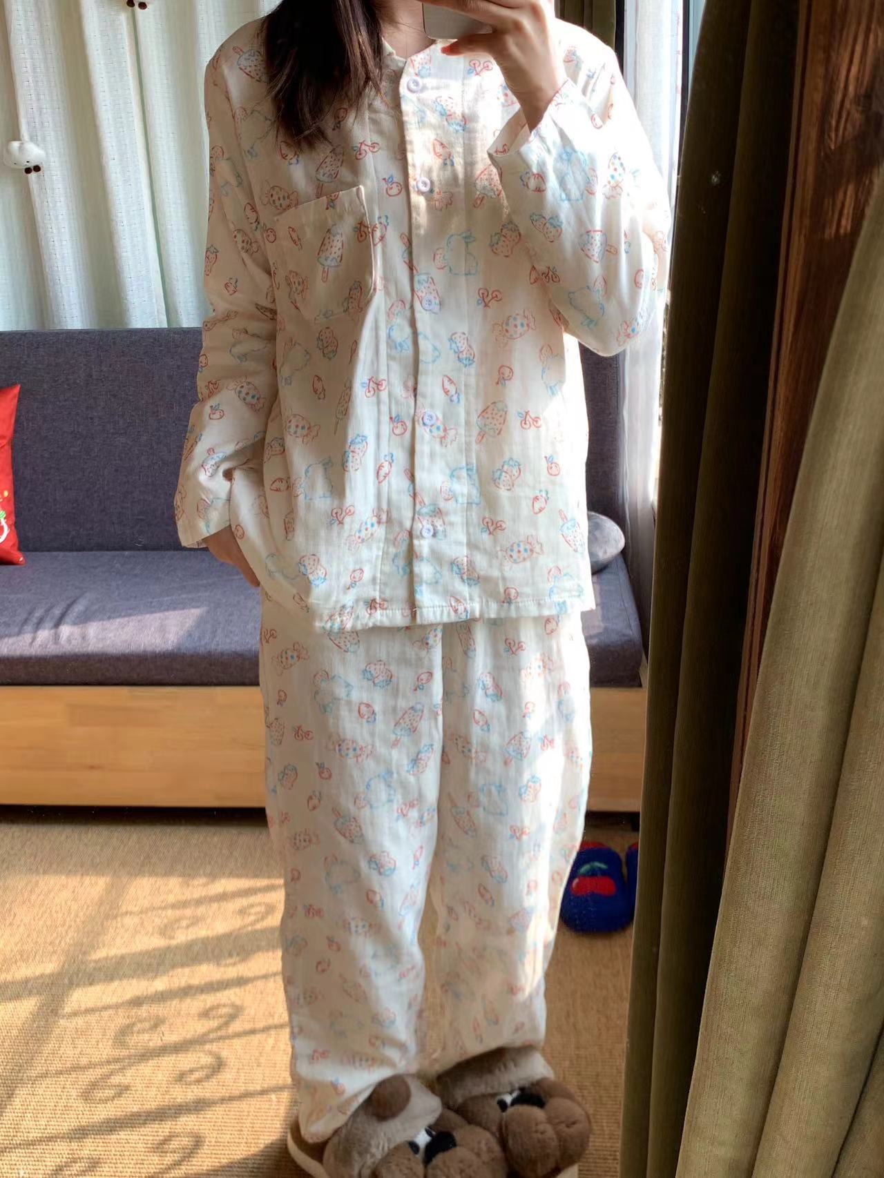 ¡Lo nuevo! Pijama de algodón de doble gasa de clase A con solapa de conejito de fresa y caramelo, bonito para usar en casa