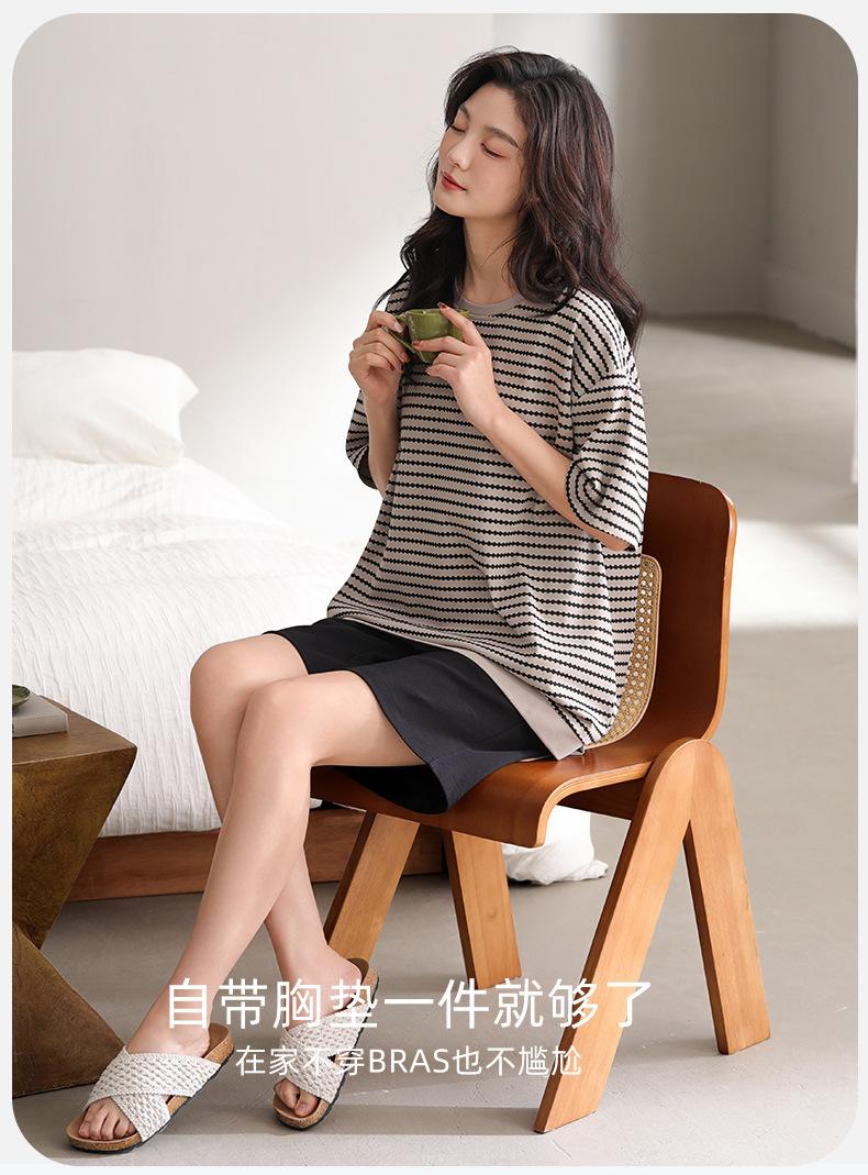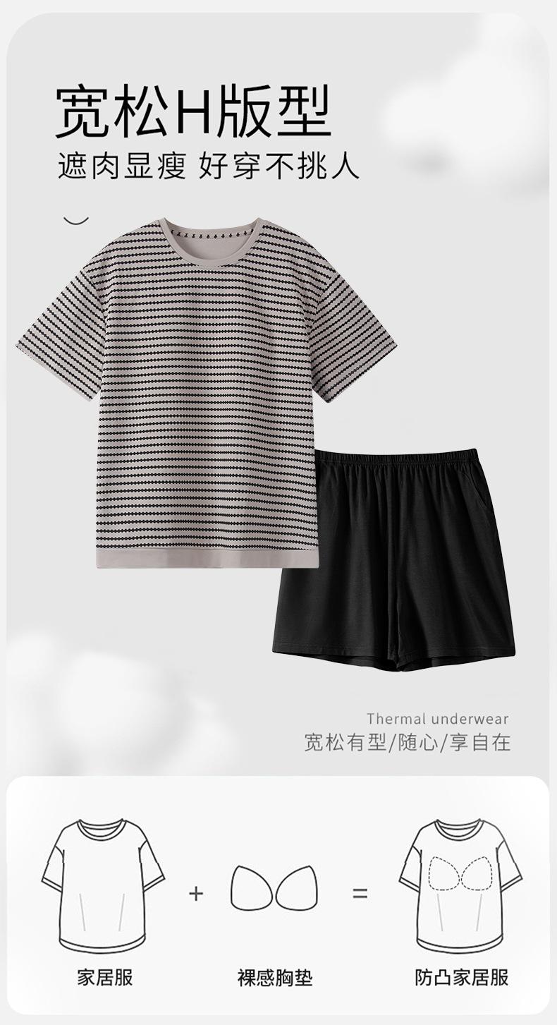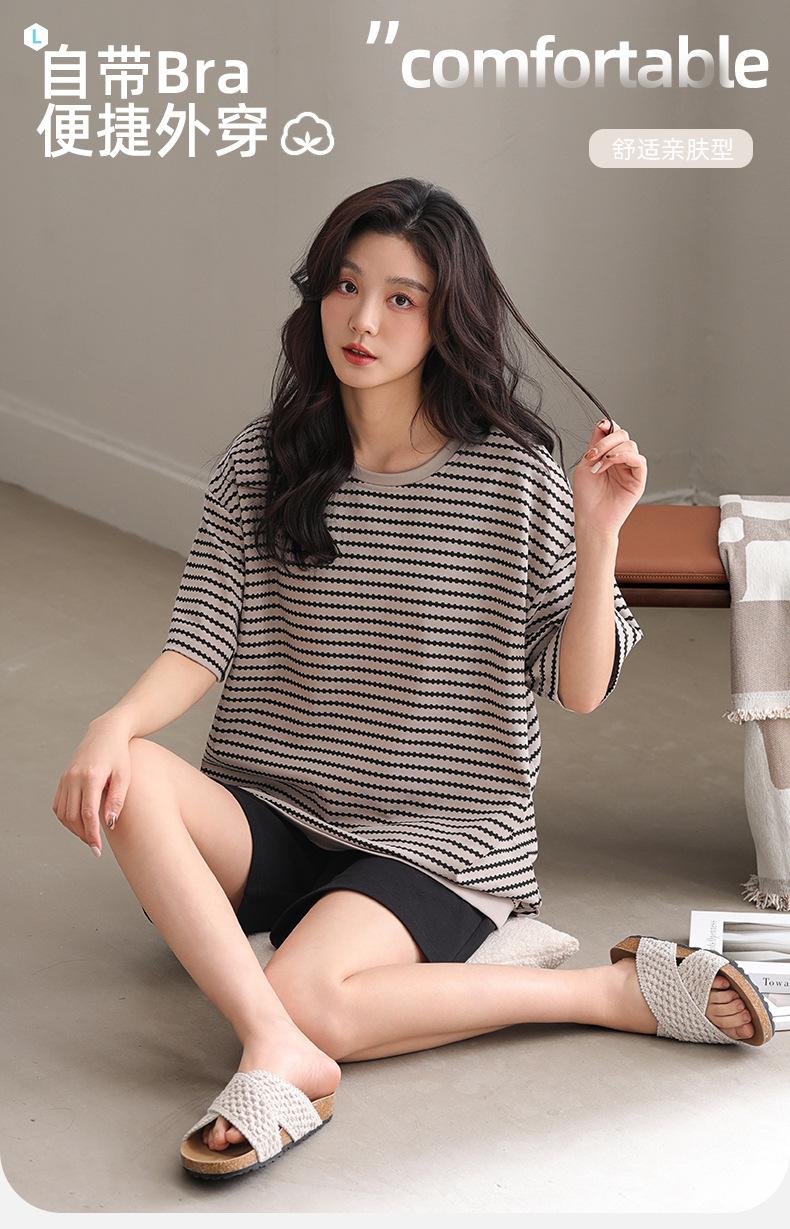 Primavera y Otoño Modal Fresco Ropa de Mujer Diadema Almohadilla para el Pecho Manga Corta Ropa para el Hogar Nuevo Estilo Ropa Exterior Traje a Rayas