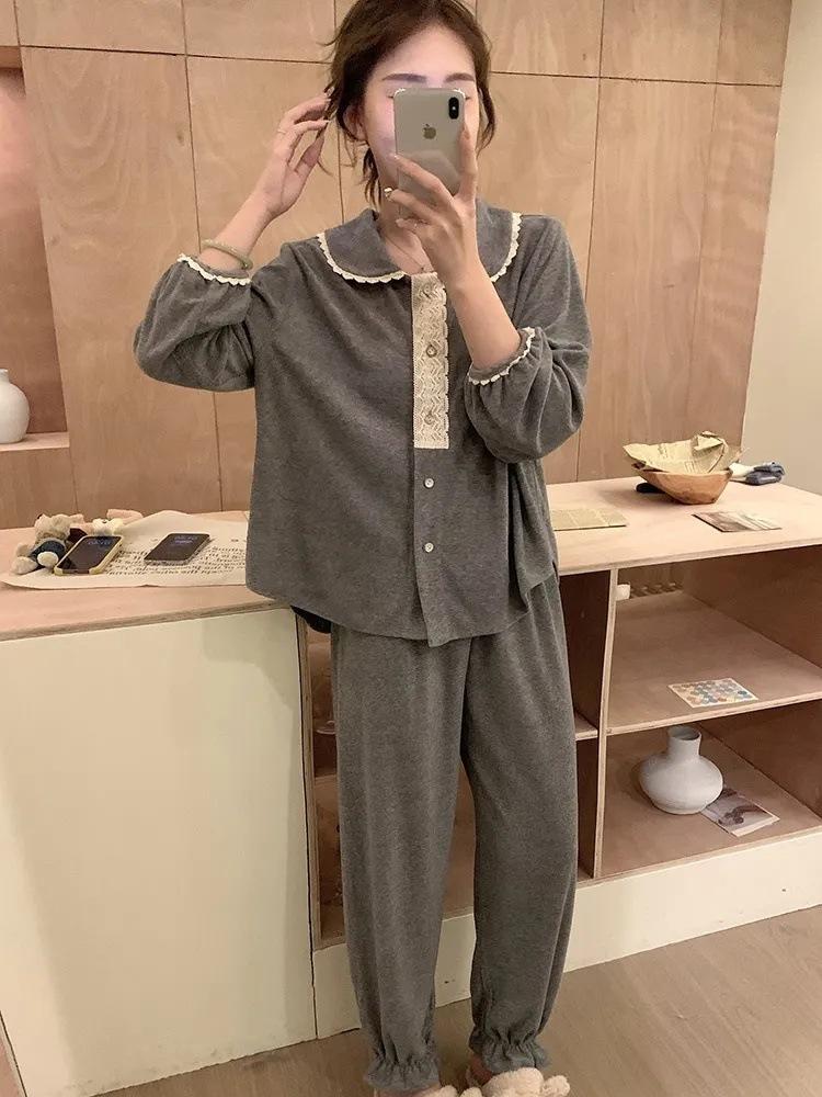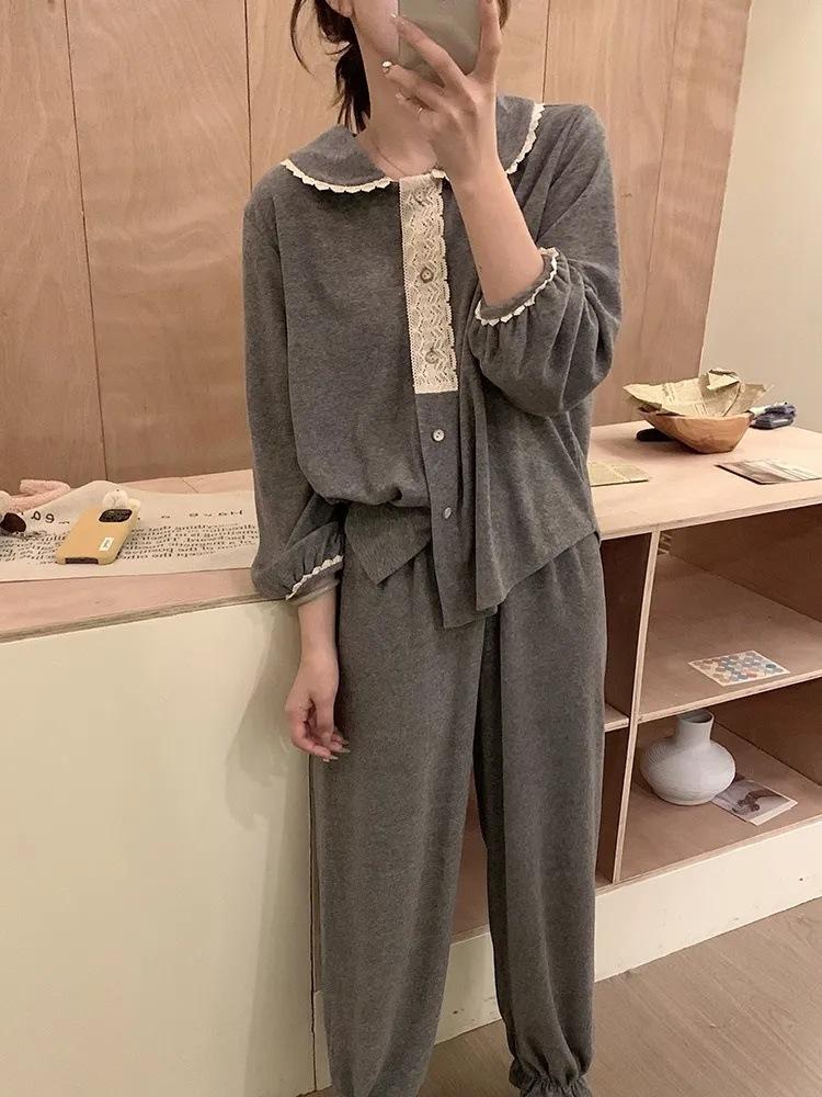 Pijamas de manga larga de encaje estilo coreano para mujer, otoño e invierno, bonitos y bonitos, con cuello de muñeca, ropa de casa para estudiantes y niñas.