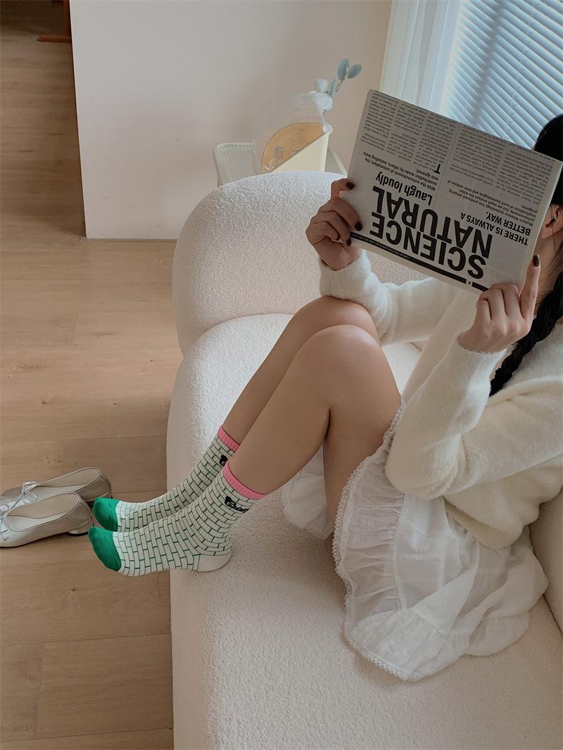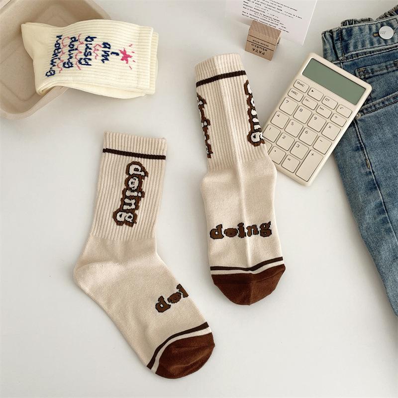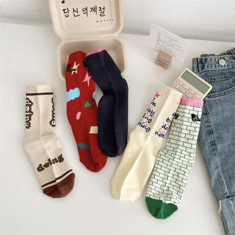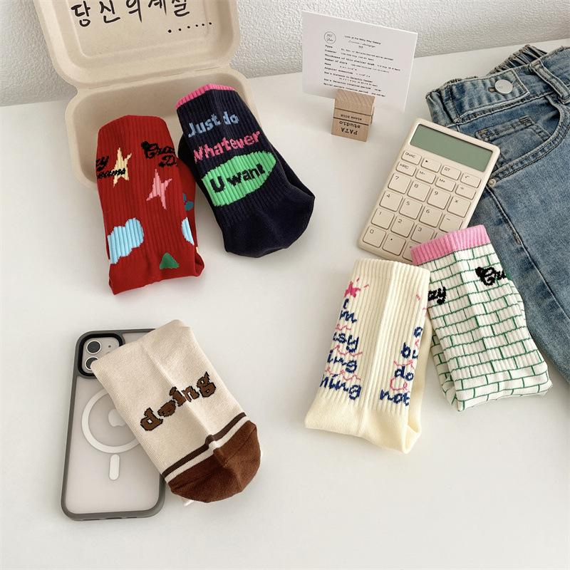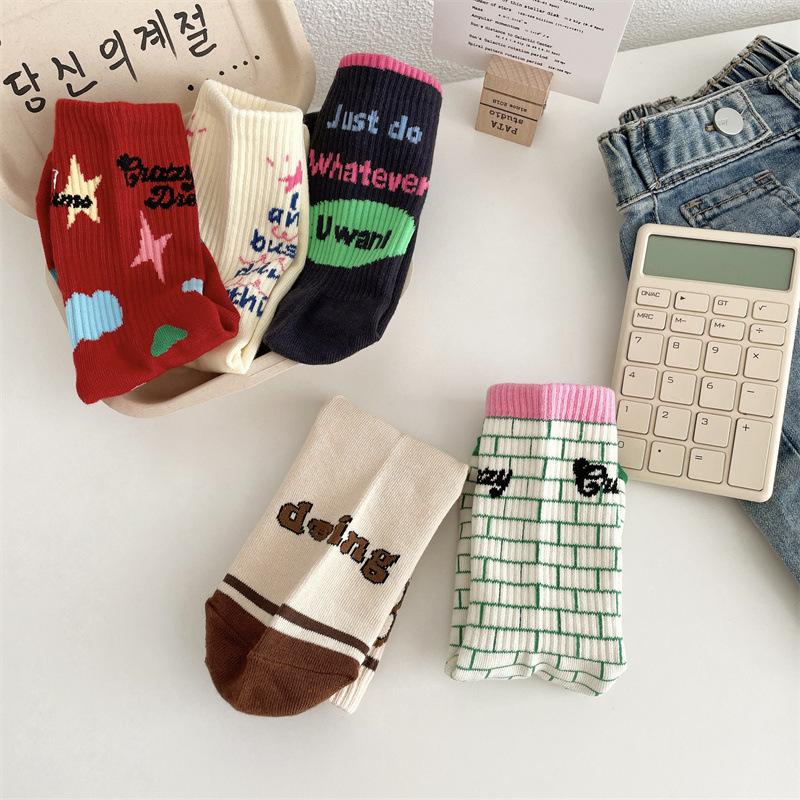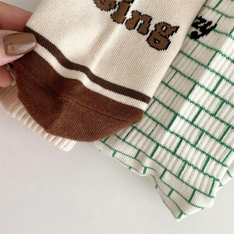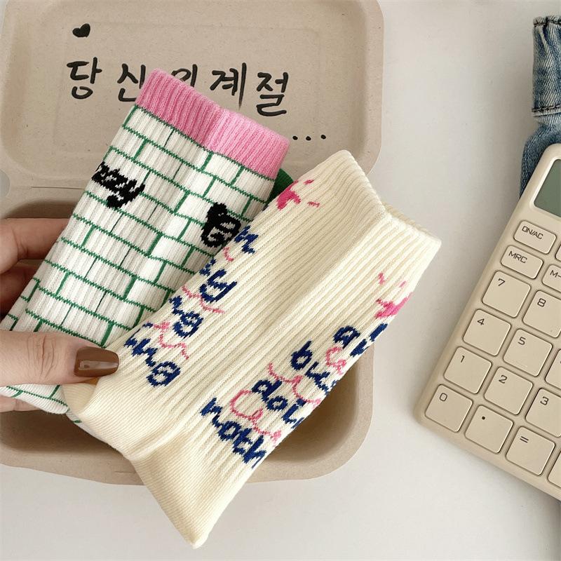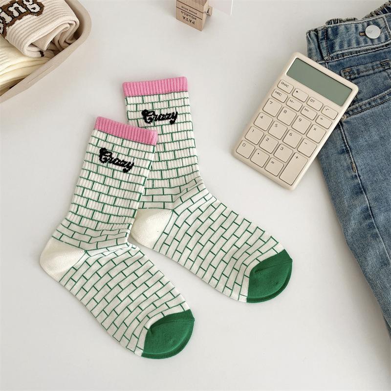 Calcetines de algodón a cuadros para hombre y mujer, nuevos calcetines deportivos de media pantorrilla con letras y costuras de color, de otoño e invierno, a la moda.
