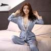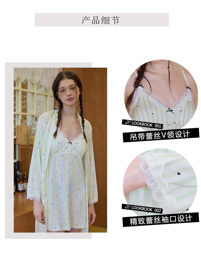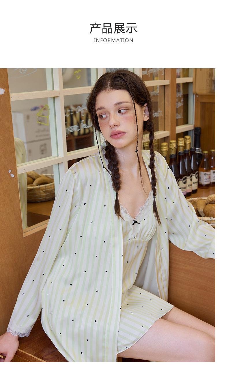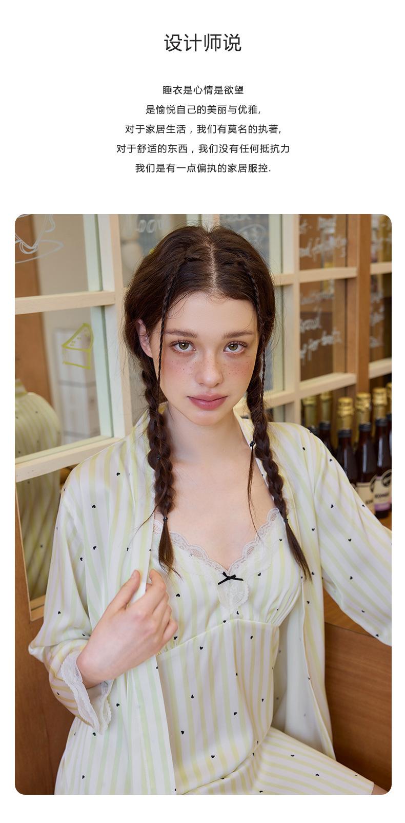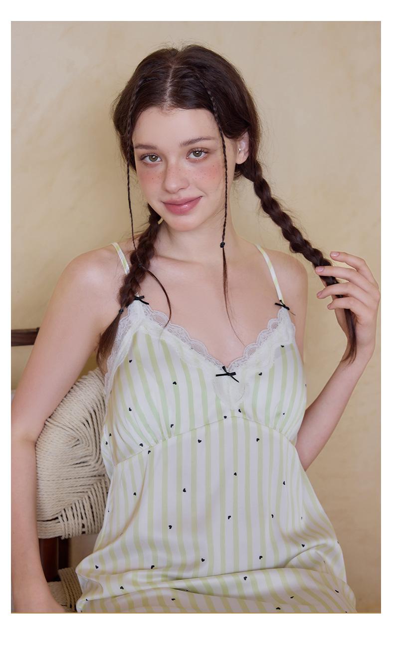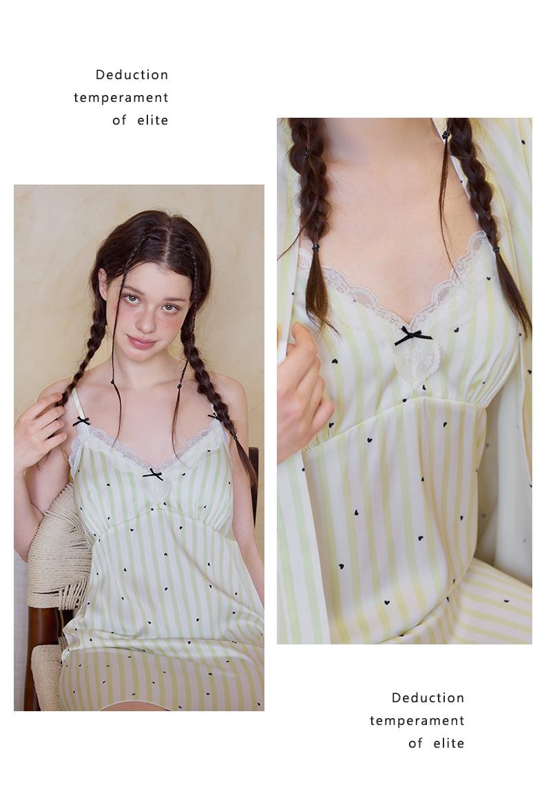 Camisón de Encaje Rayado de Seda de Hielo Tirantes Conjunto de Dos Piezas Pijama de Seda Simulada Ropa de Casa para Mujer Verano con Almohadilla para el Pecho