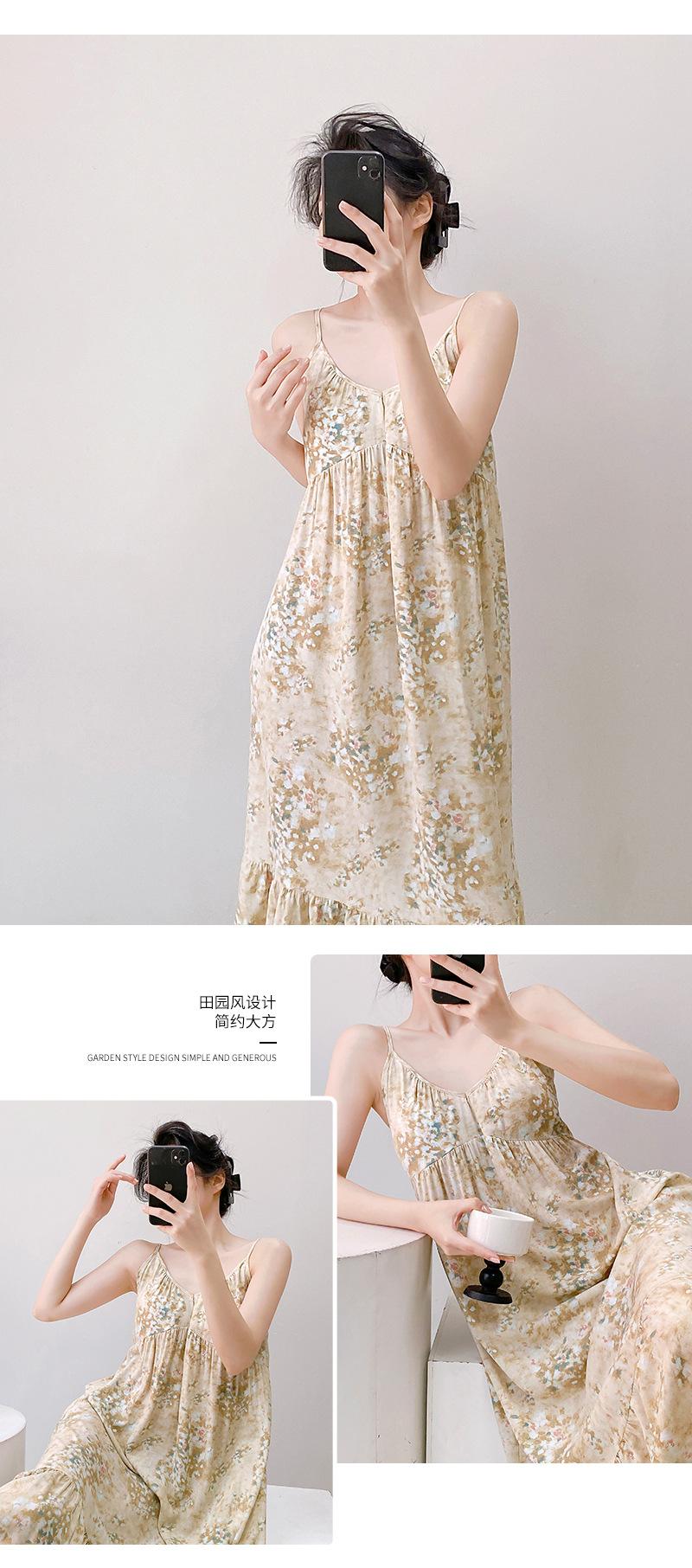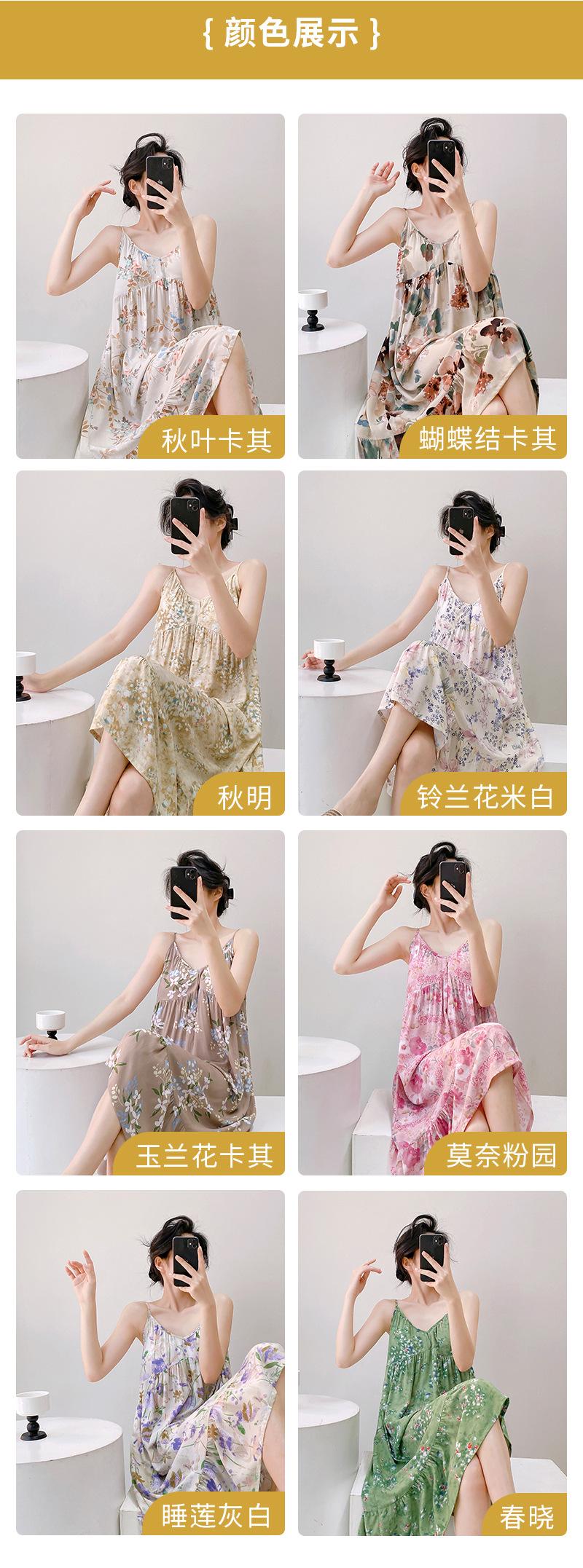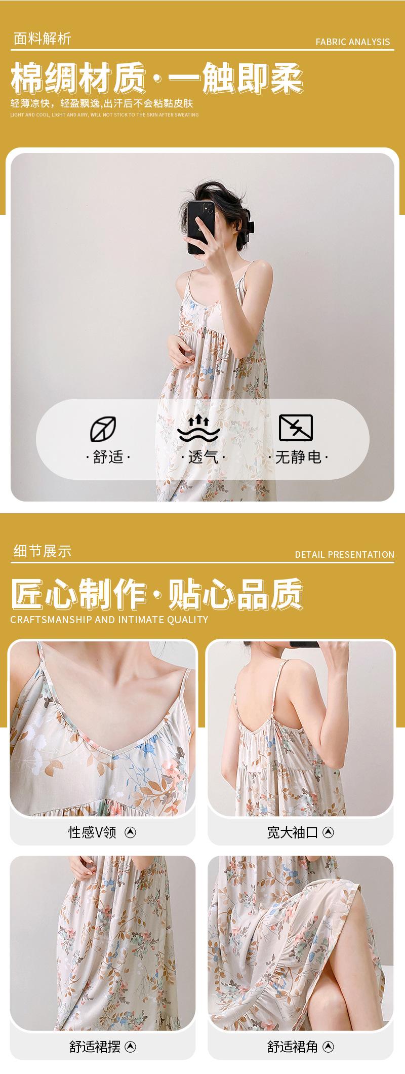 Camisón de Verano de Algodón Seda con Tirantes Casual Nuevo Largo Medio Dulce Estampado para Casa Primavera y Otoño Camisón Delgado