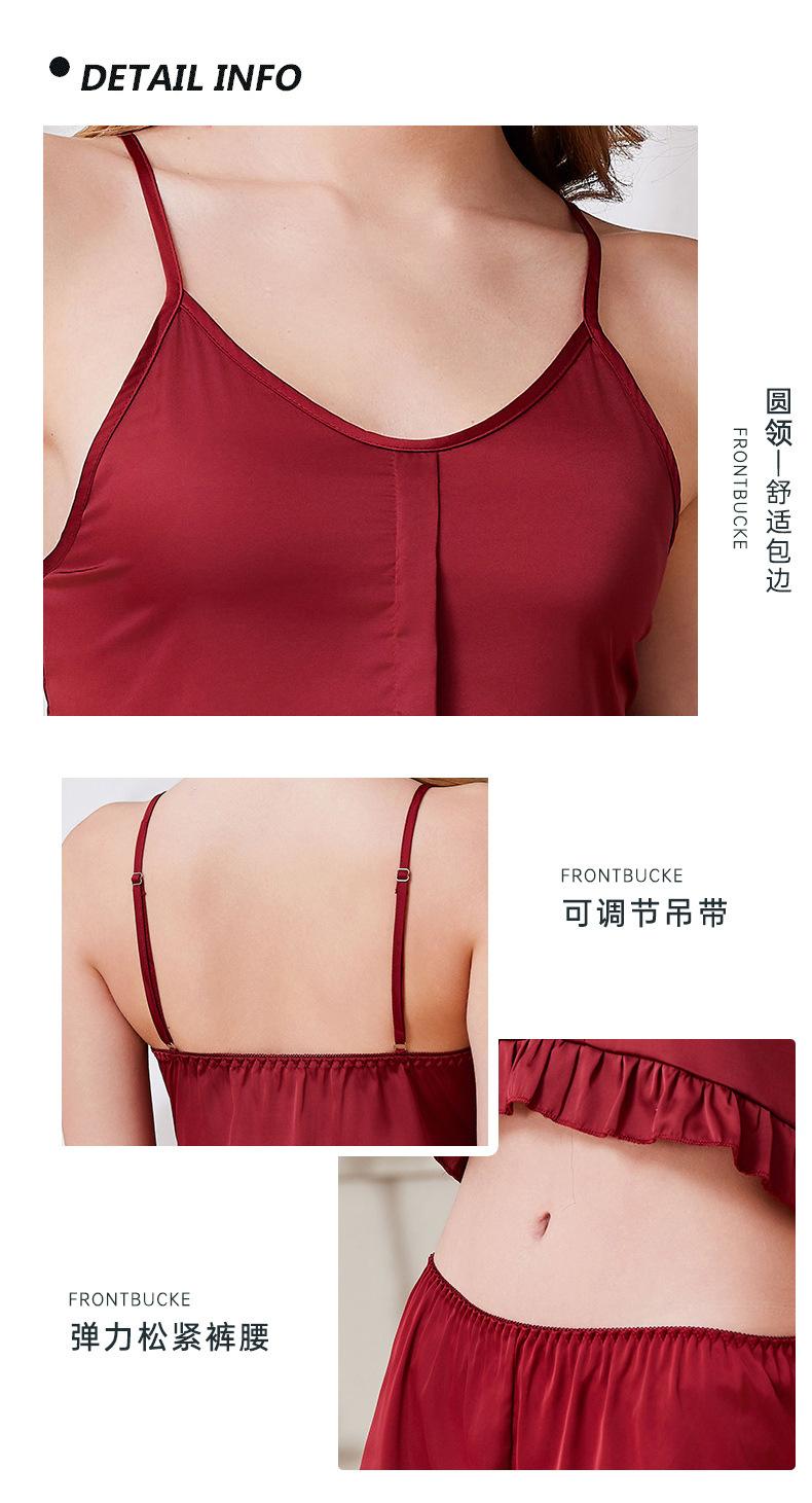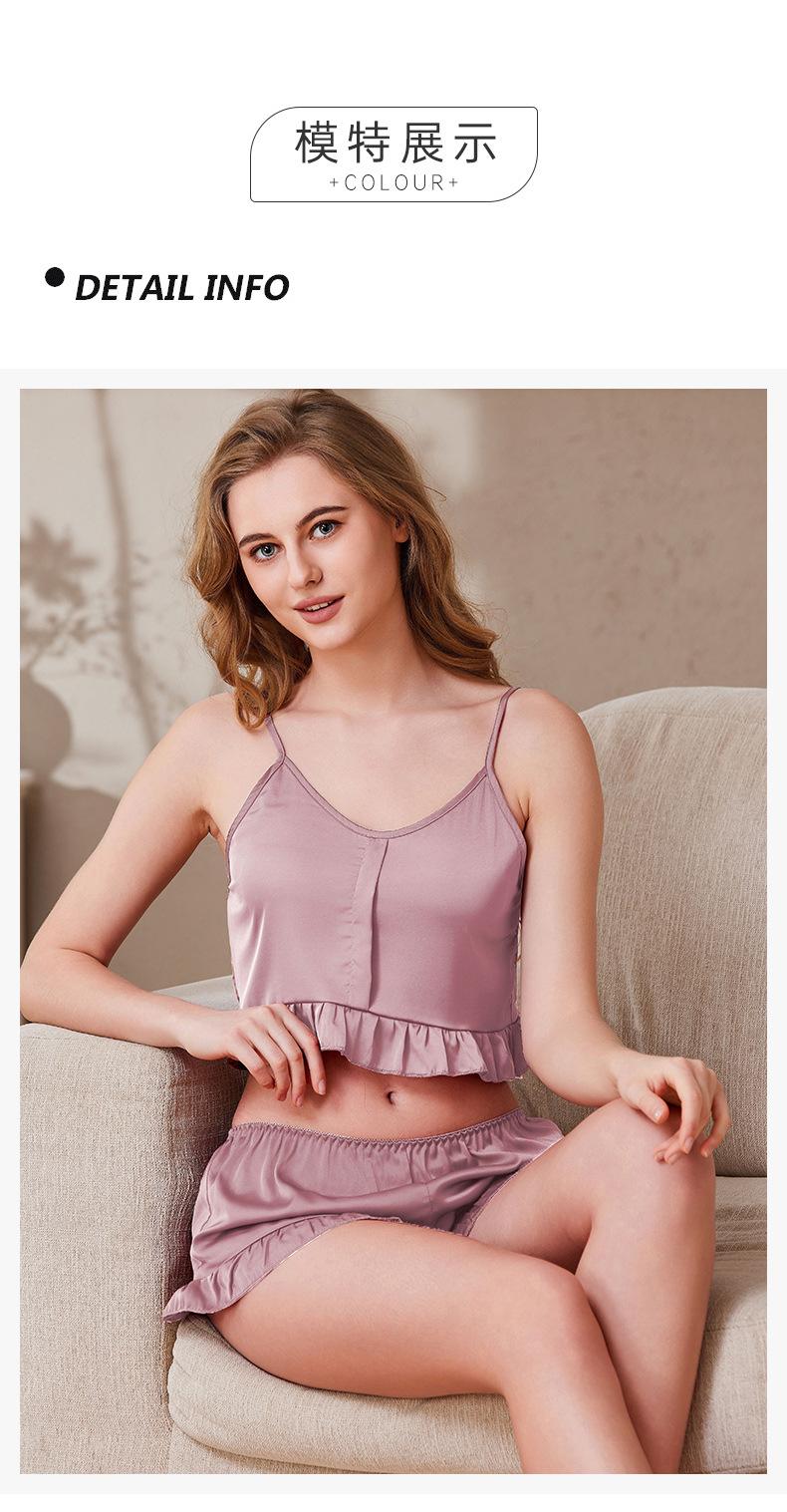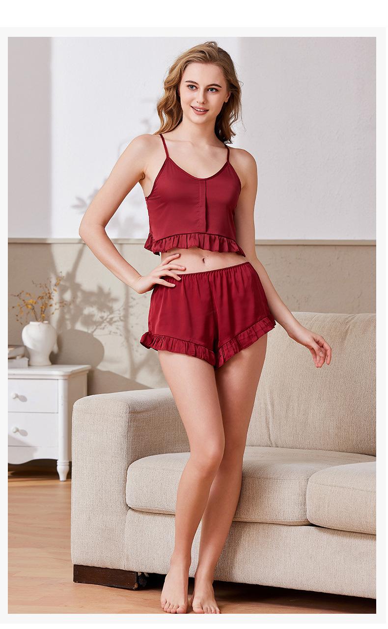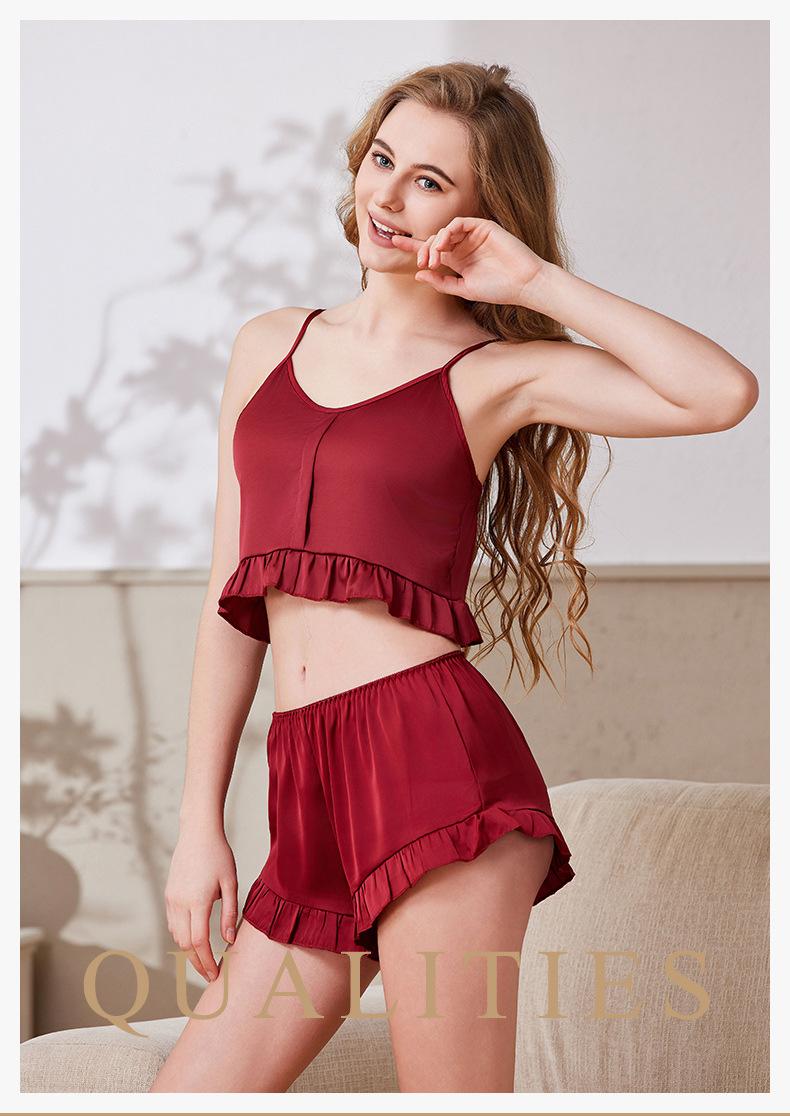 Pijamas de gran venta europeos y americanos para mujer, pantalones cortos sexis con tirantes, pijamas de dos piezas, traje de mujer, color sólido, seda helada, fresco