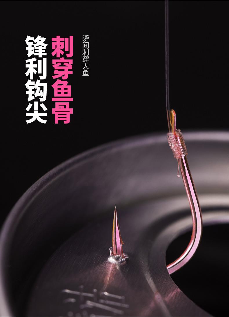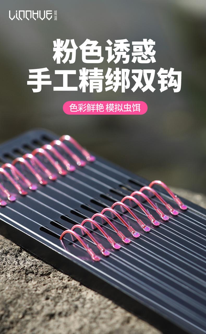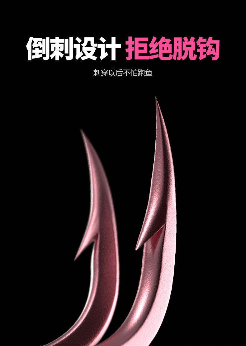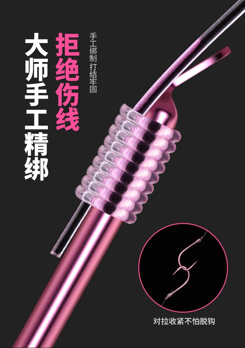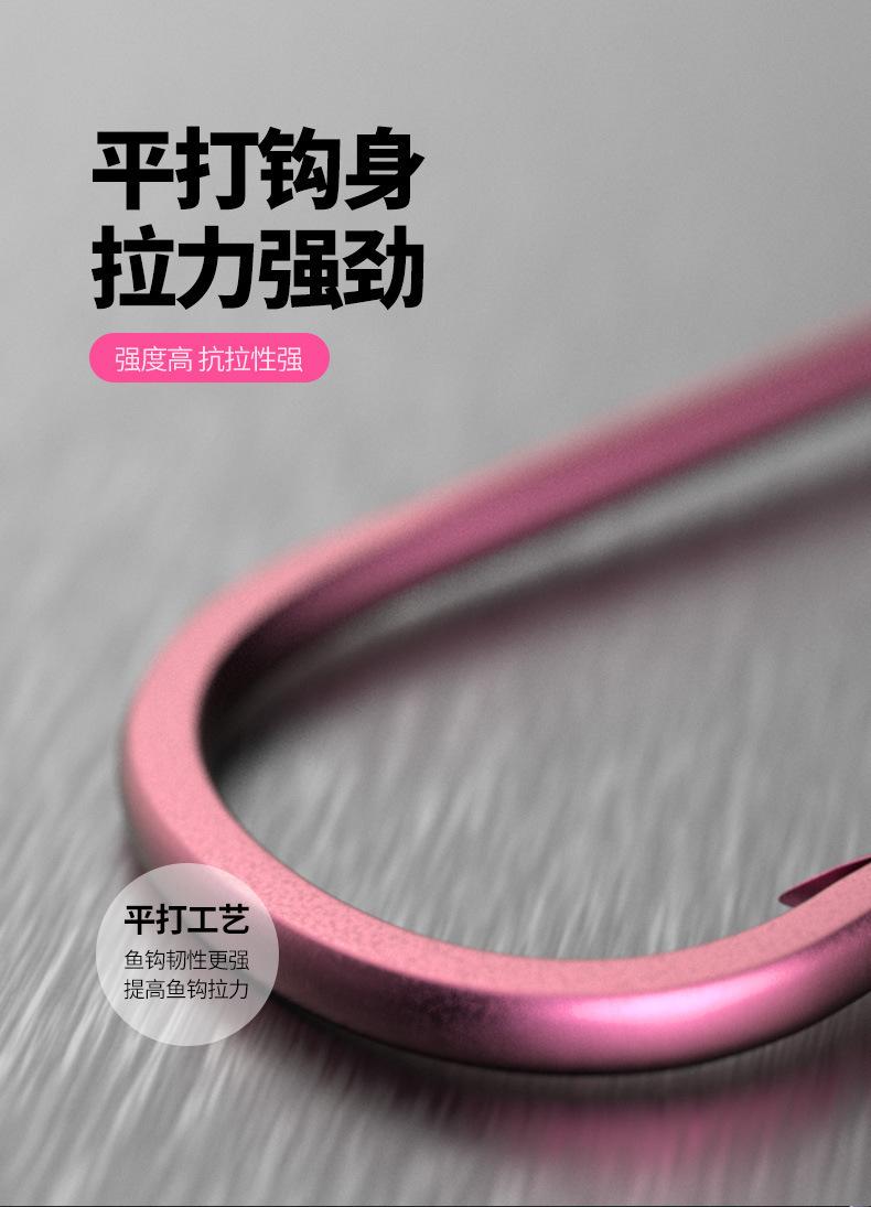 Características del producto: tentación rosa, atado a mano, punta de anzuelo afilada, diseño de rebaba de anzuelo, cuerpo de anzuelo plano, fuerte fuerza de tracción.