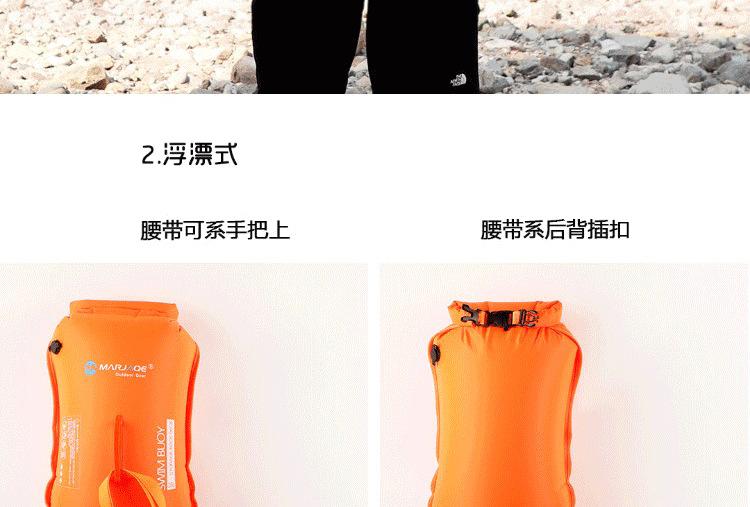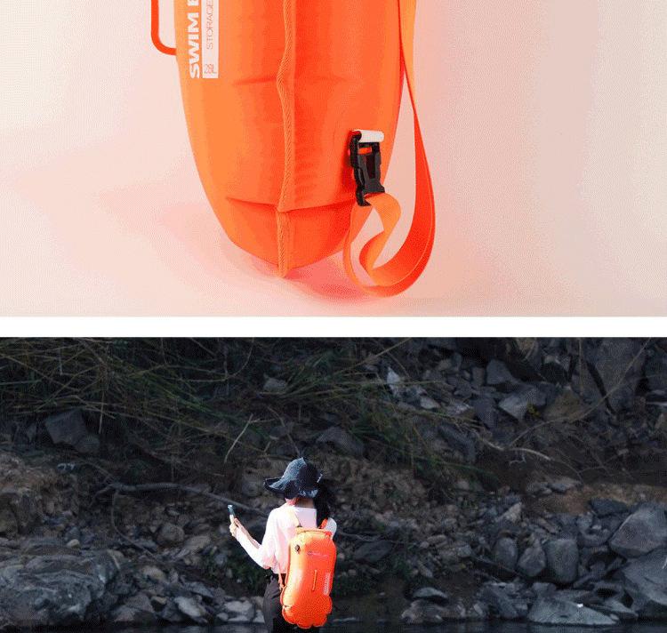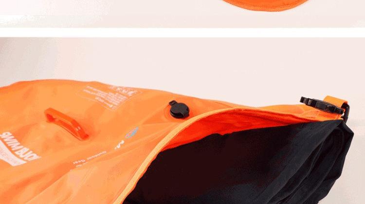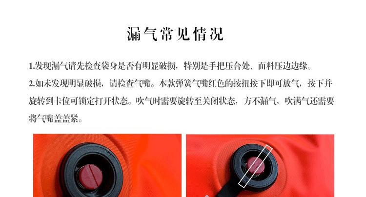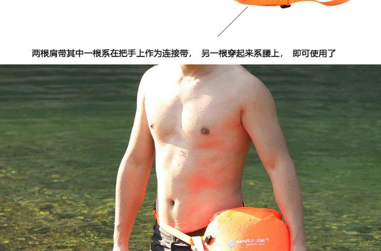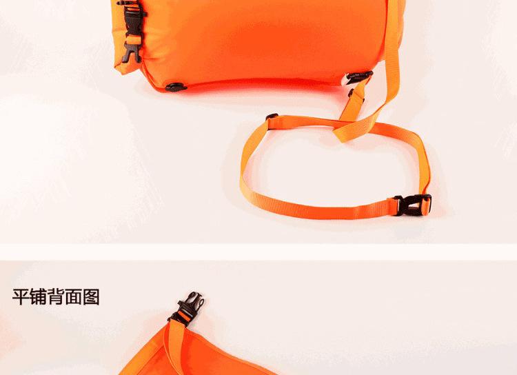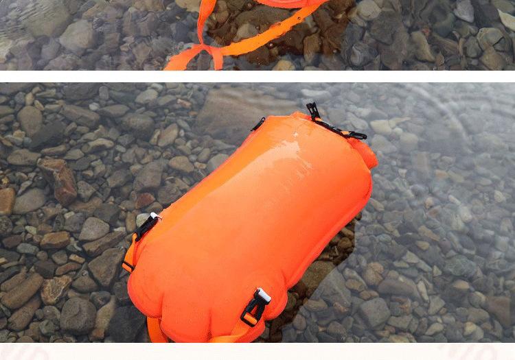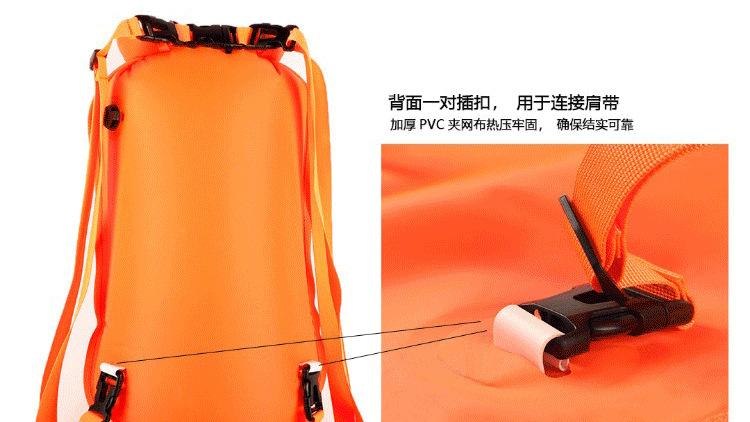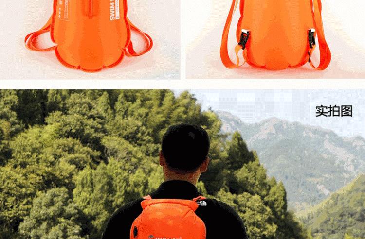Características del producto: La mochila es adecuada para propósitos impermeables como playas, campamentos y rafting. La correa para el hombro se convierte en un cinturón de cintura, y cuando se infla, se convierte en un flotador de natación estándar. Las bolsas de aire dobles son más seguras. Cuando estás cansado de nadar, puedes usar la flotabilidad del flotador para descansar, y al mismo tiempo recordar a las personas y barcos que pasan que lo eviten.