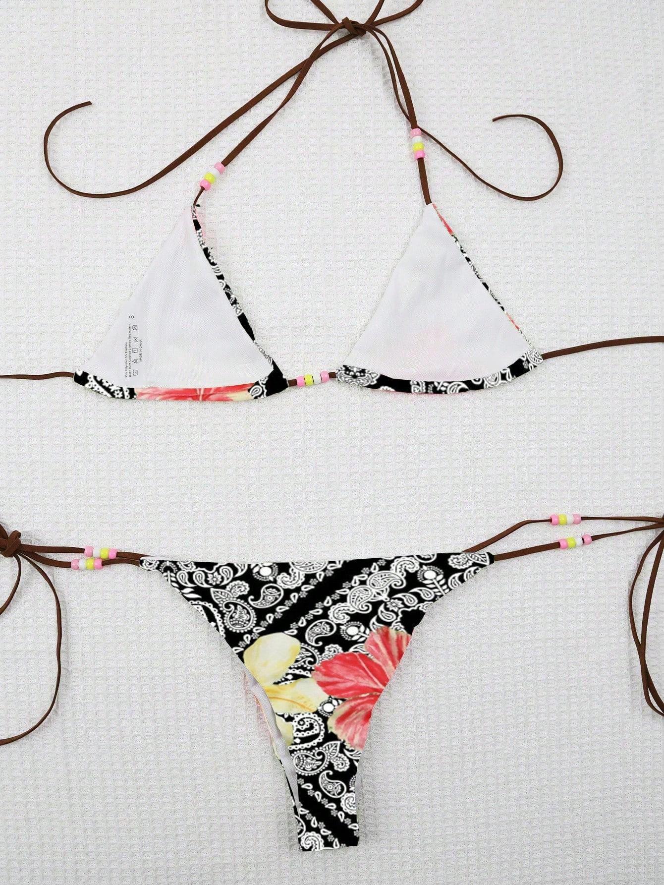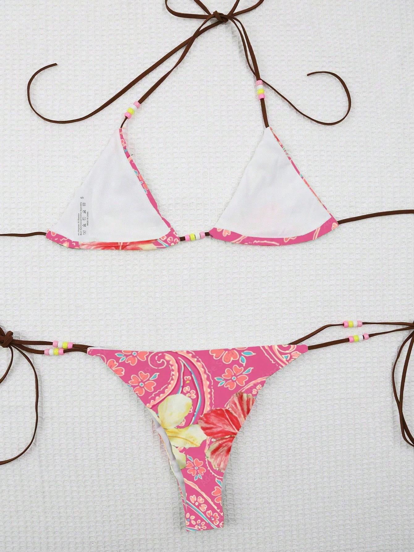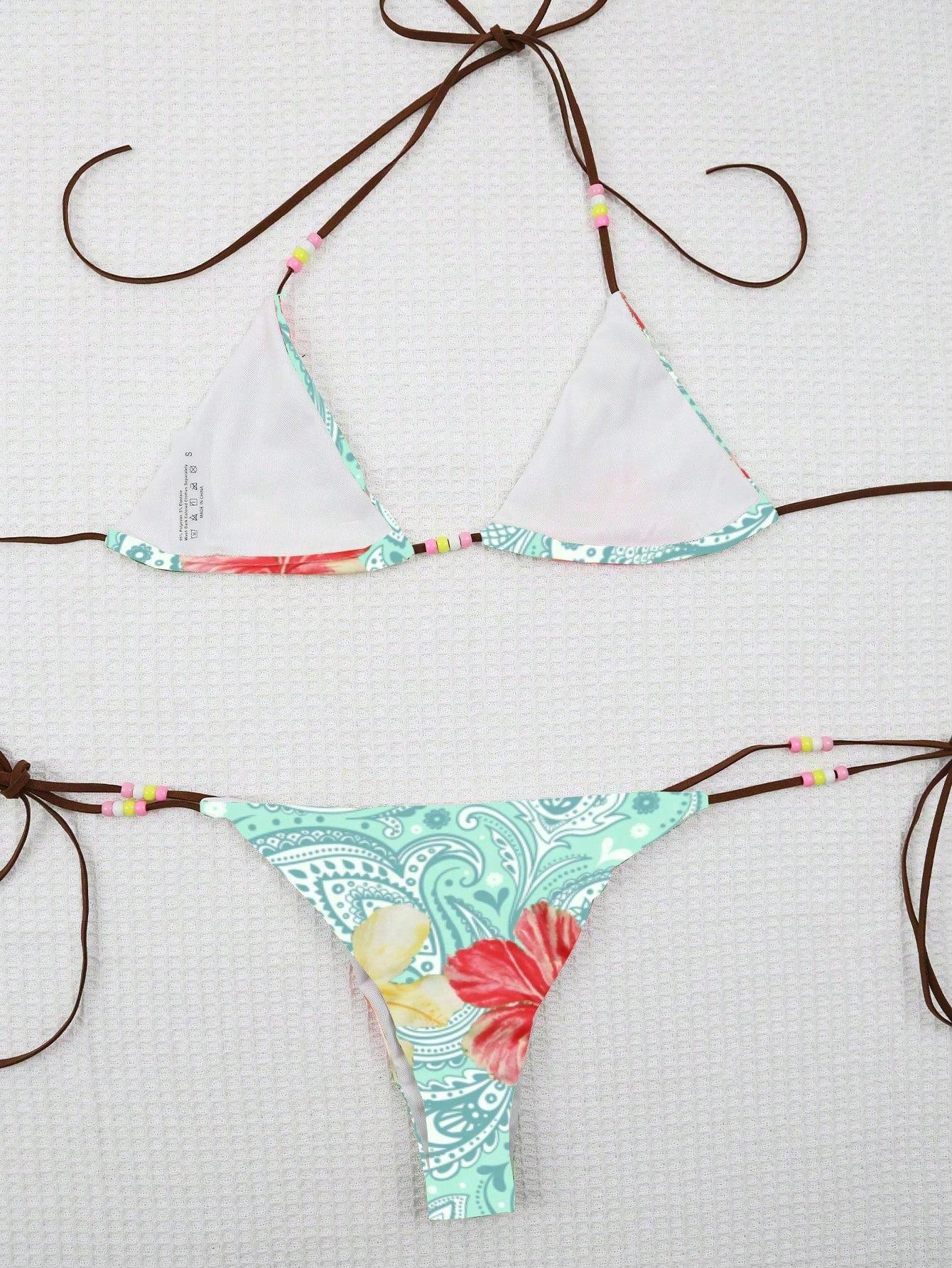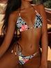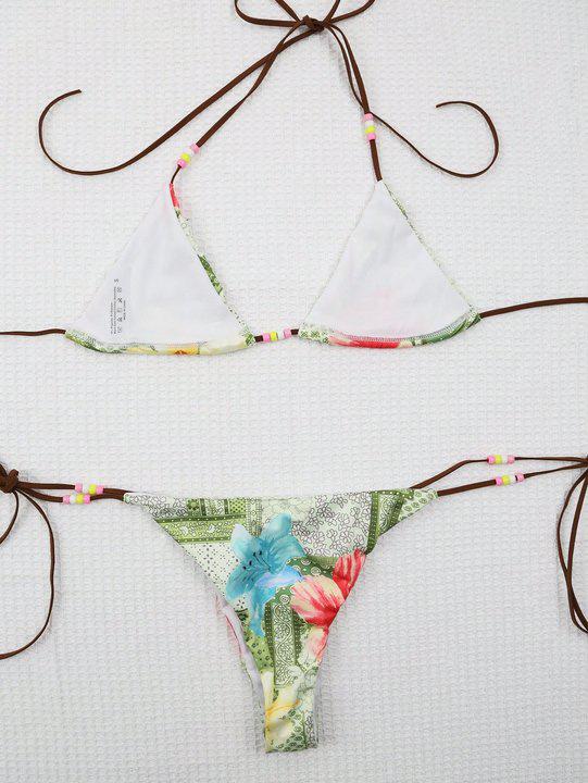 Traje de Baño Dividido de Exportación Europeo y Americano Estampado Floral Colorido Abalorios Empalmados Bikini Triángulo con Halter de Encaje con Cordones