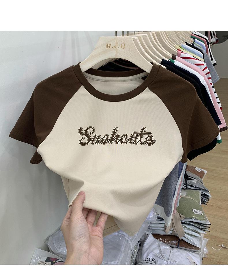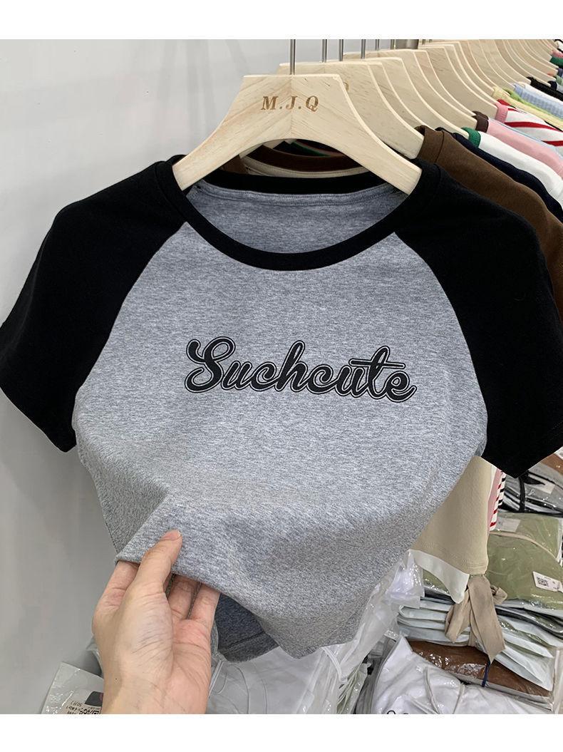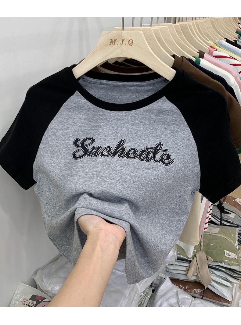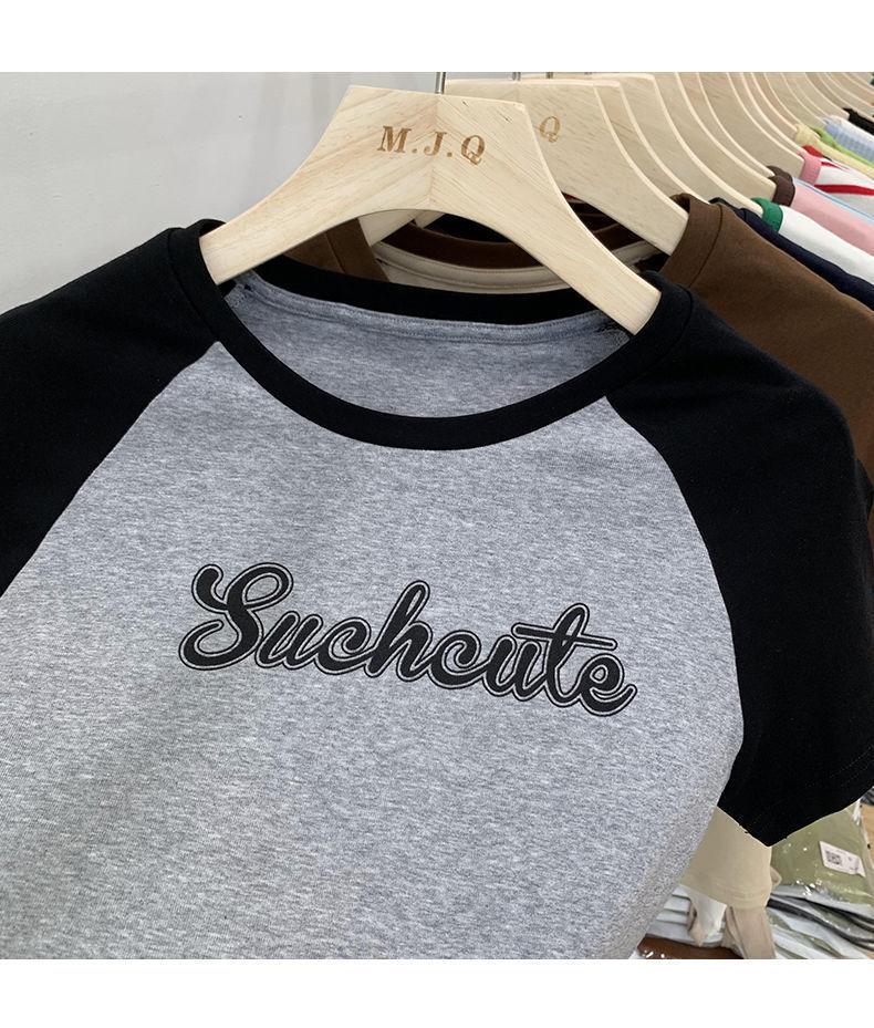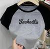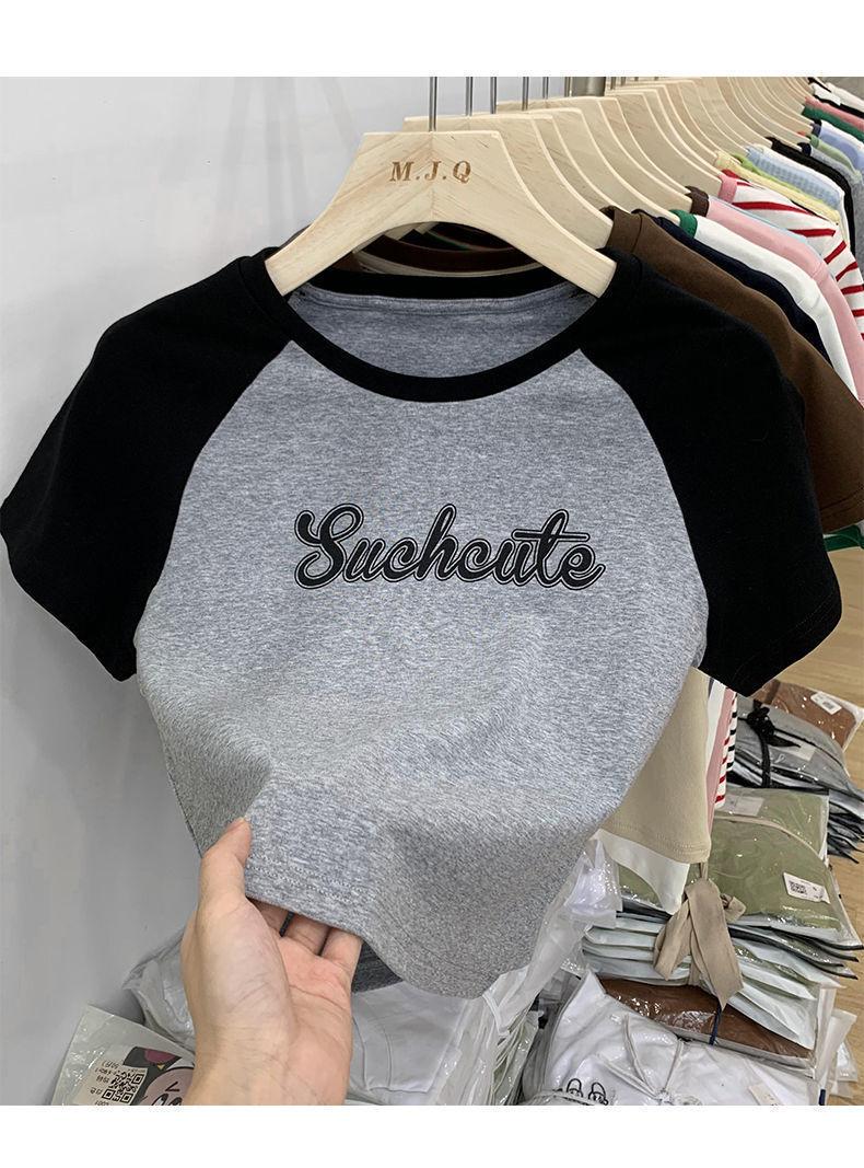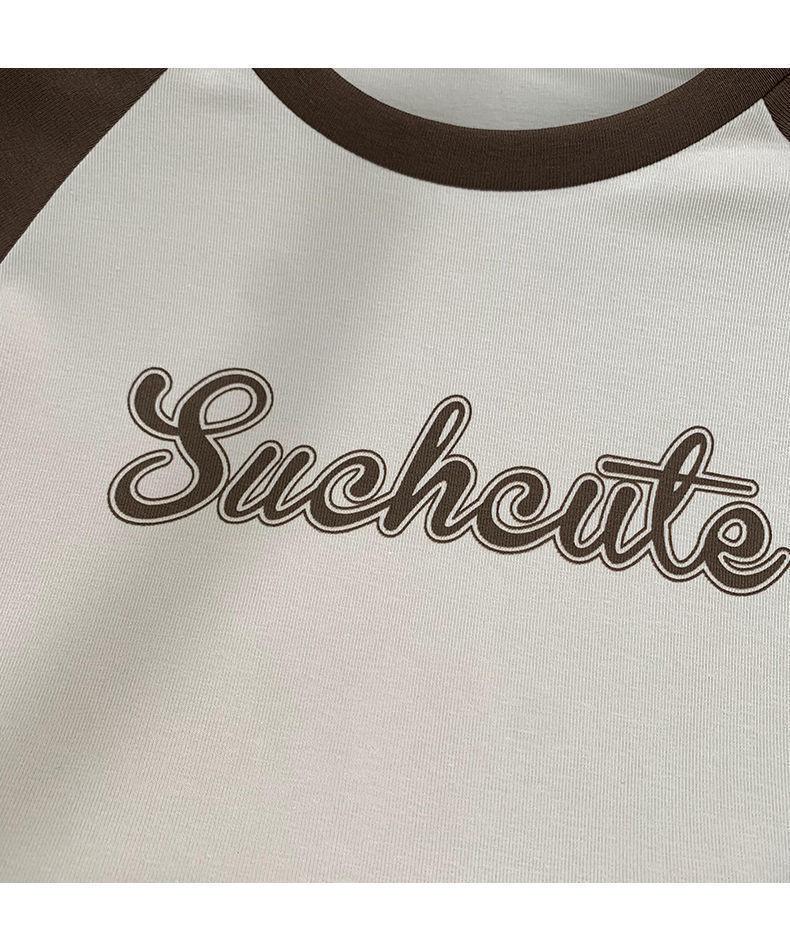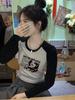 Camiseta de manga larga con letras de chica caliente americana para mujer, manga raglán, combinación de colores, corta para usar debajo, jersey de cuello redondo, top de comercio exterior al por mayor