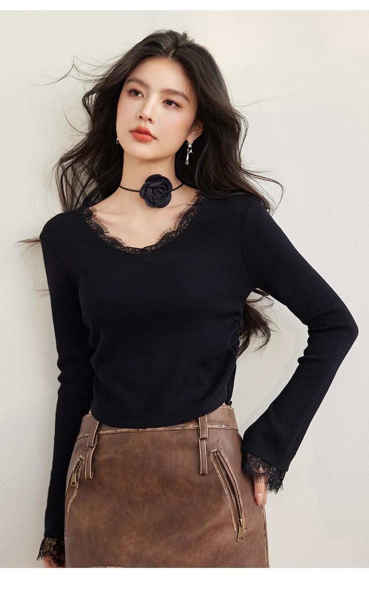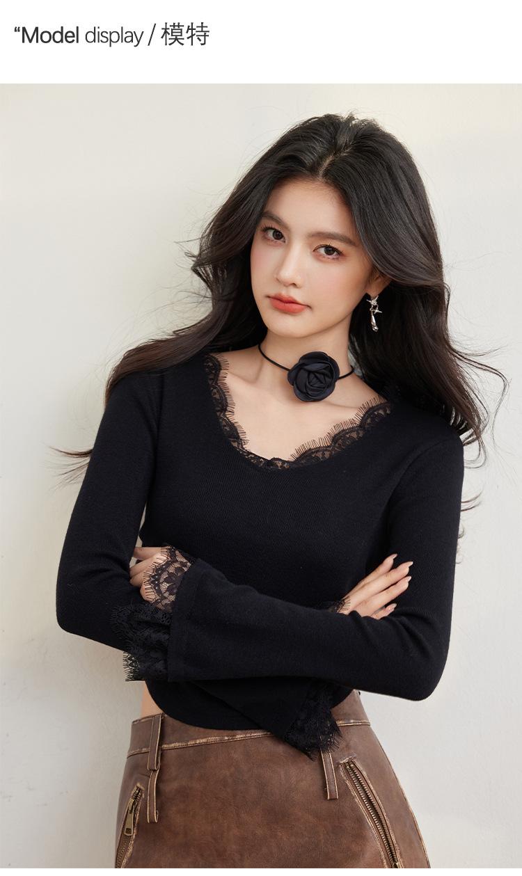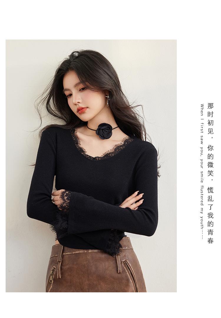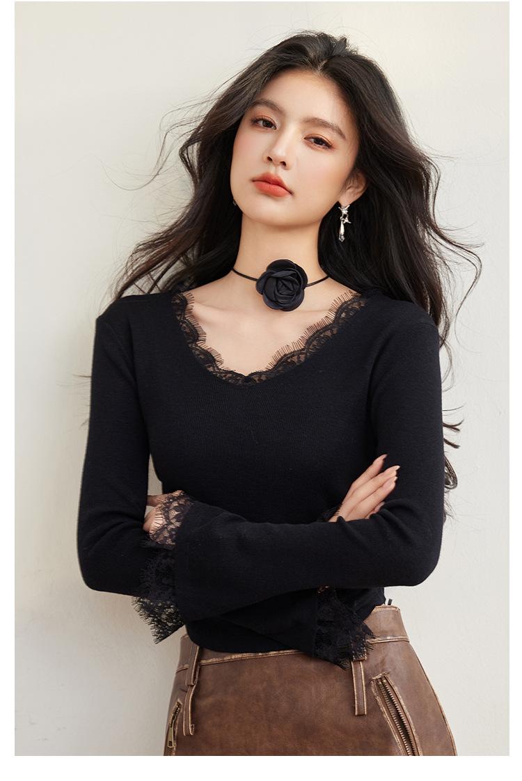 Jersey elegante de punto de manga larga con cuello en V y encaje francés para mujer, estilo primavera 2025