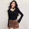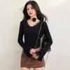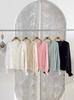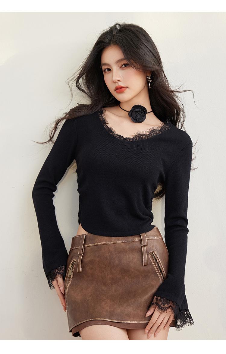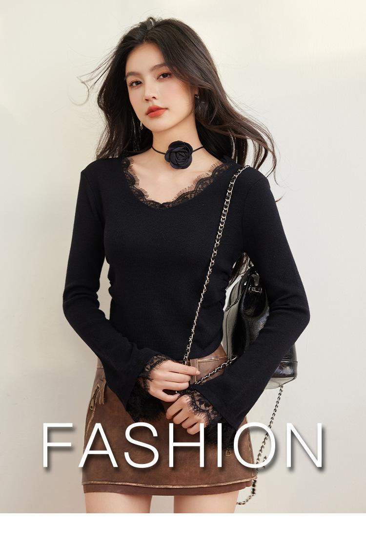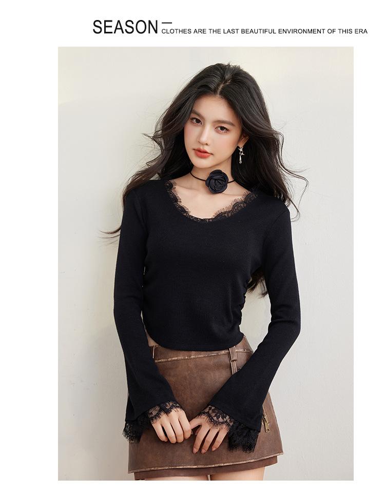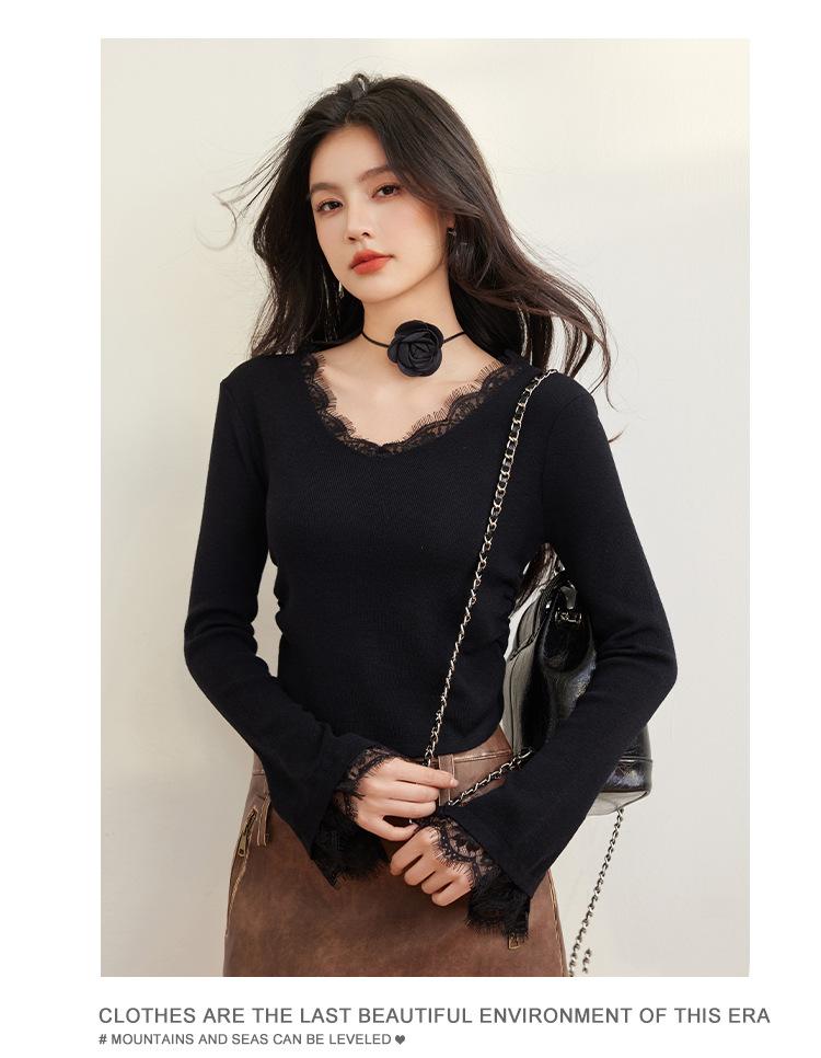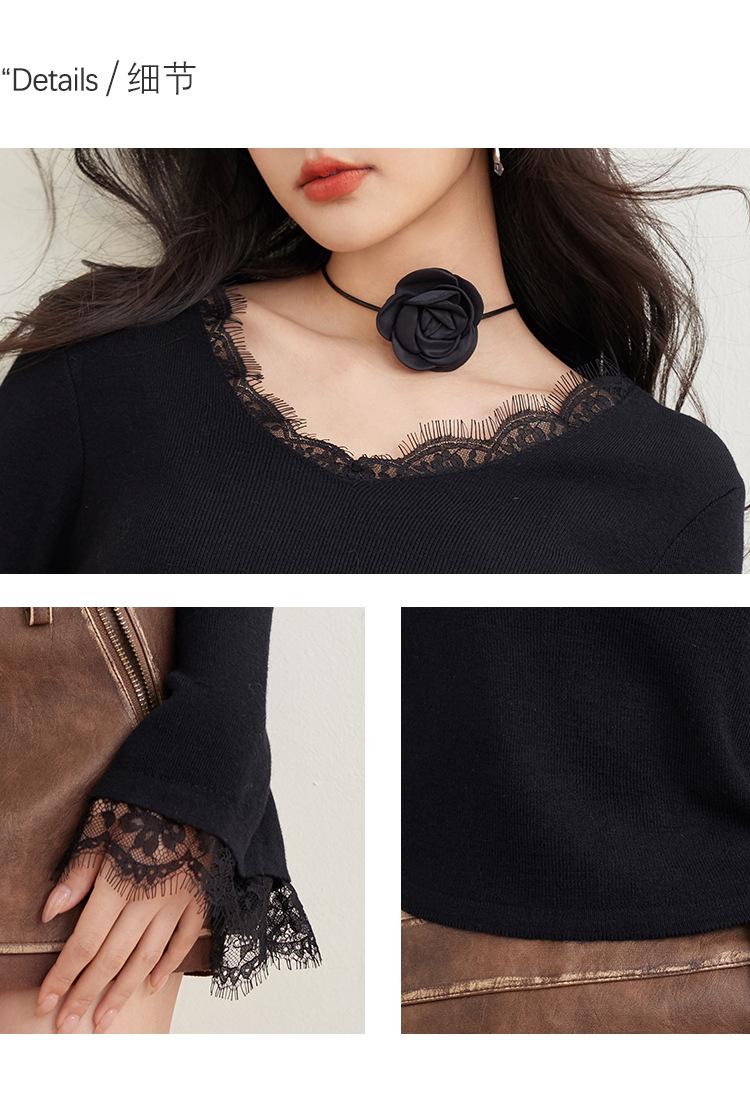 Jersey elegante de punto de manga larga con cuello en V y encaje francés para mujer, estilo primavera 2025