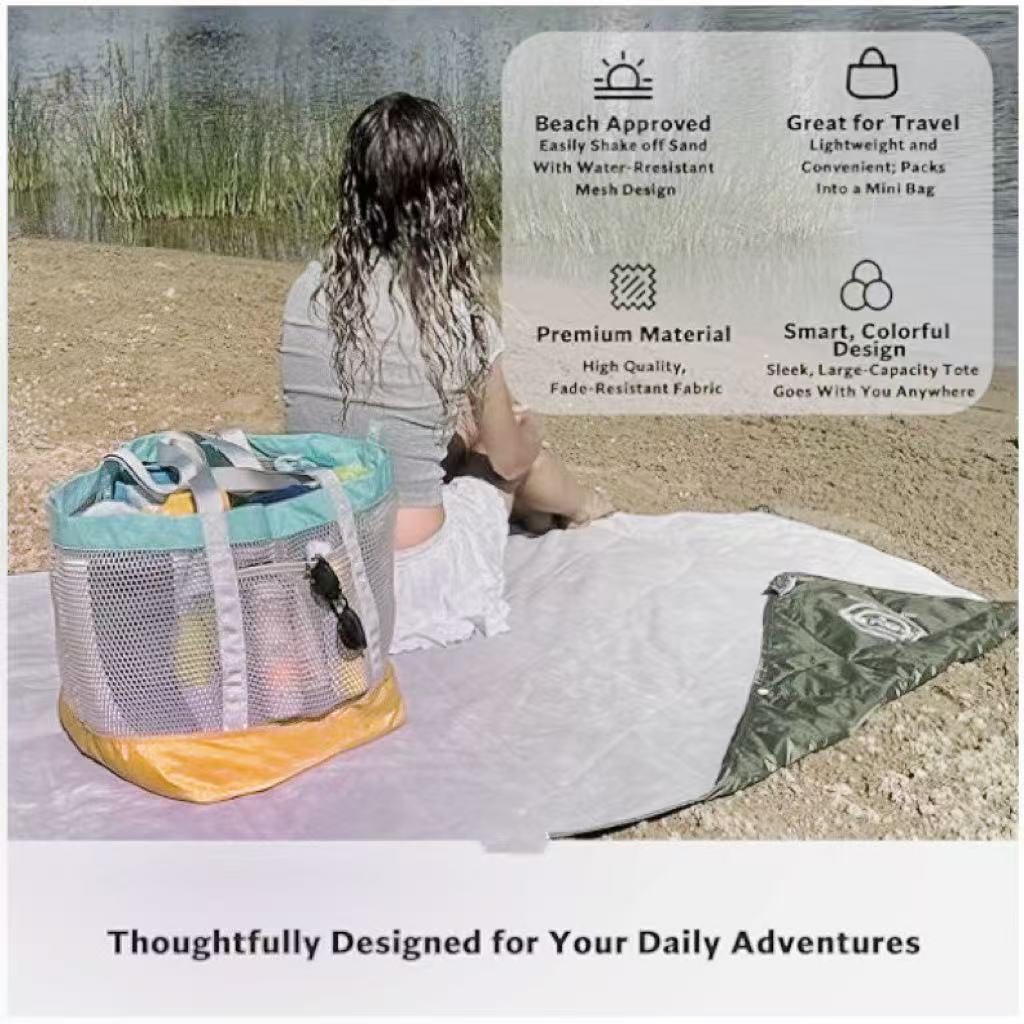 Exclusivo de alta qualidade em estoque: Fundo à prova d'água e à prova de areia, corpo respirável, uso bidirecional, tamanho da bolsa pode ser alterado livremente. 2 conjuntos de alças, pode ser carregada ou usada como mochila. Usável em ambos os lados, dobrável.