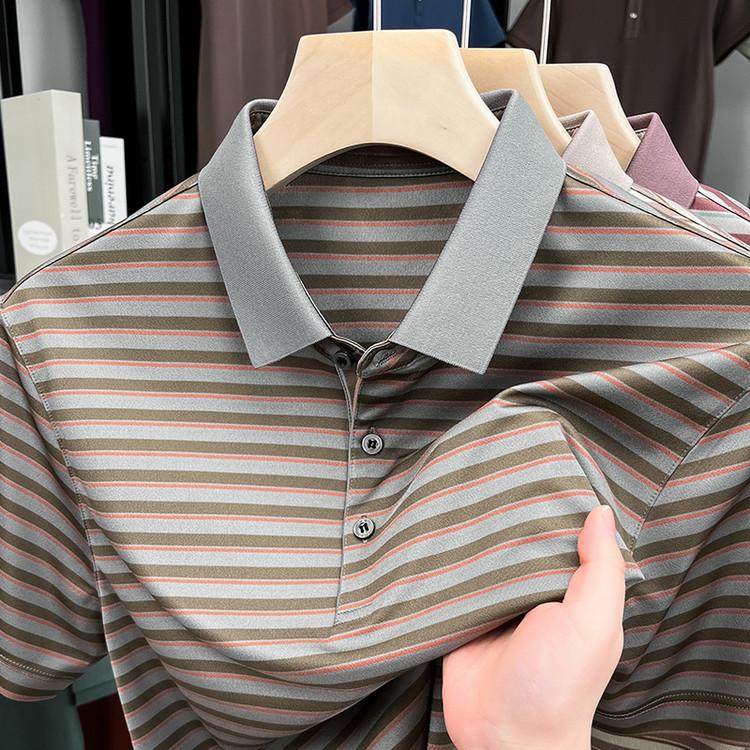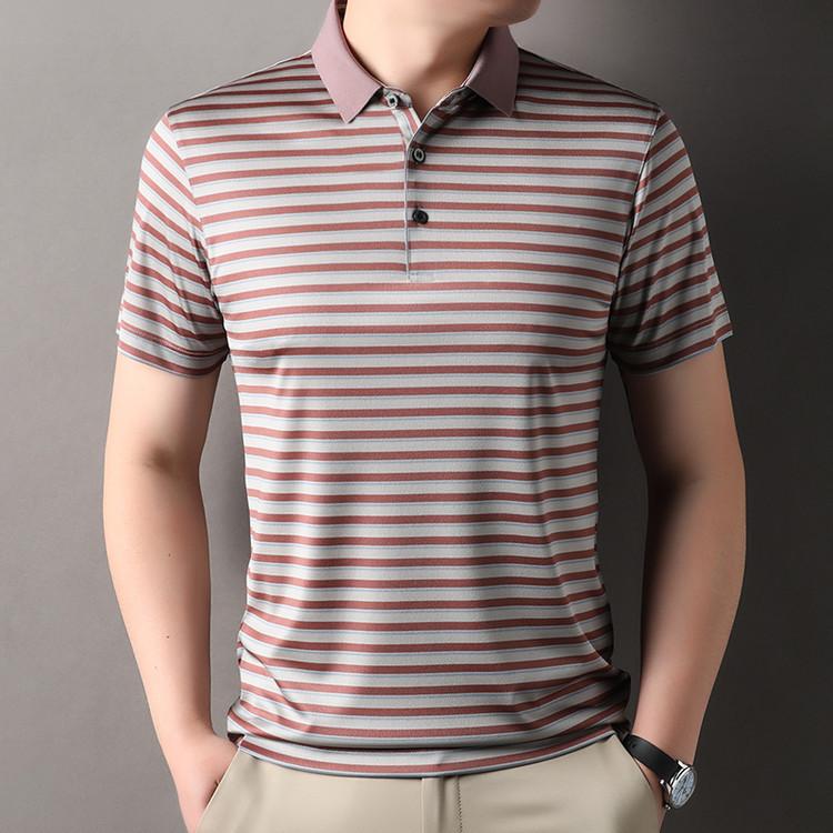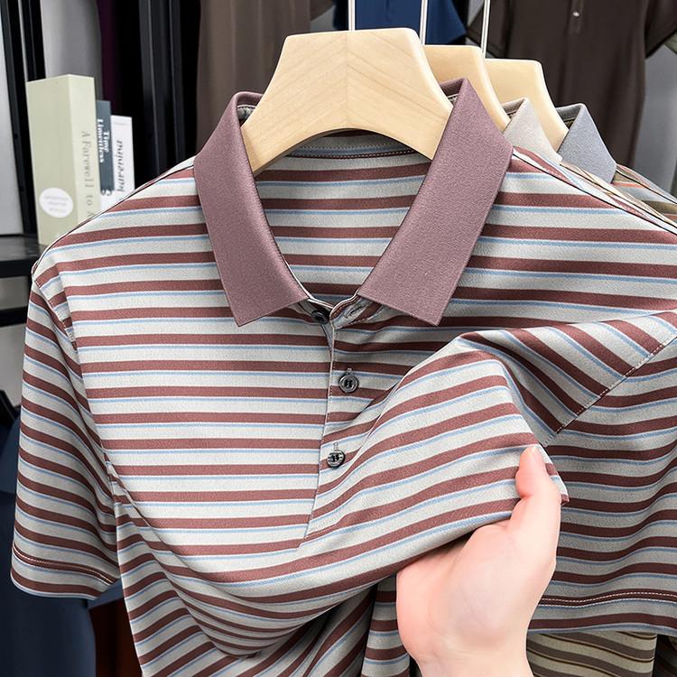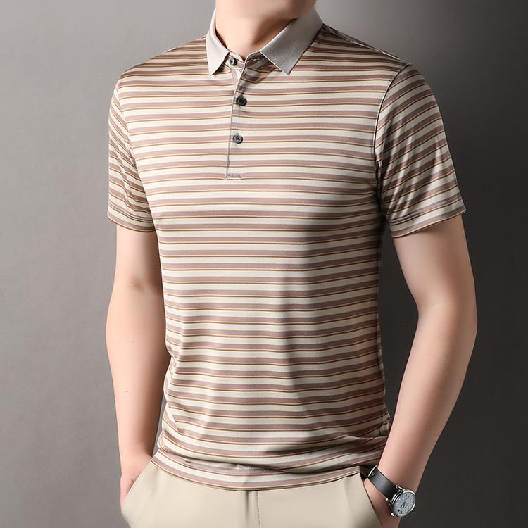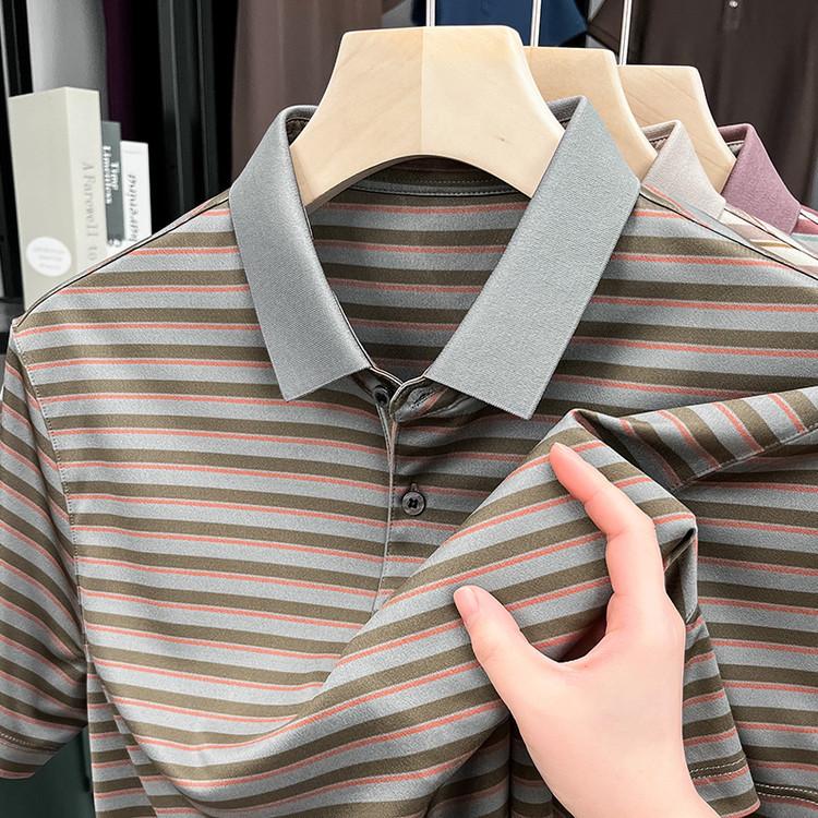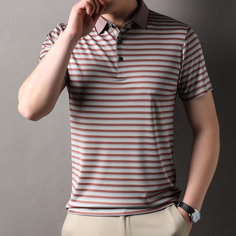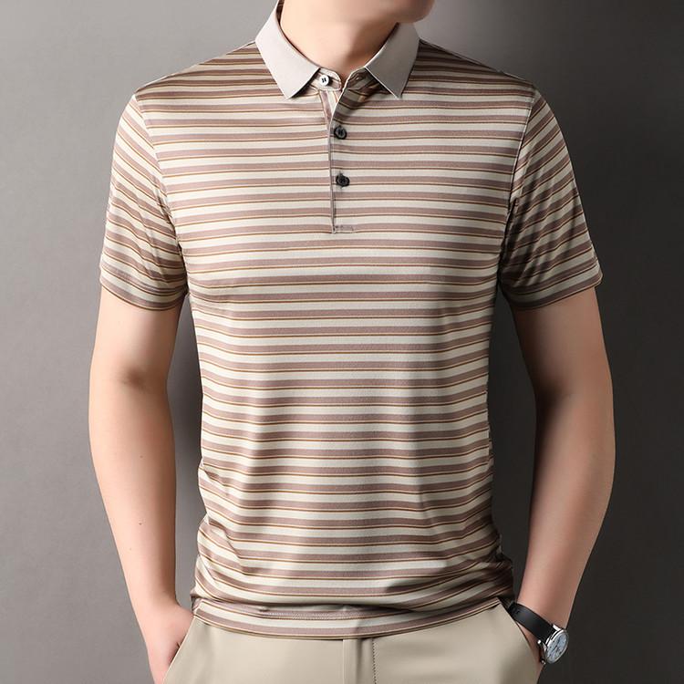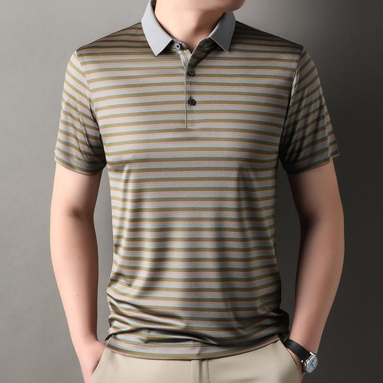 Compra Camiseta Polo de Solapa de Manga Corta para Hombre 2025 Verano de Alta Gama Seda de Morera Rayada Moda de Negocios Papá Camiseta de Media Manga al por mayor en Joom.pro