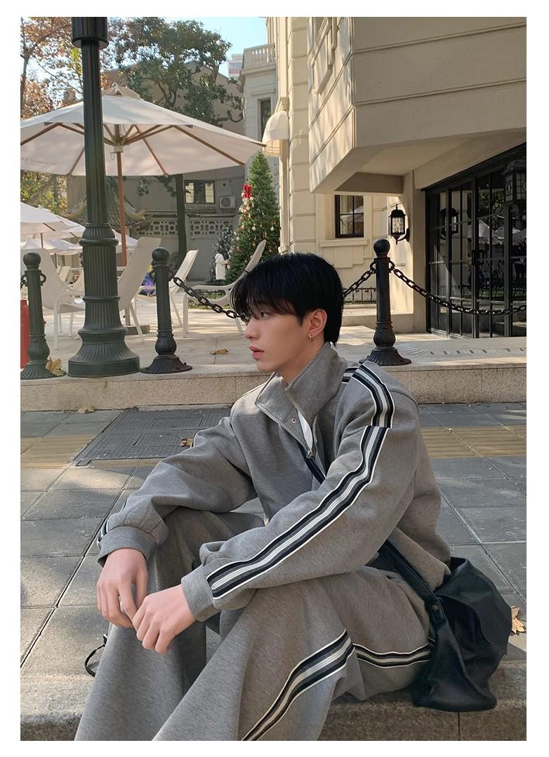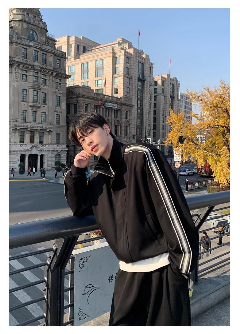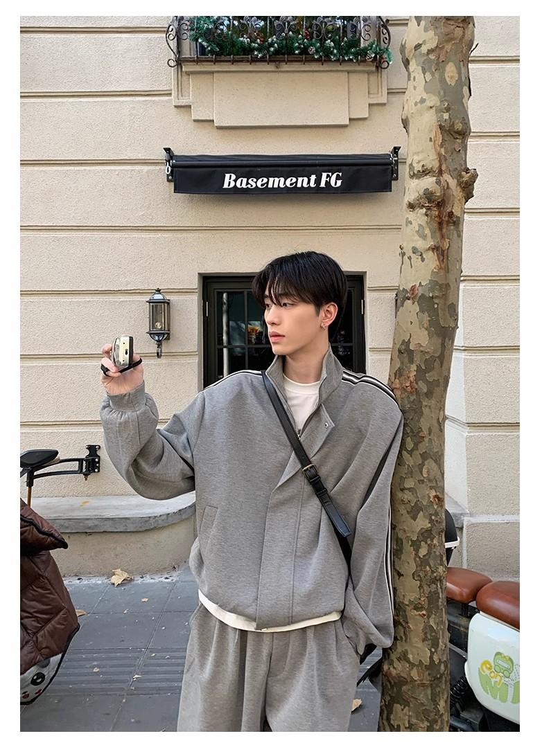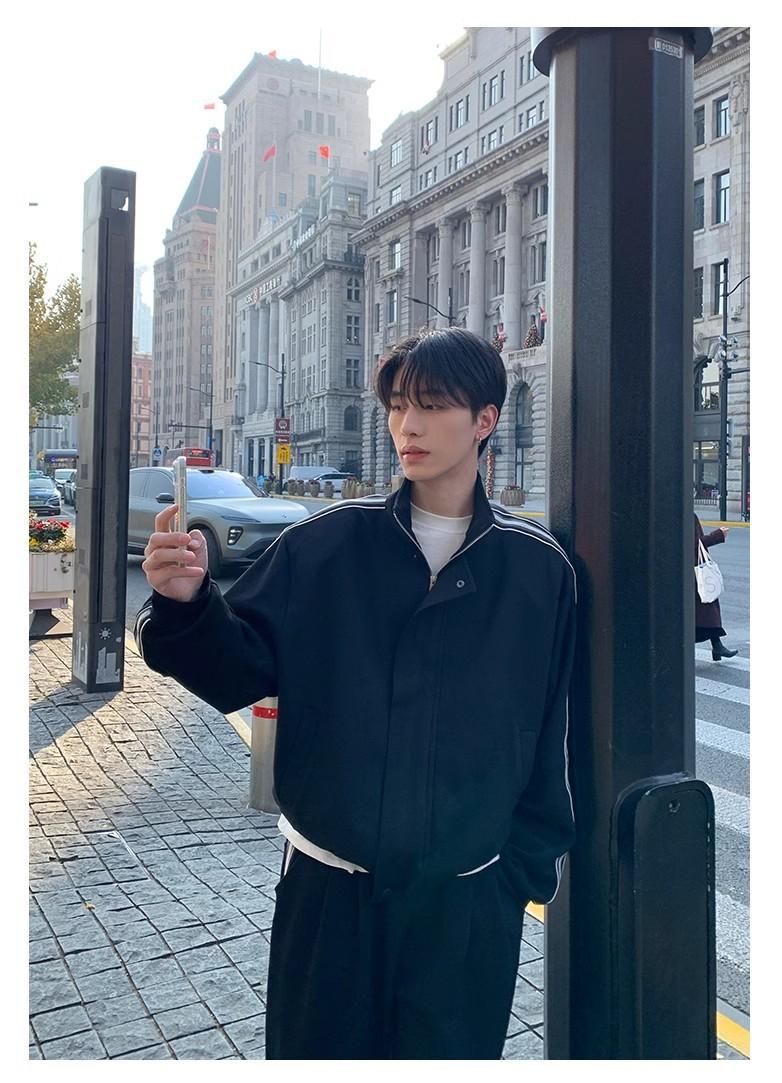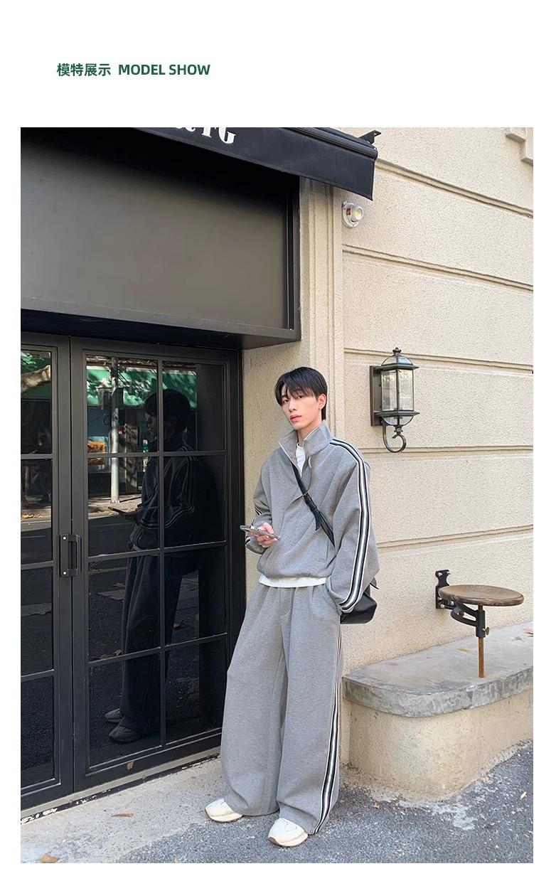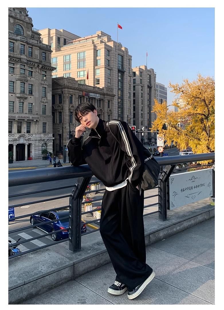 Traje deportivo casual de primavera 2025 con cuello mao y barra de color contrastante para hombre, chaqueta holgada nueva de primavera, pantalones de pierna ancha