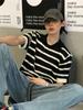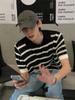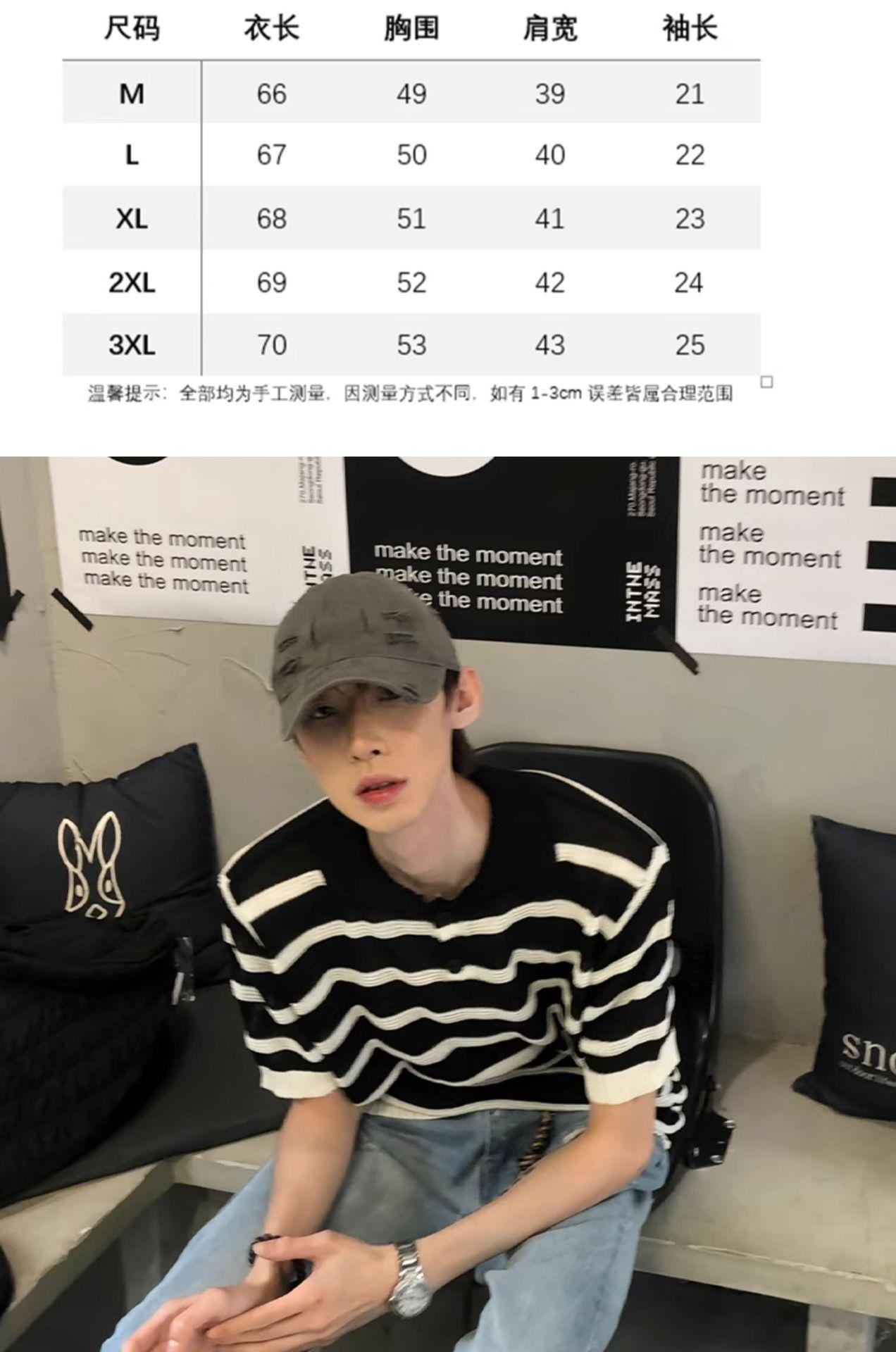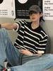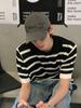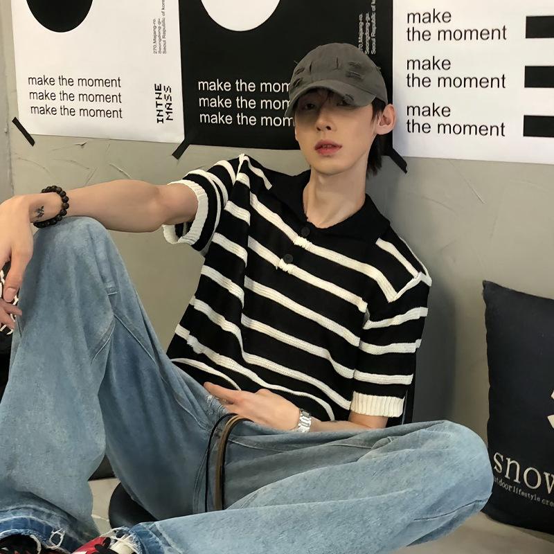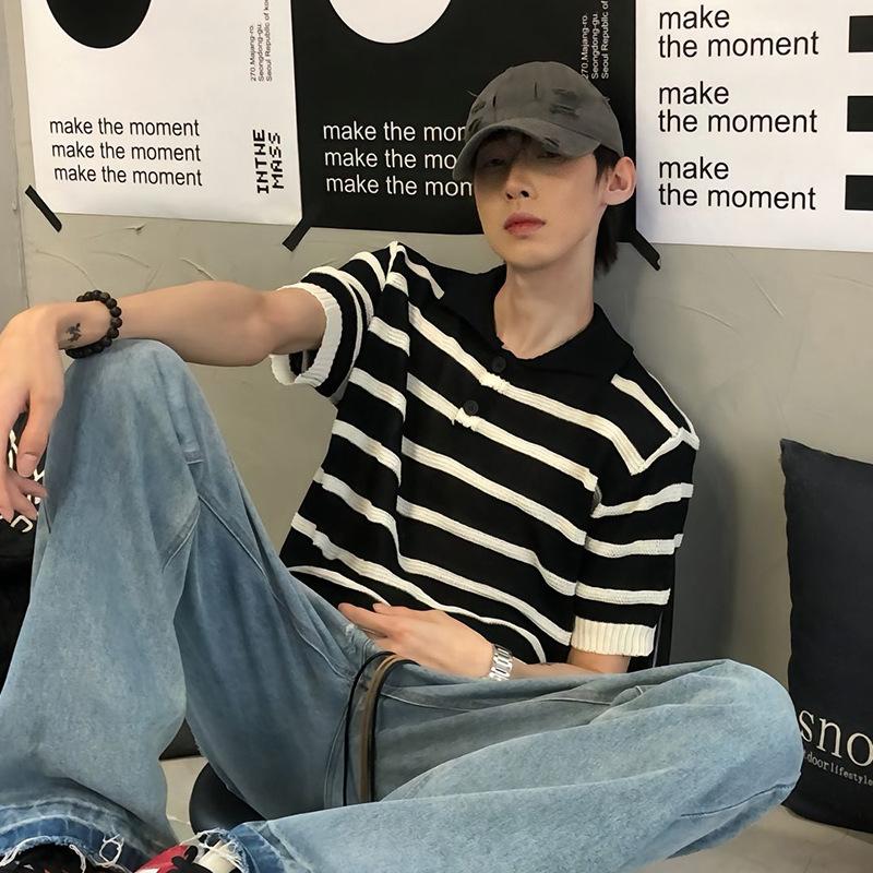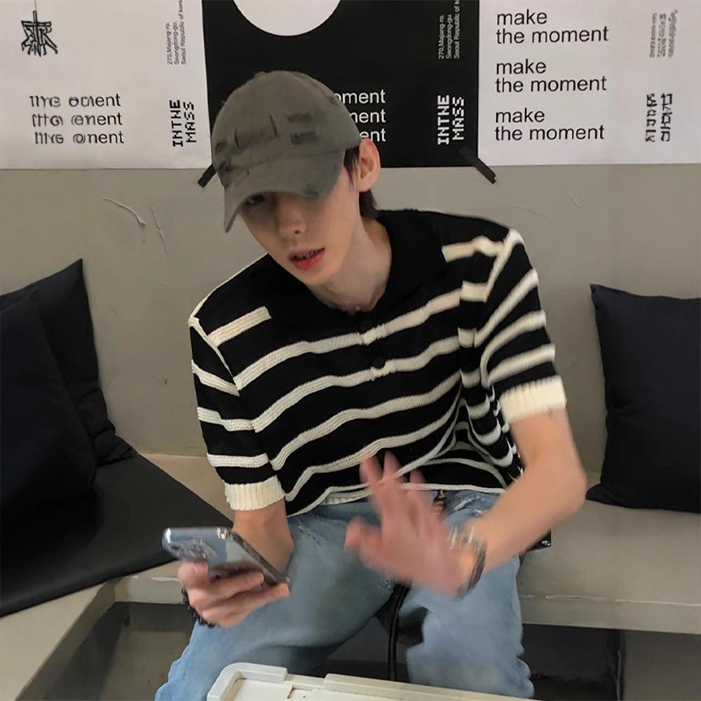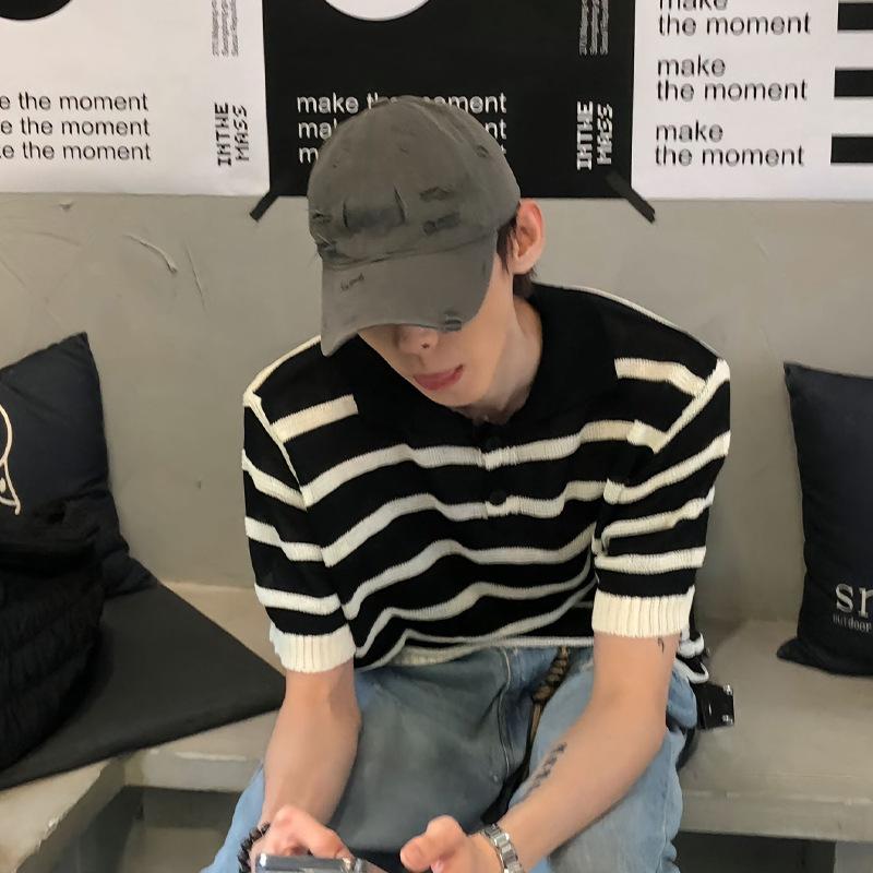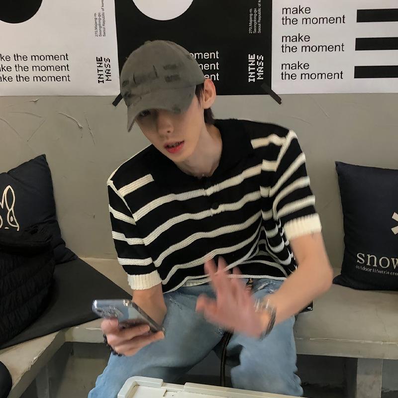 Suéter de Punto de Seda de Hielo Hueco a Rayas Blancas y Negras Camisa Polo Americana de Manga Corta para Hombre Verano Sentido del Diseño Nicho Lel Camiseta