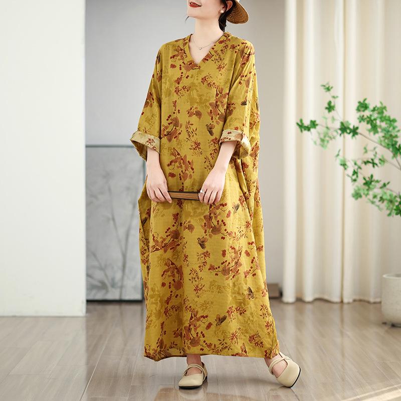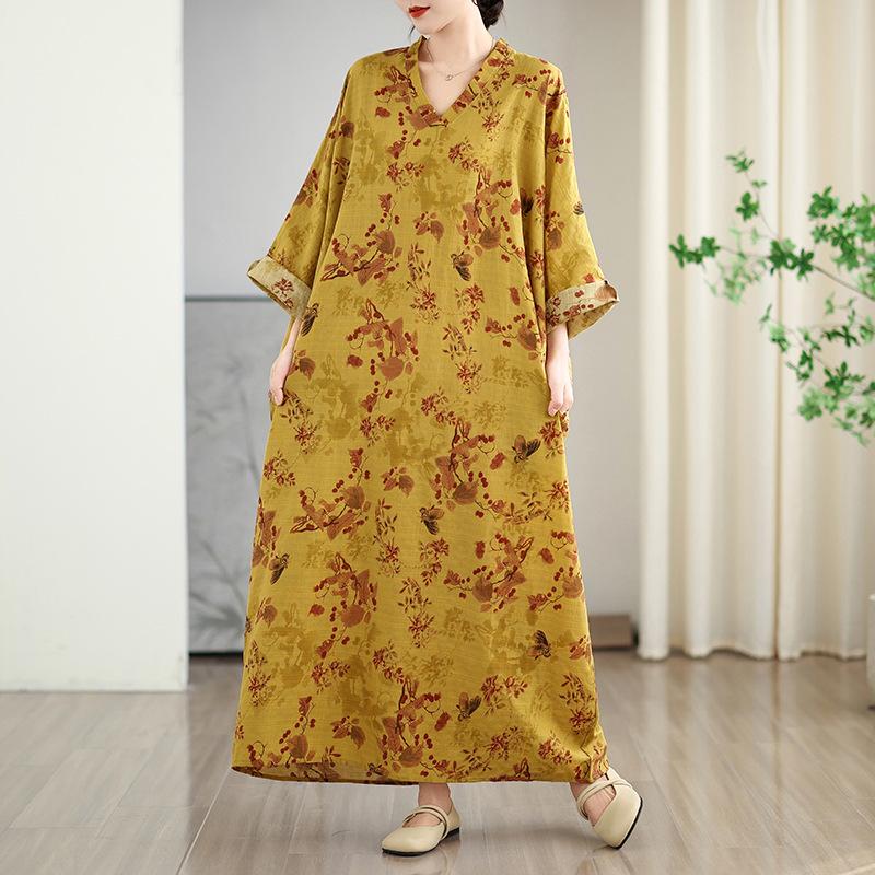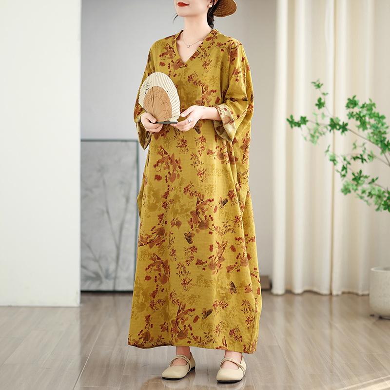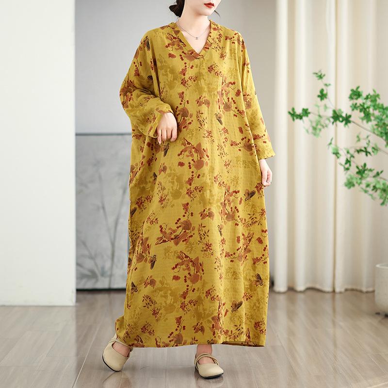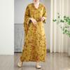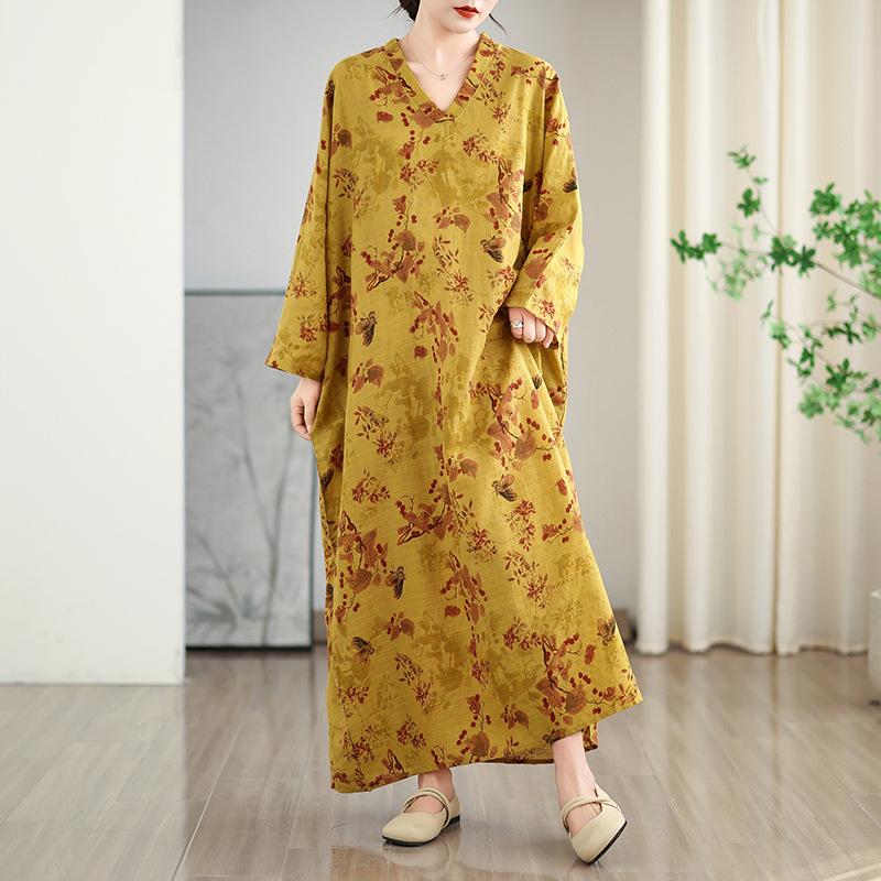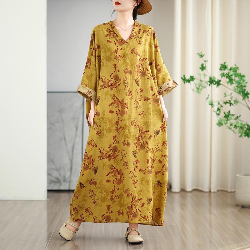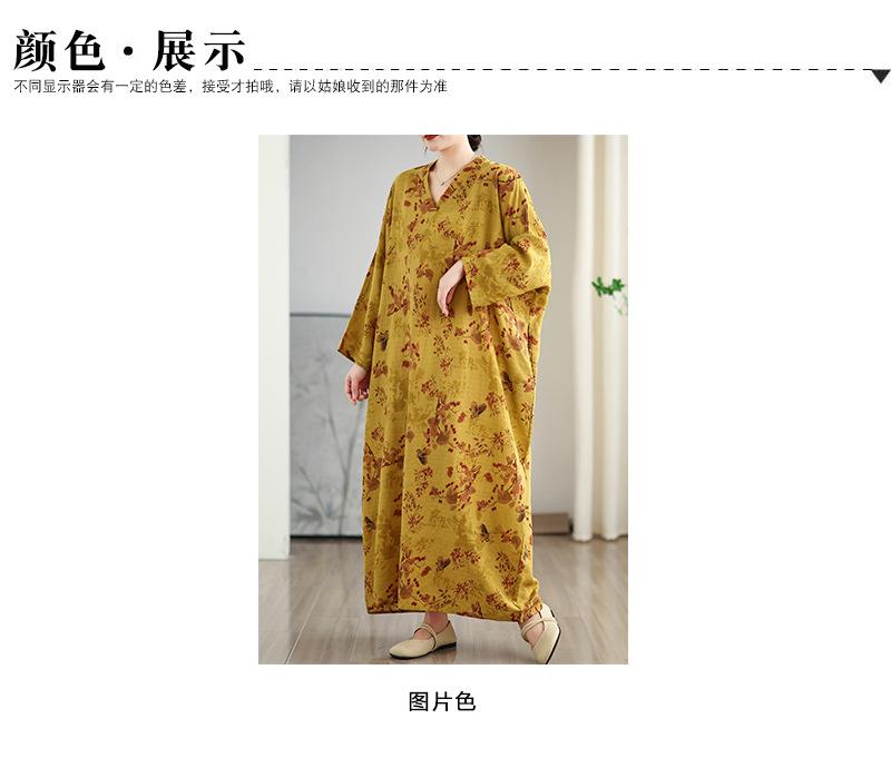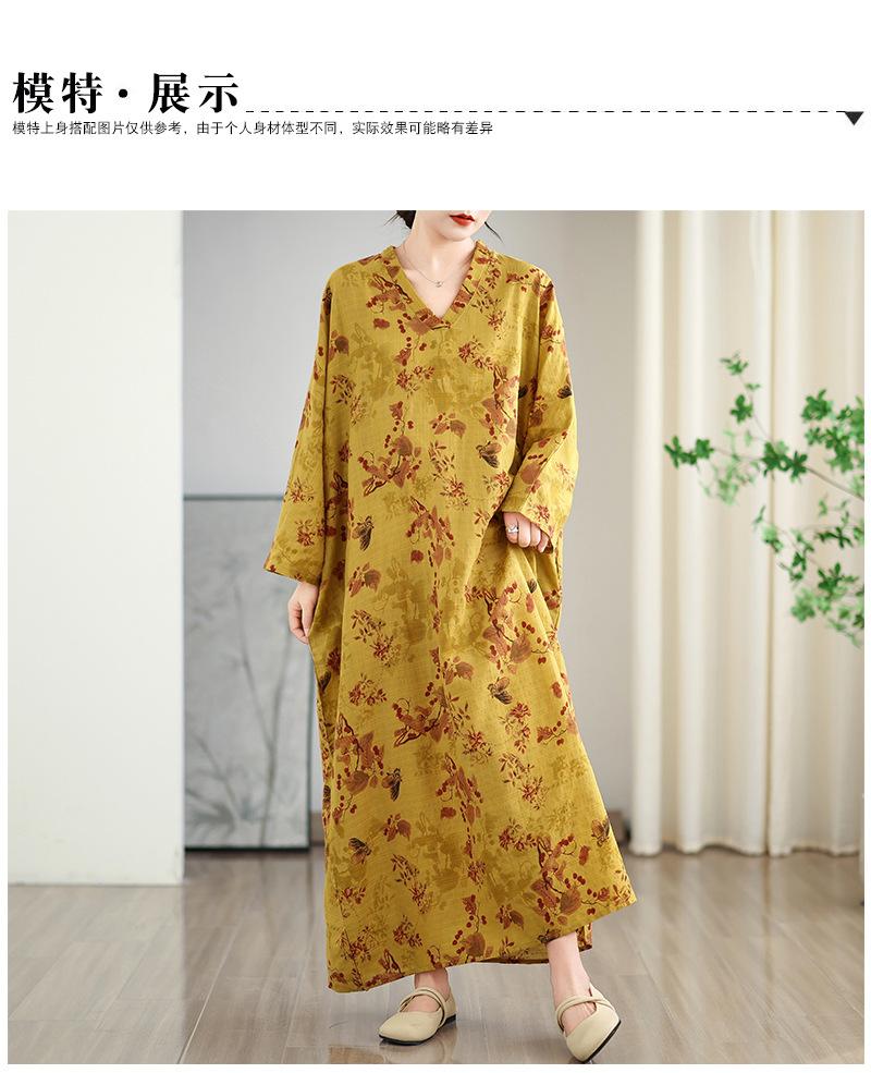 Foto real de 2025 Primavera Temprana Nuevo Estilo Estilo Vacacional Viaje Cuello en V Retro Falda Larga Cubriendo Carne Vestido de Algodón y Lino