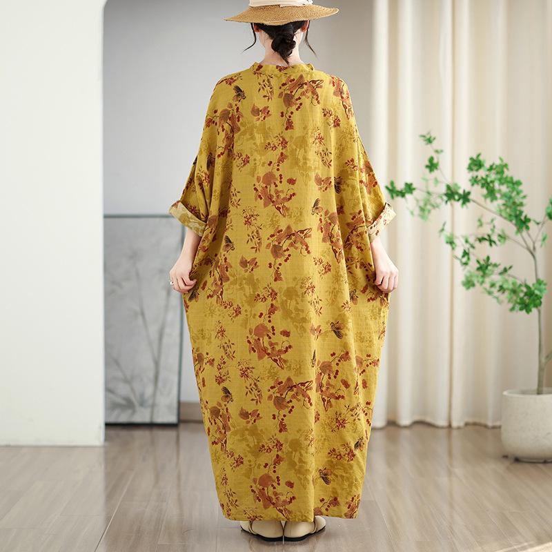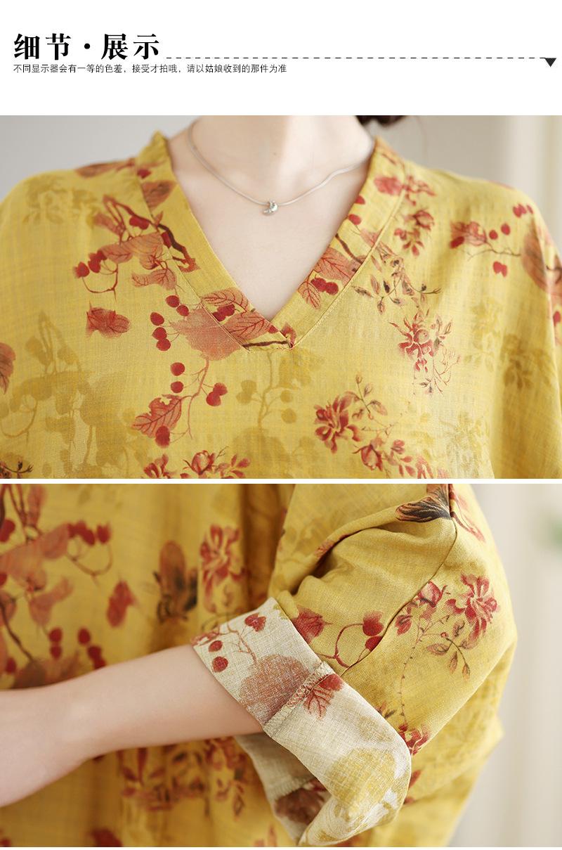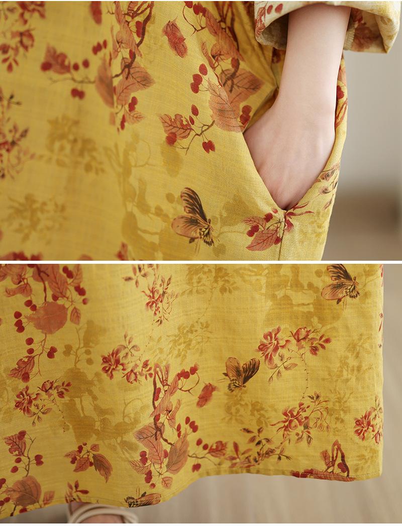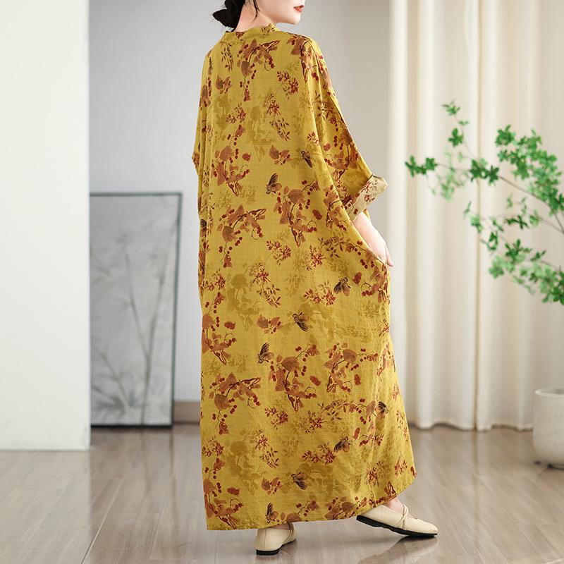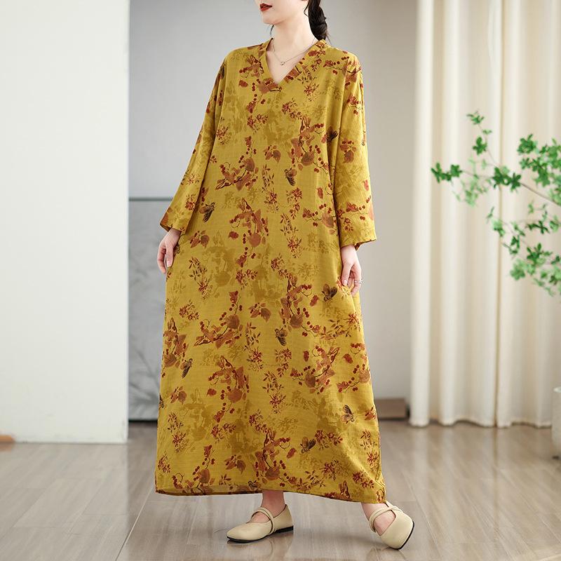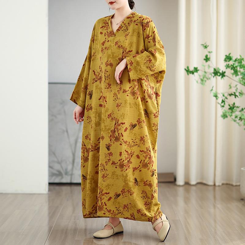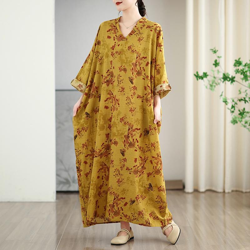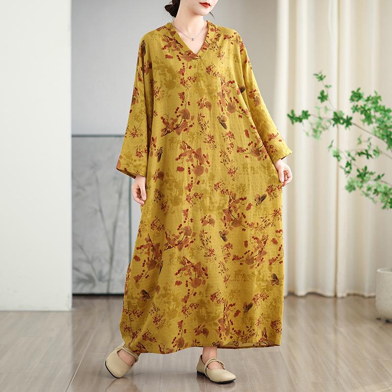 Foto real de 2025 Primavera Temprana Nuevo Estilo Estilo Vacacional Viaje Cuello en V Retro Falda Larga Cubriendo Carne Vestido de Algodón y Lino