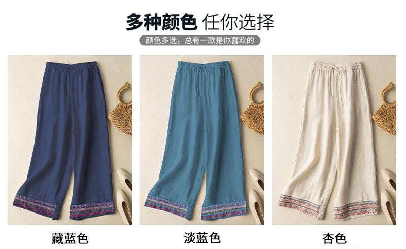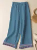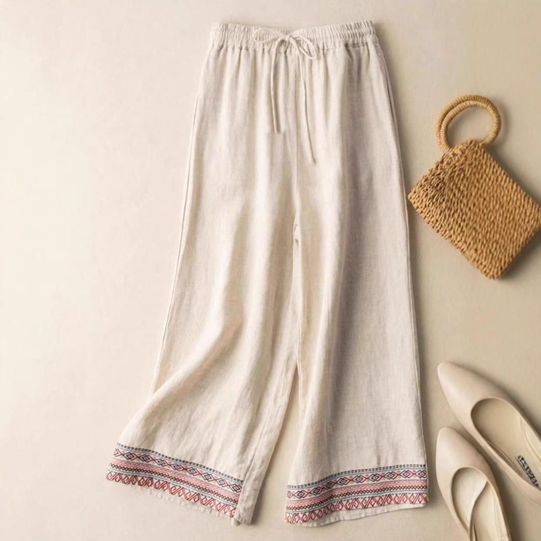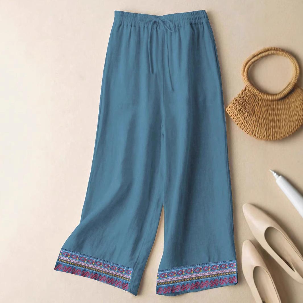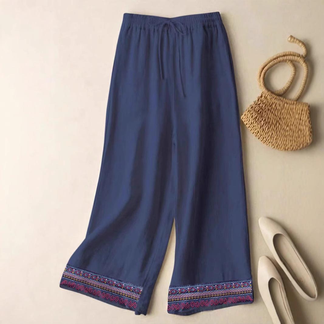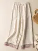 Colgante Geométrico Bordado Pantalones Anchos Bordados de Algodón y Lino para Mujer Verano Sueltos Rectos Versátiles Cintura Alta Adelgazantes Pantalones Casuales para Mujer