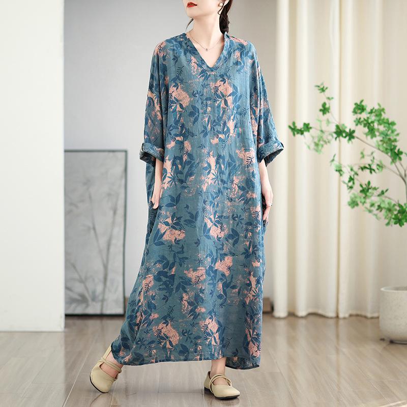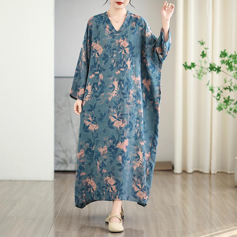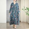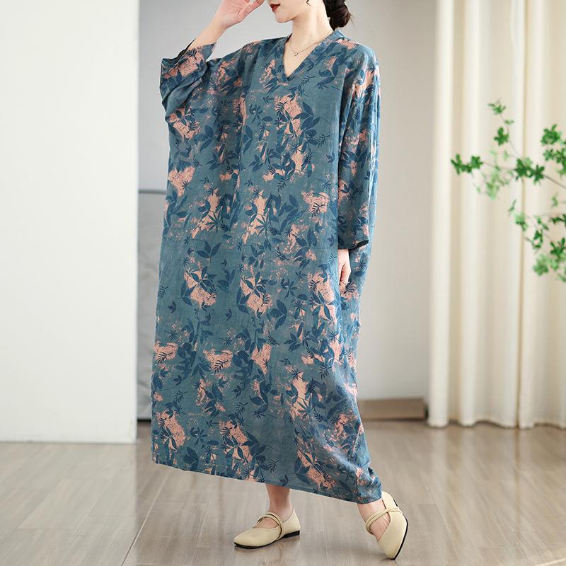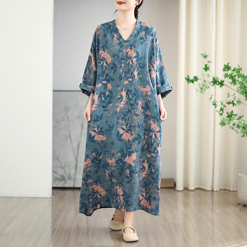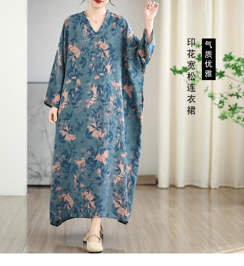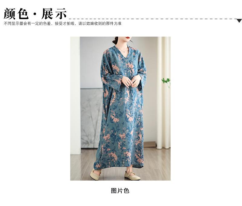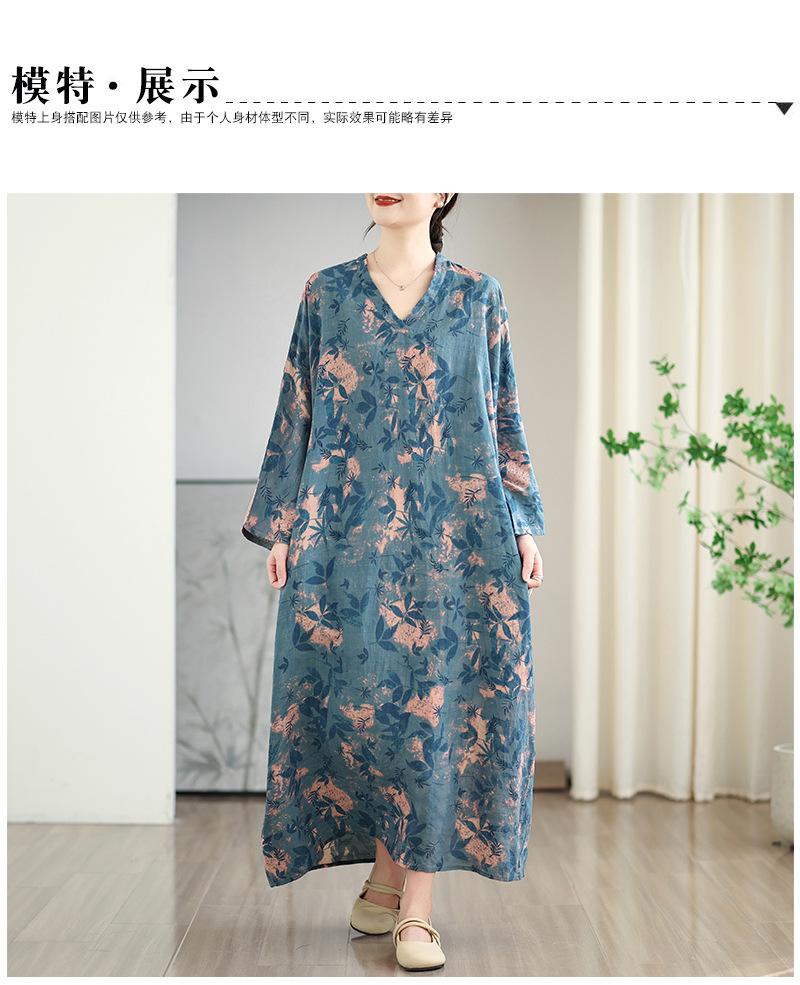 Foto real de 2025 Primavera Temprana Nuevo Estilo Estilo Vacacional Viaje Cuello en V Retro Falda Larga Cubriendo Carne Vestido de Algodón y Lino