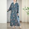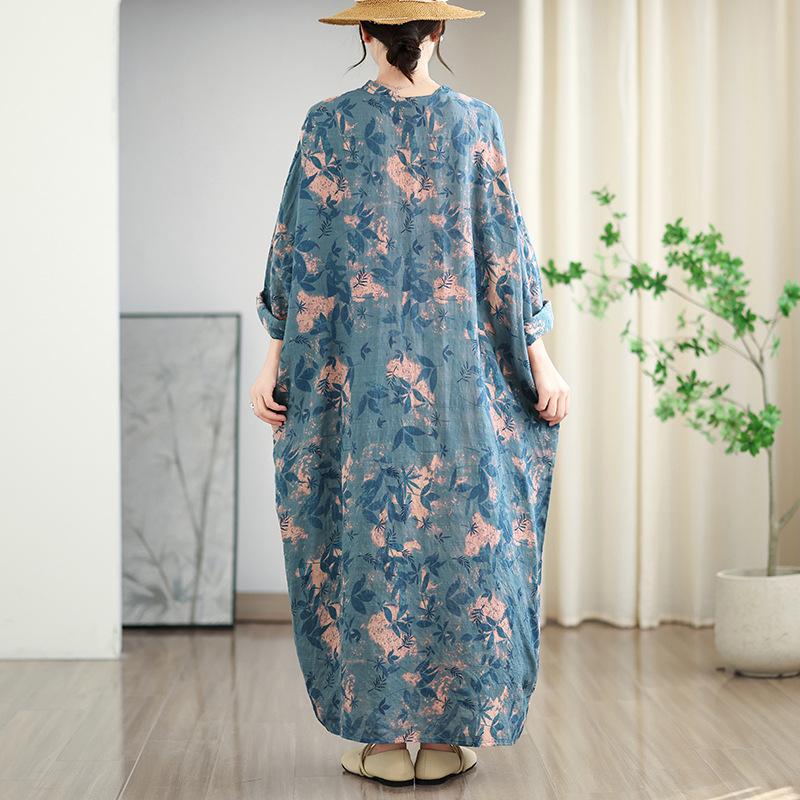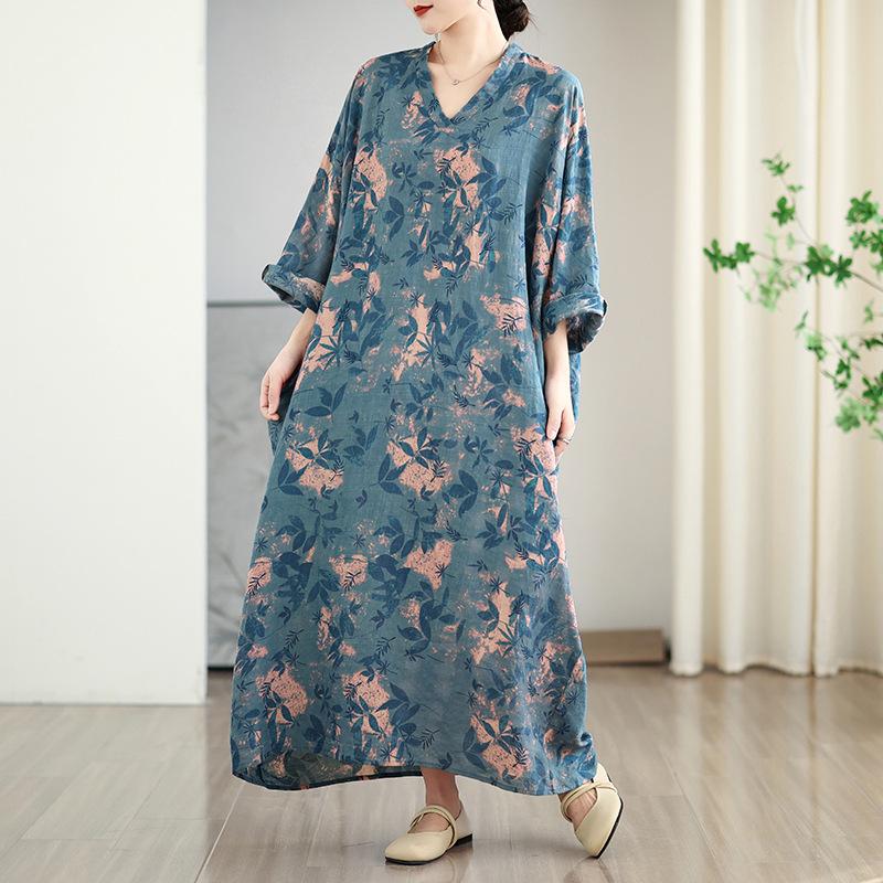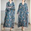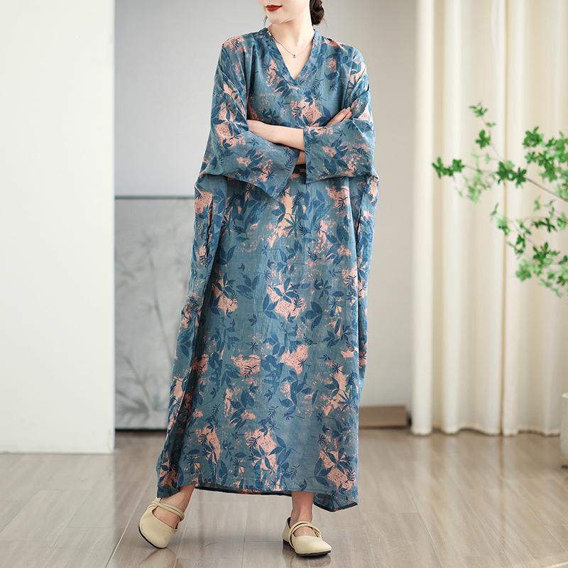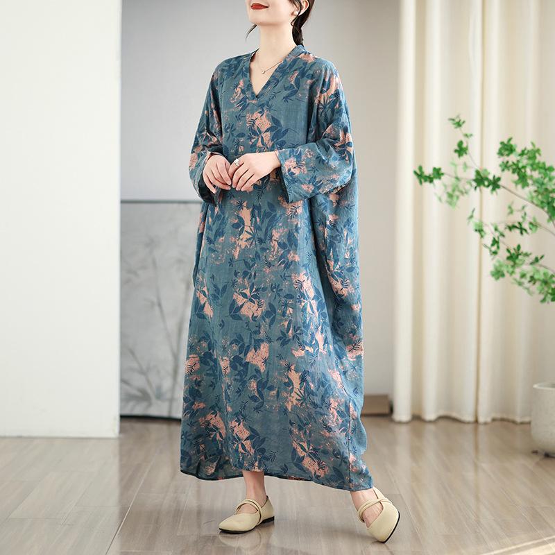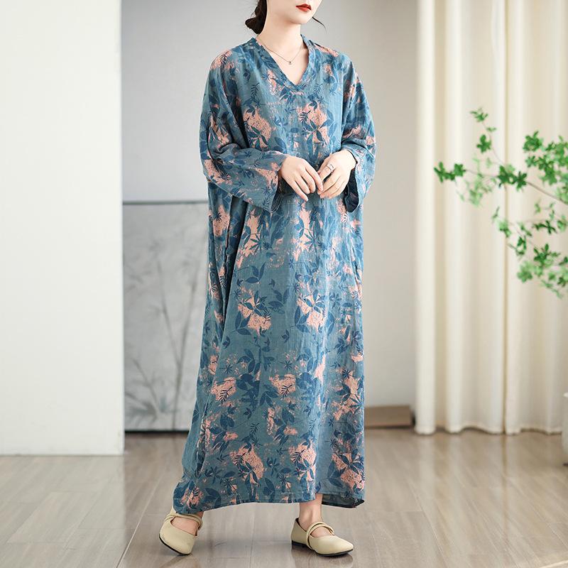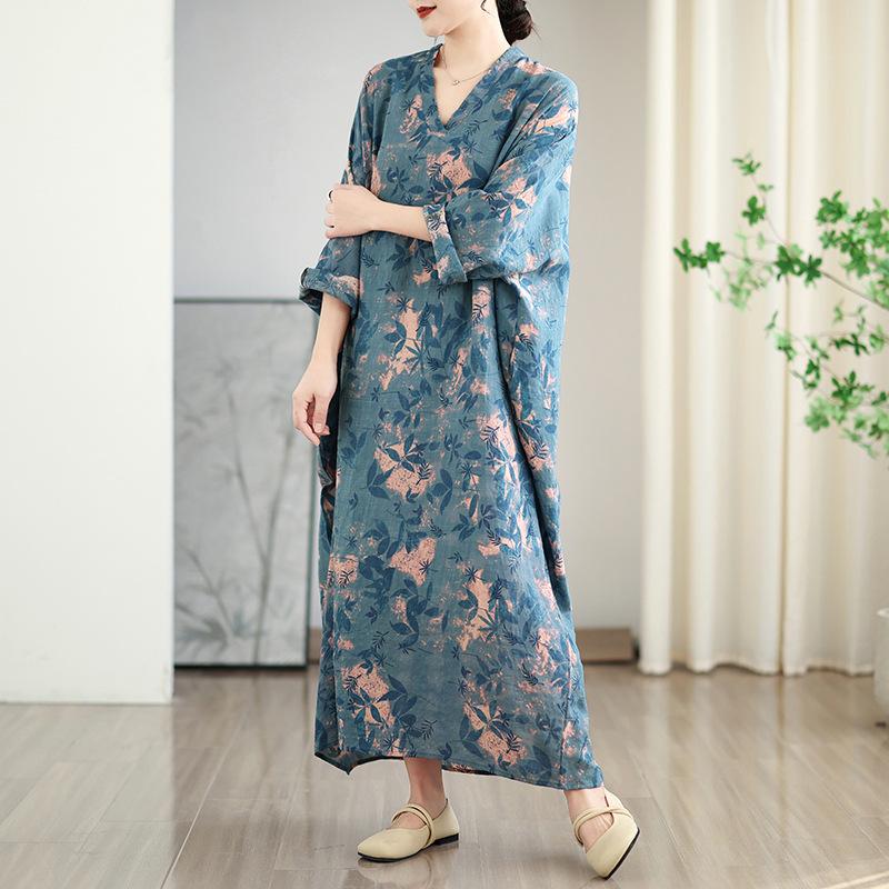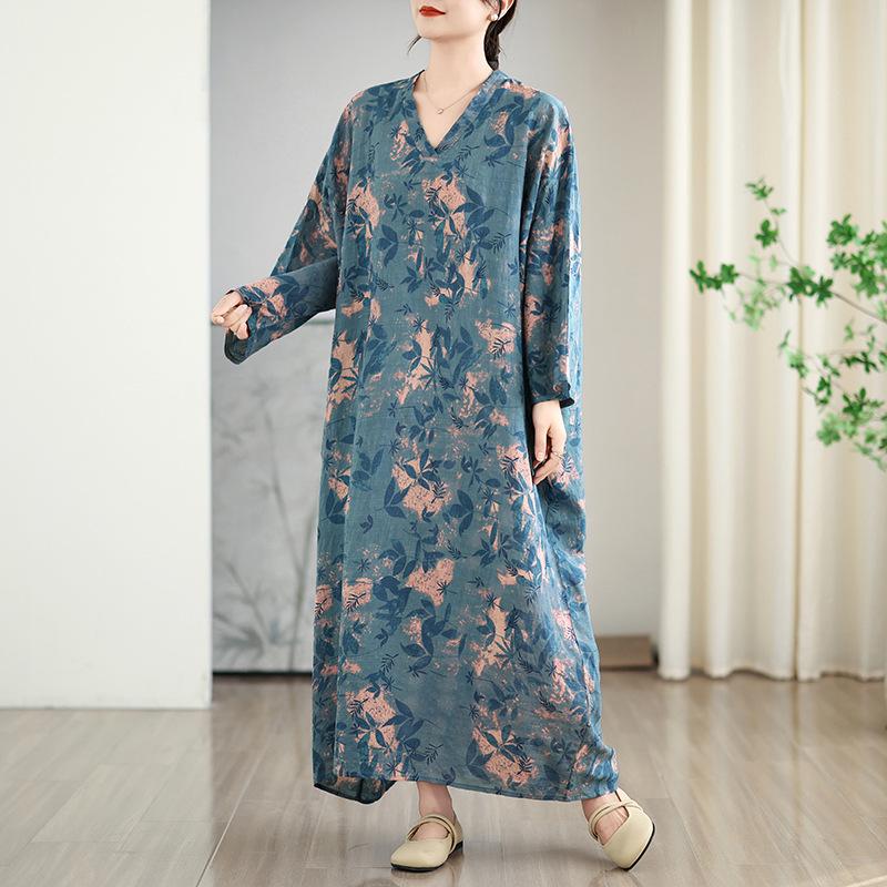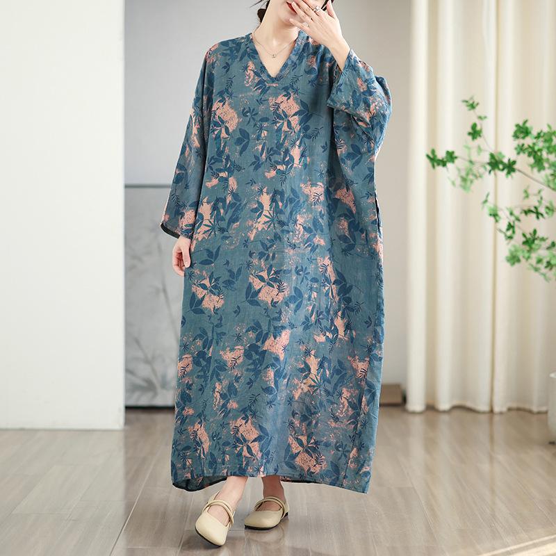 Foto real de 2025 Primavera Temprana Nuevo Estilo Estilo Vacacional Viaje Cuello en V Retro Falda Larga Cubriendo Carne Vestido de Algodón y Lino