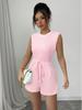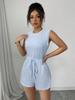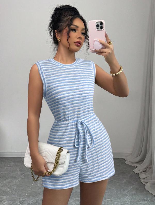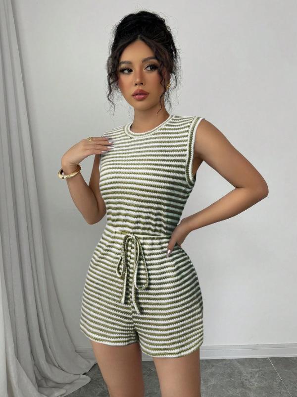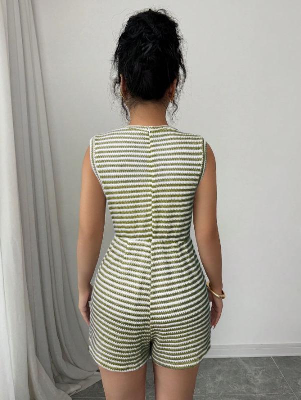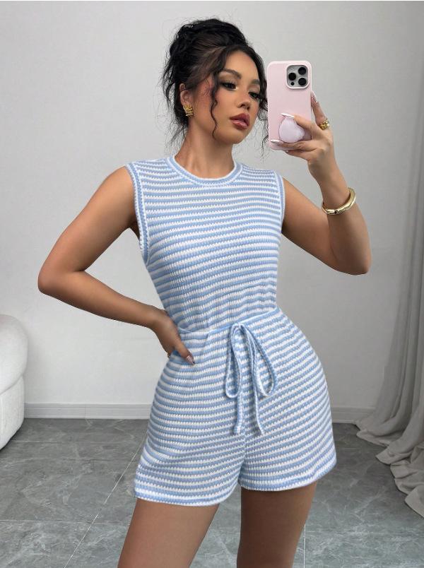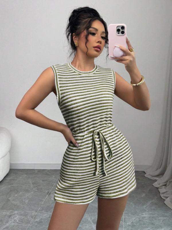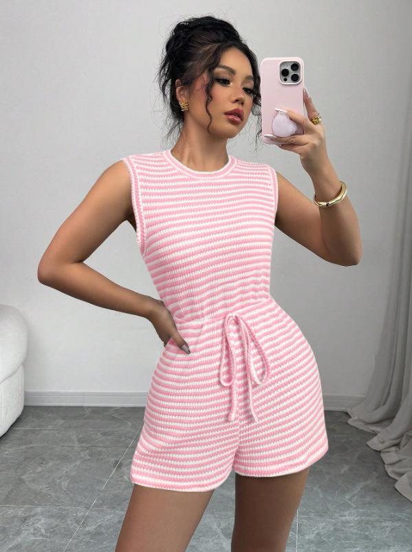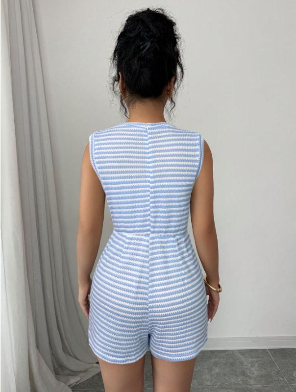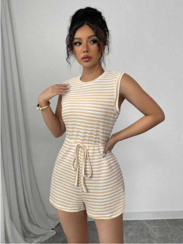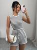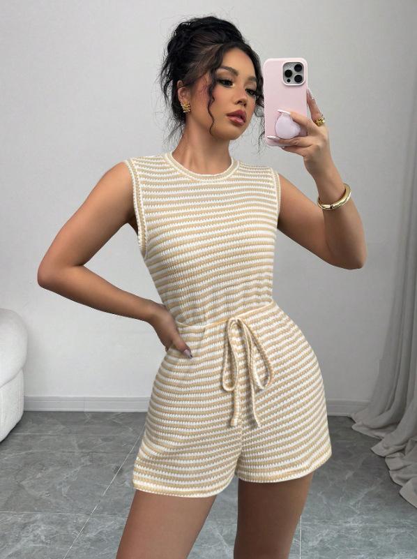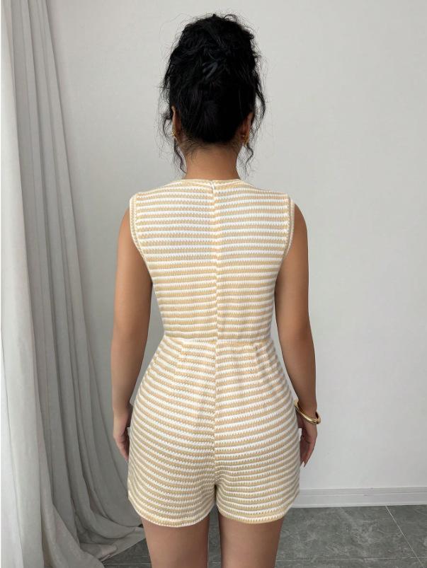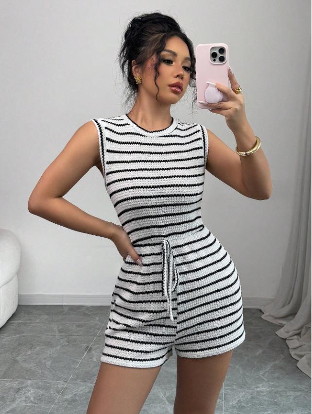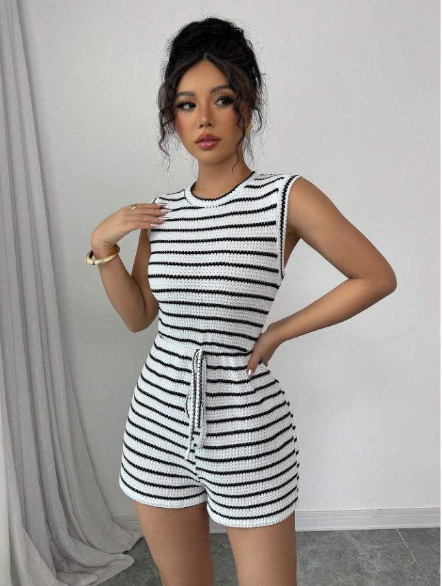 Amazon Transfronterizo 2025 Moda Europea y Americana Nuevo Casual Rayado Cuello Redondo Sin Mangas Shorts Mono Ajustado para Mujer