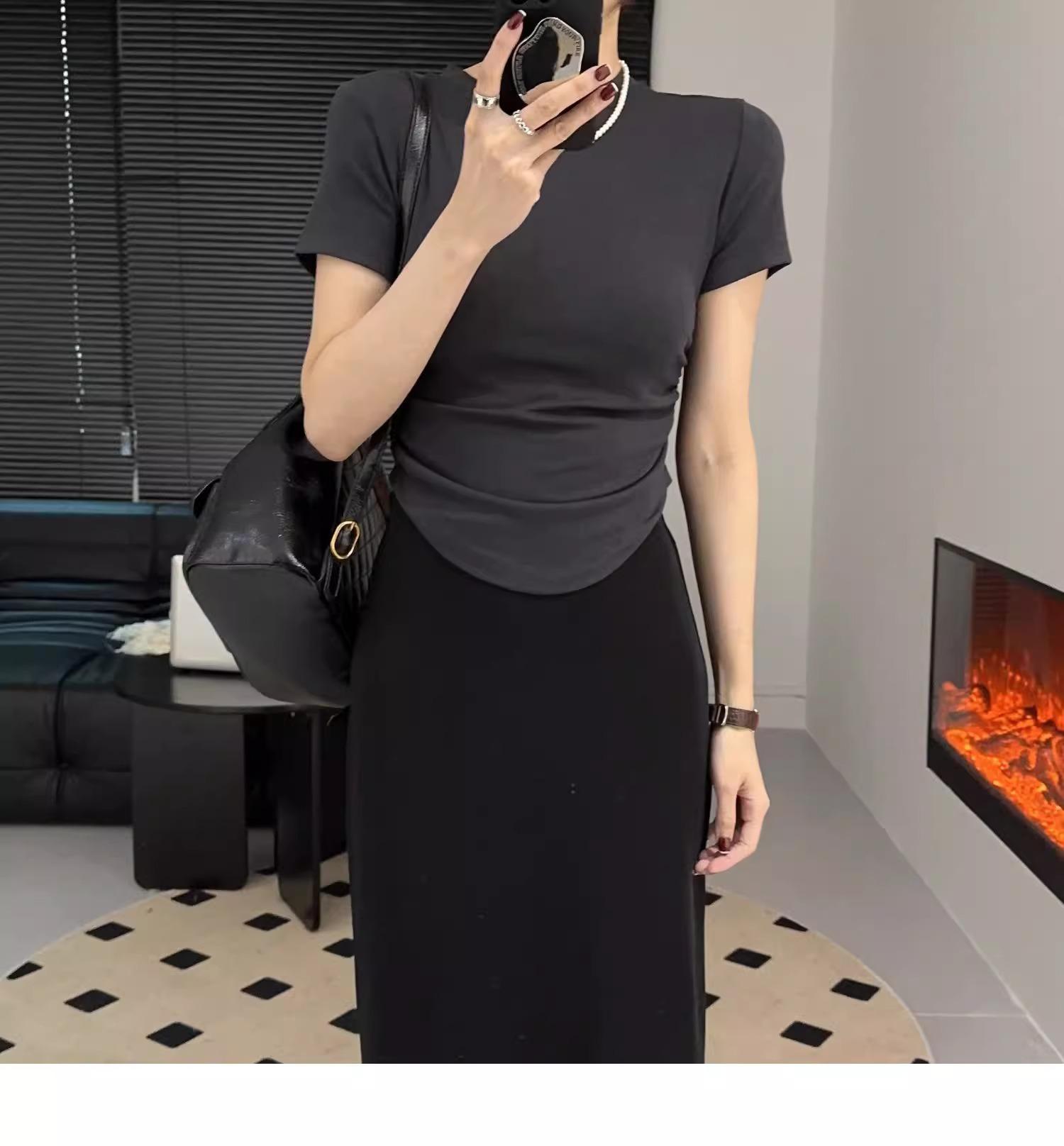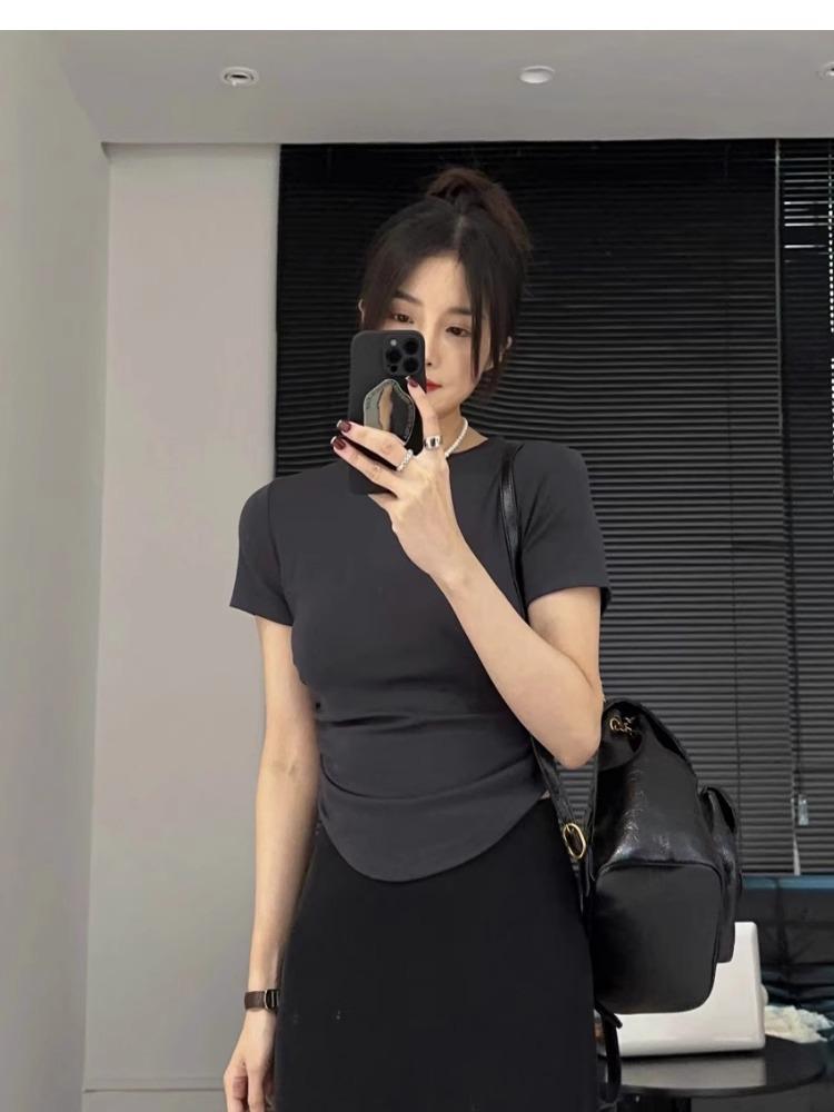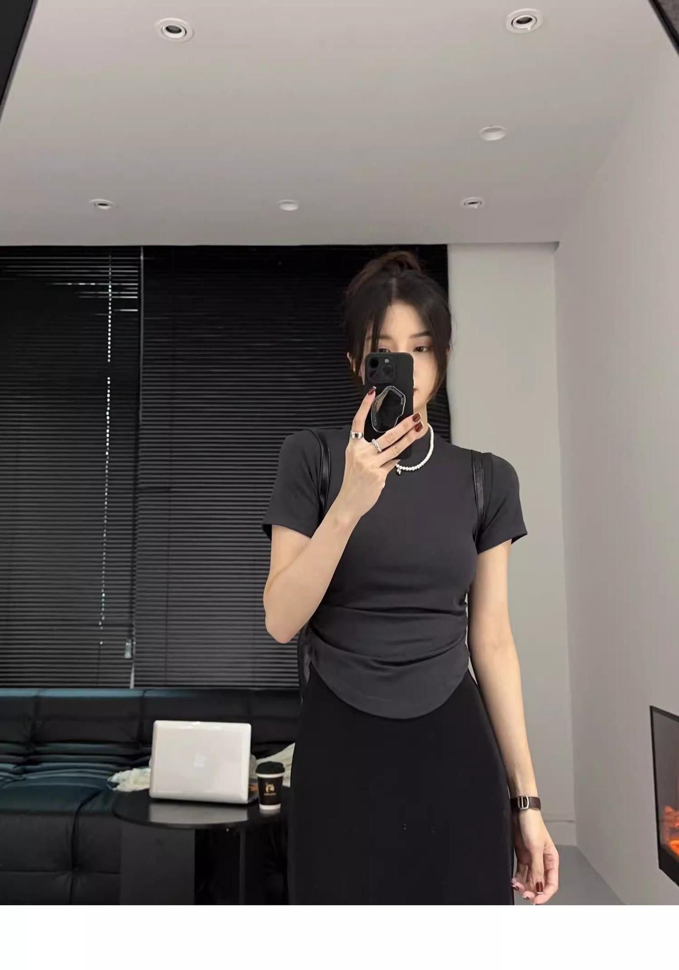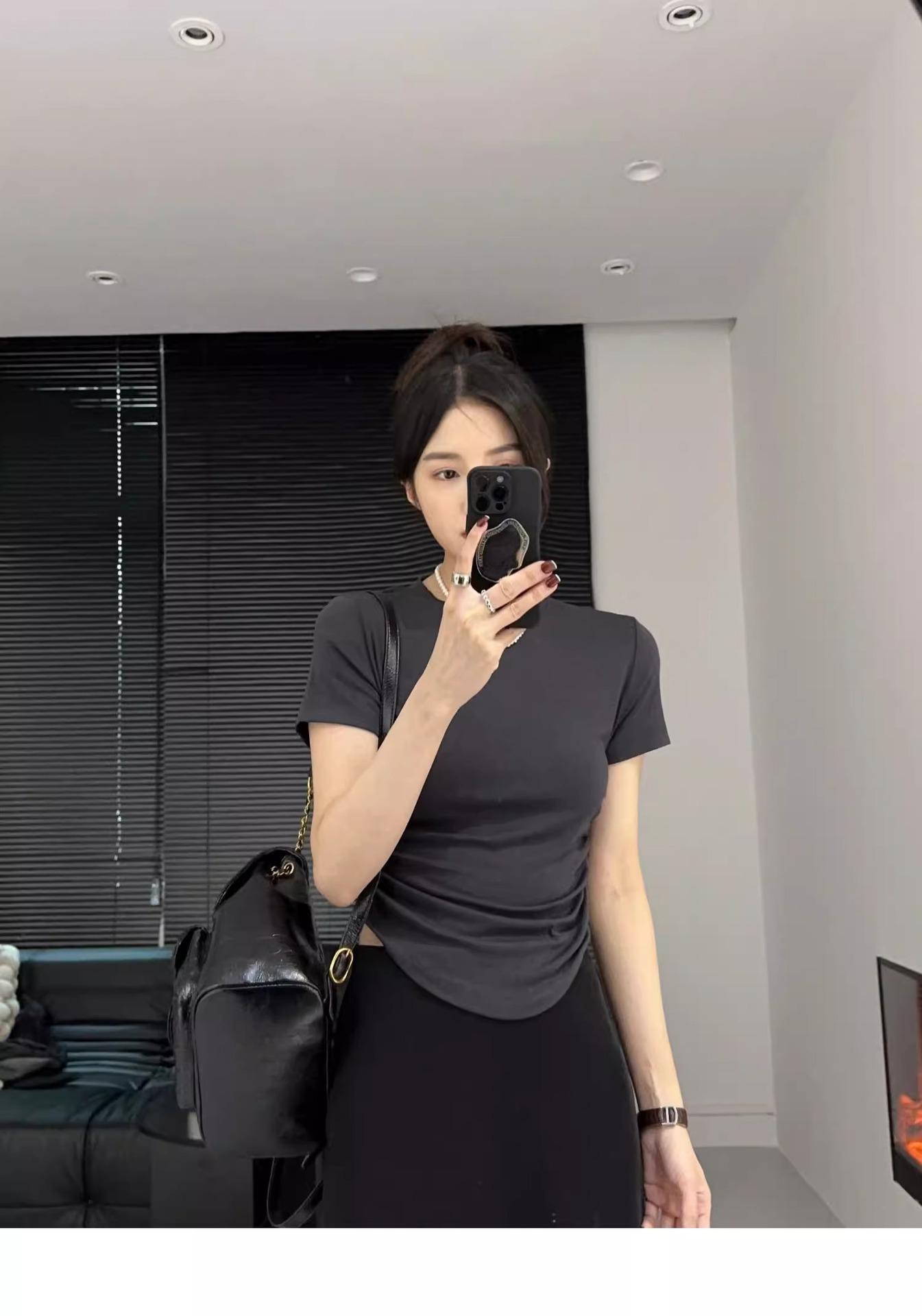 Compra Diseño de Camiseta de Hombro Plisada Corta Irregular Verano de Chica Caliente Cuello U Manga Corta Ajustada Cintura Ceñida Top A3410 al por mayor en Joom.pro
