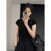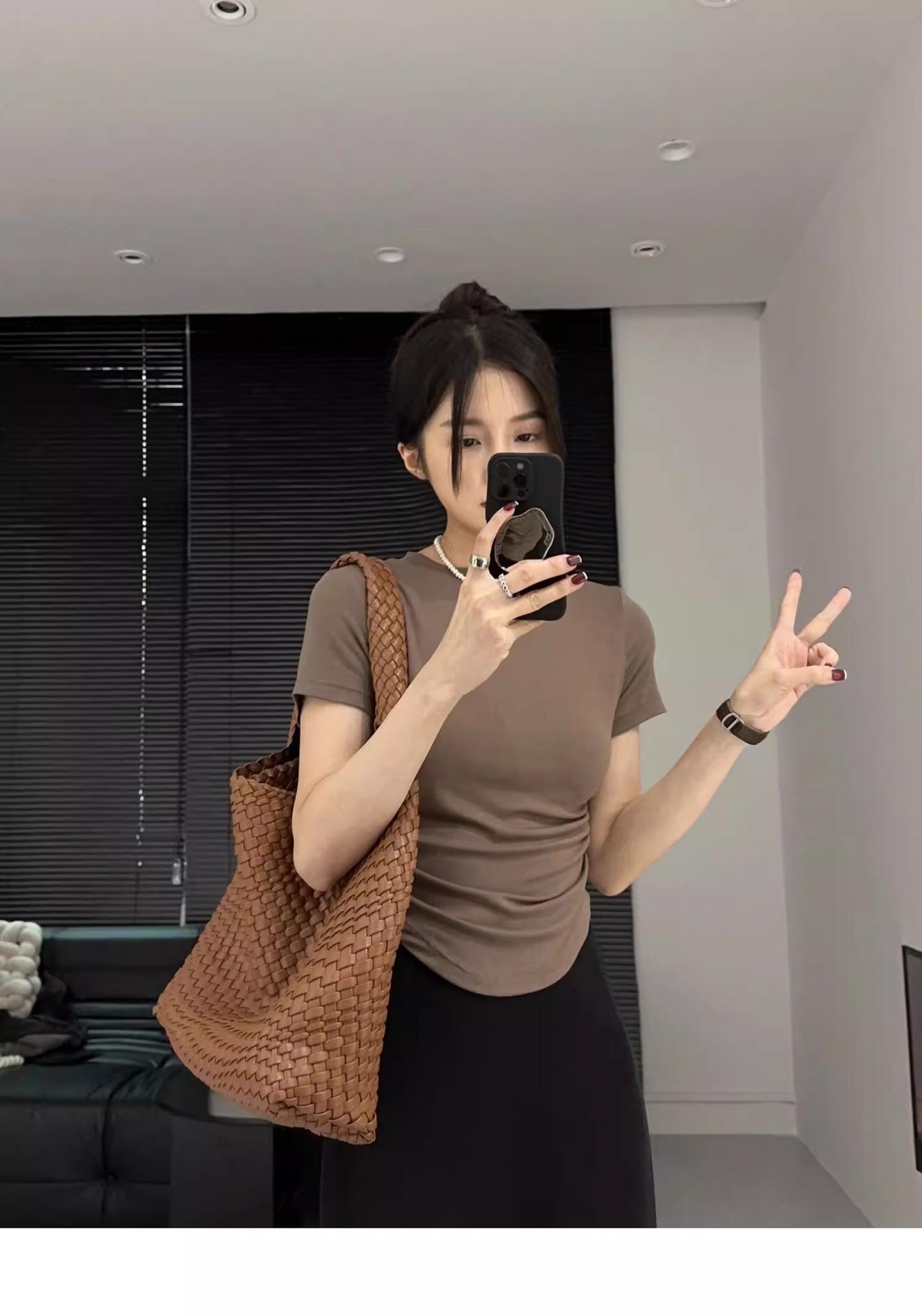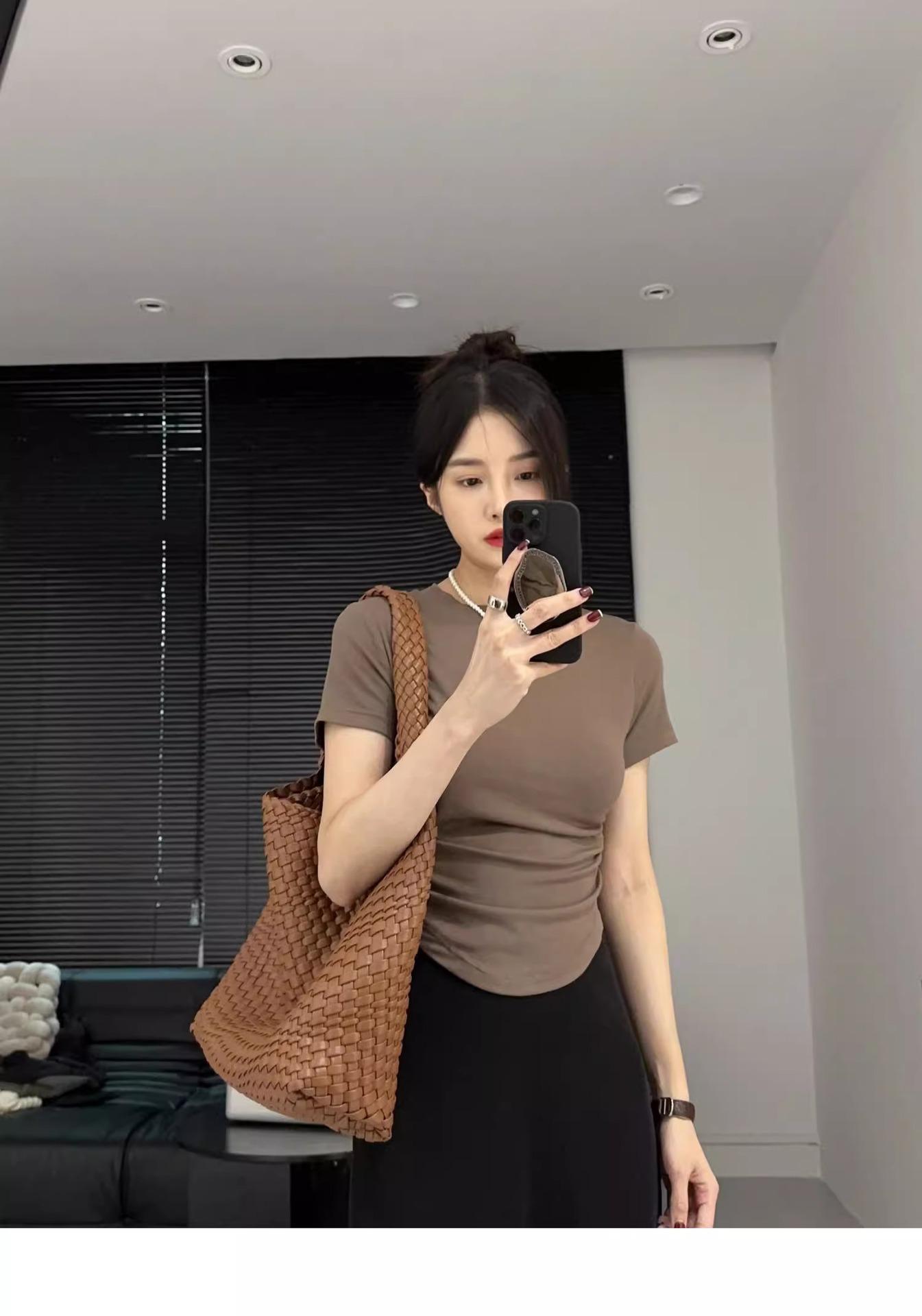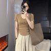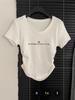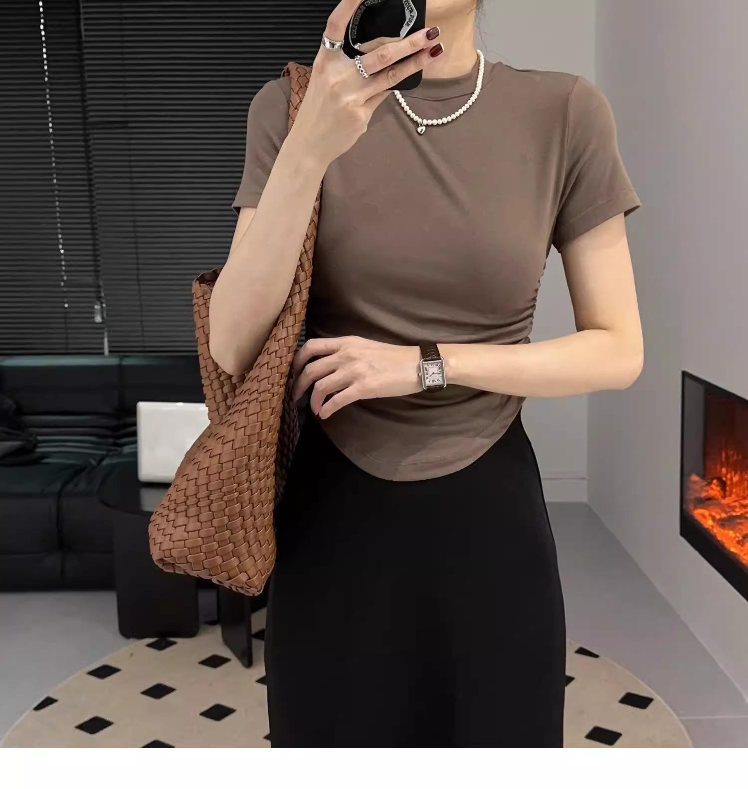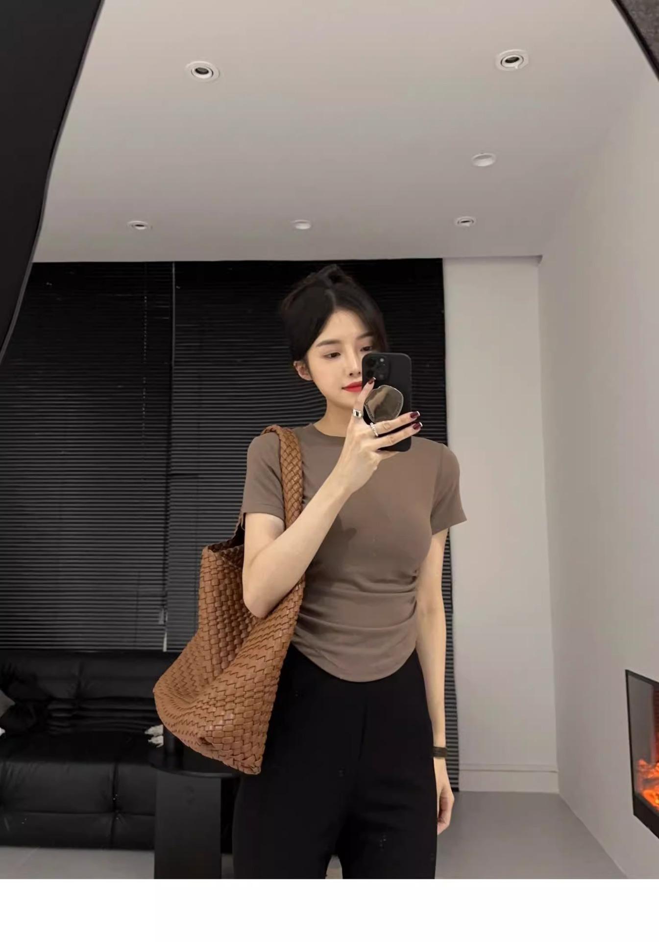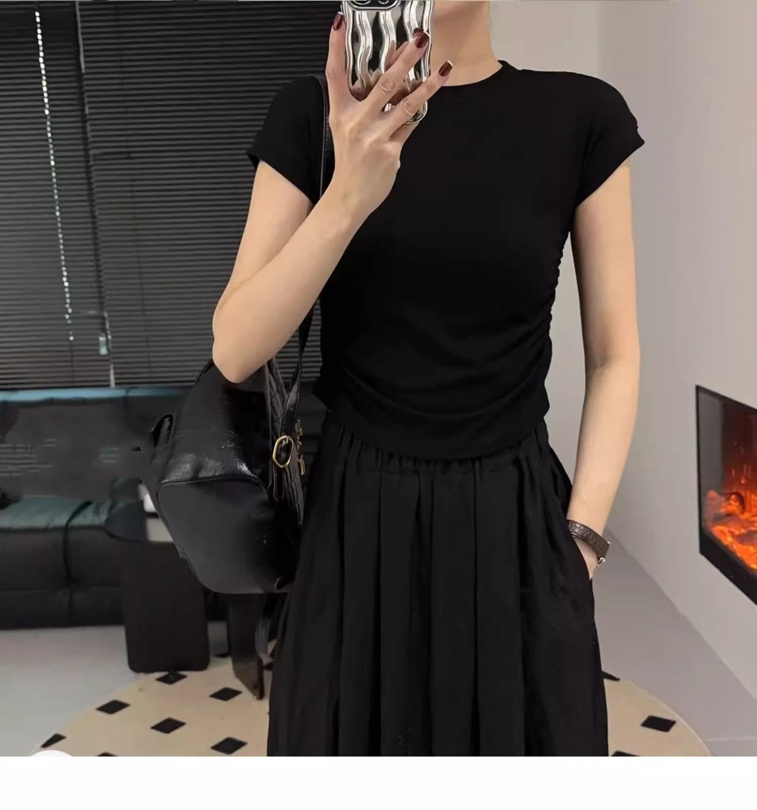 Diseño de Camiseta de Hombro Plisada Corta Irregular Verano de Chica Caliente Cuello U Manga Corta Ajustada Cintura Ceñida Top A3410