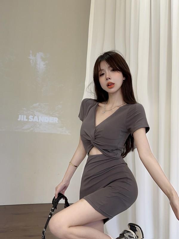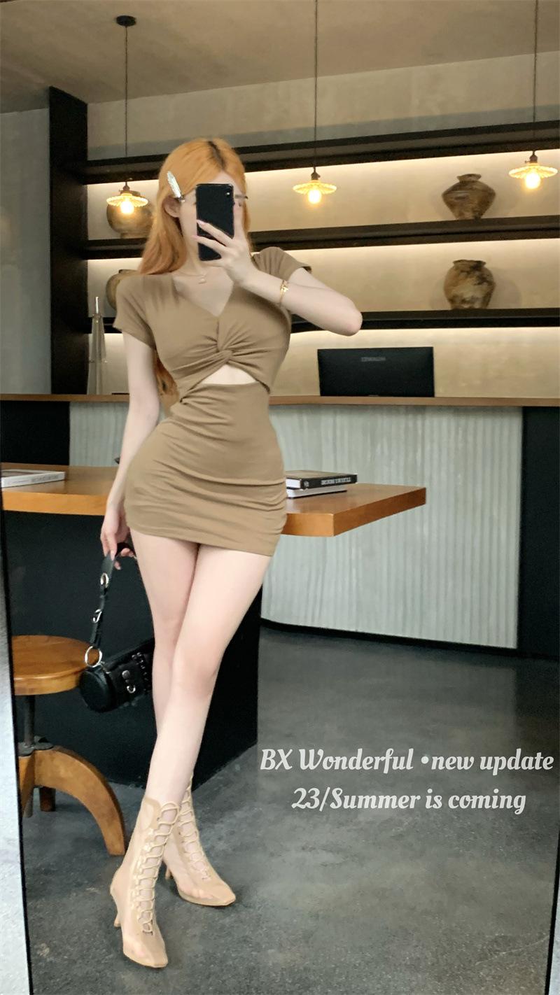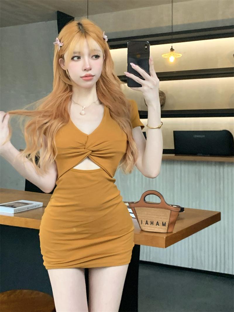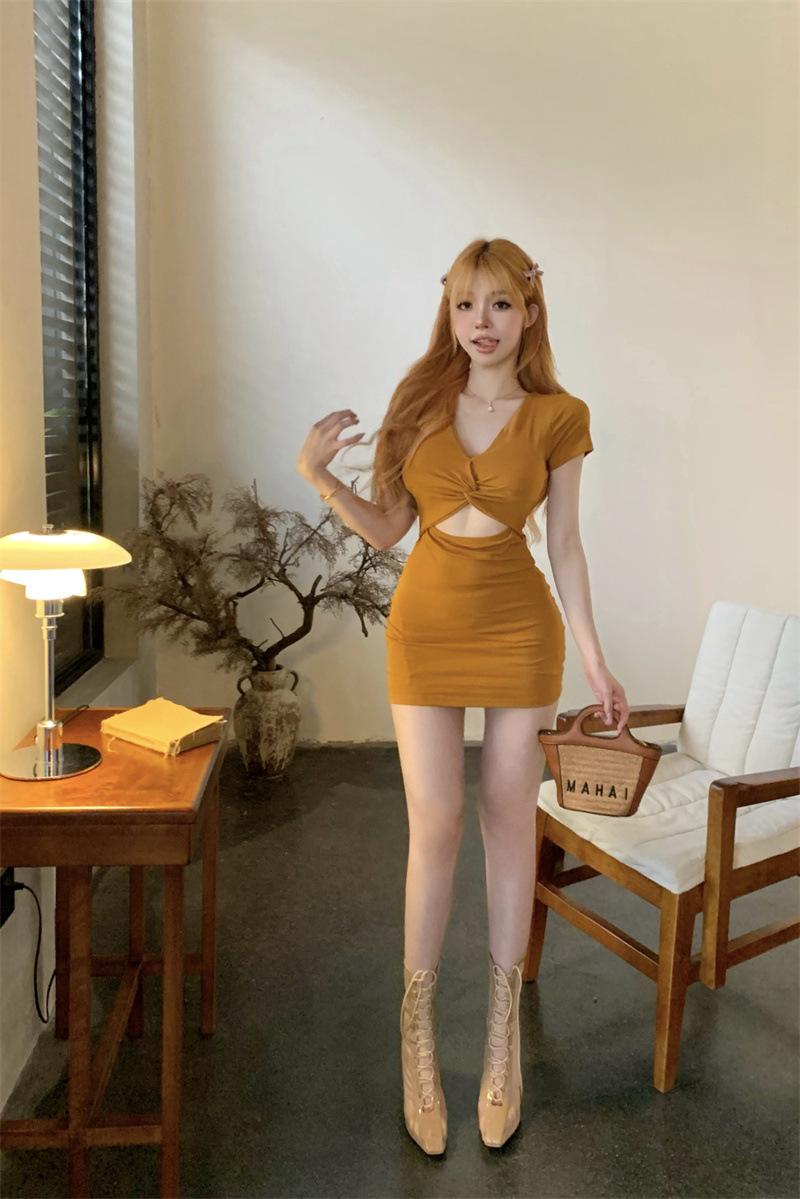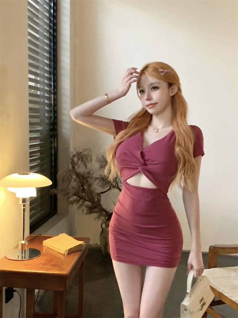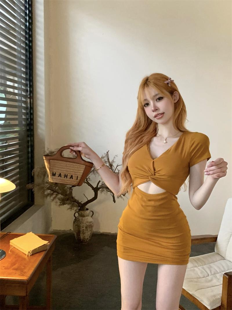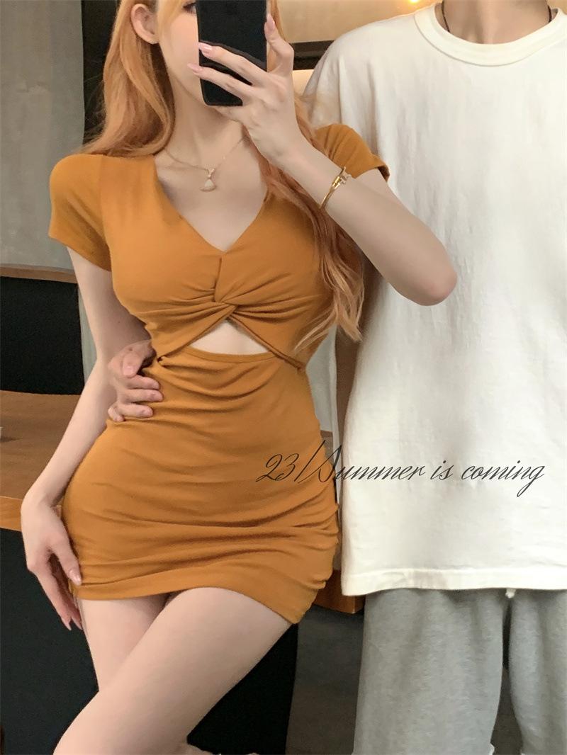 Vestido Sexy de Estilo Europeo y Americano con Cuello en V Hueco de Manga Corta para Mujer Verano Transfronterizo Petite Cuello en V Cubre Cintura Falda de Cadera