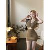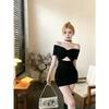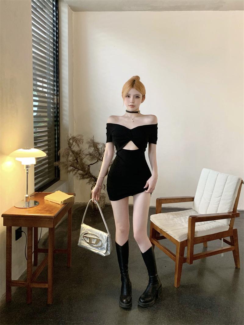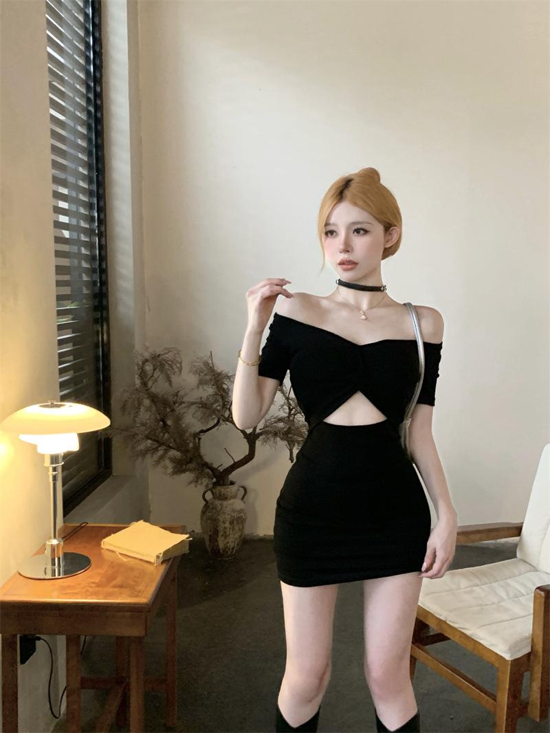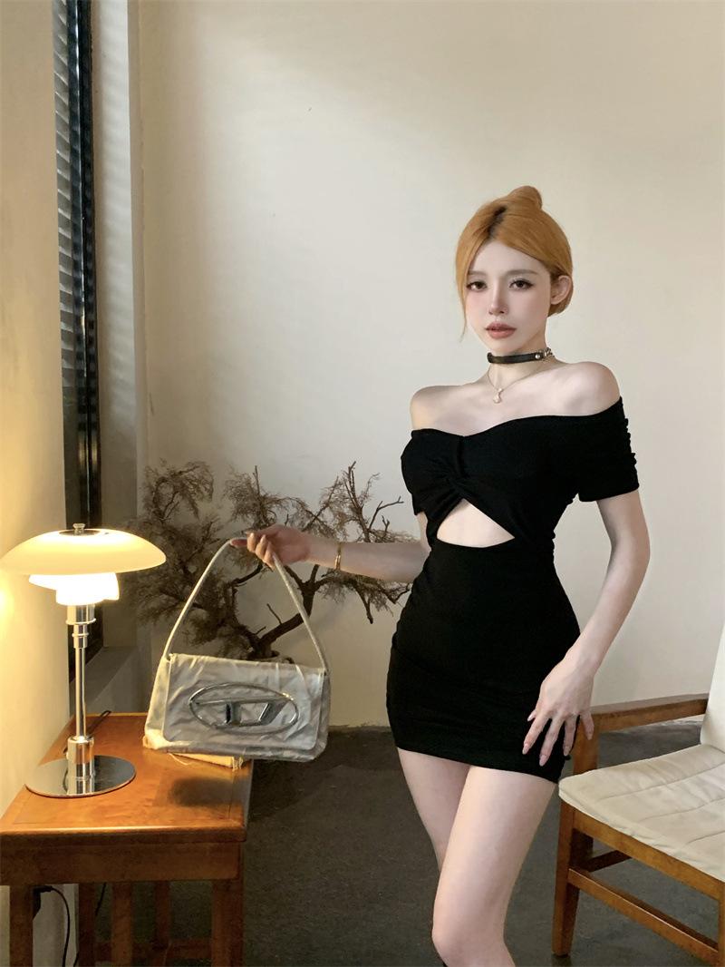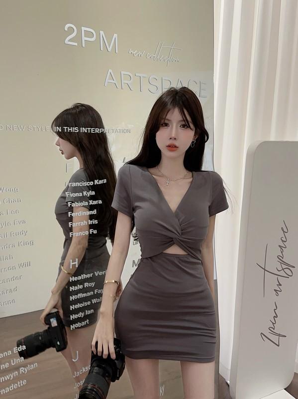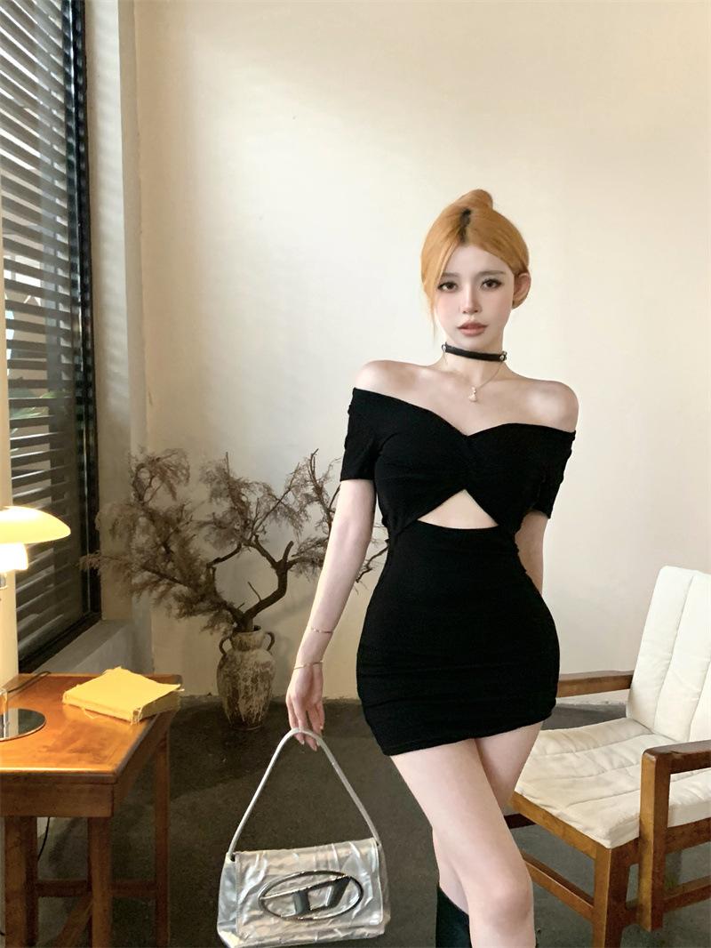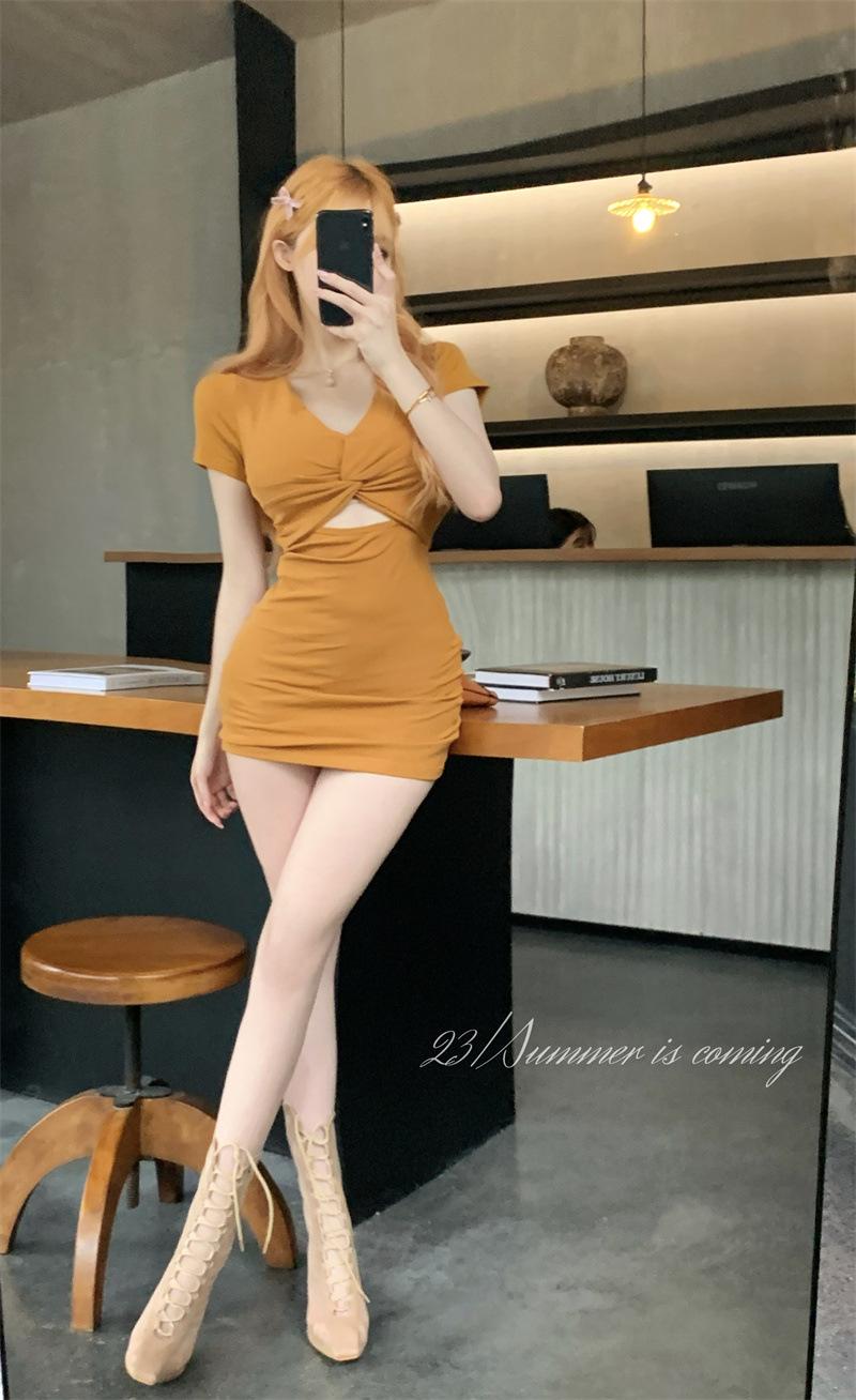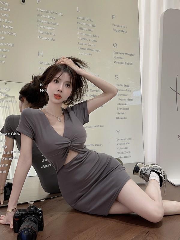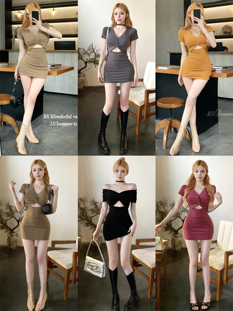 Vestido Sexy de Estilo Europeo y Americano con Cuello en V Hueco de Manga Corta para Mujer Verano Transfronterizo Petite Cuello en V Cubre Cintura Falda de Cadera