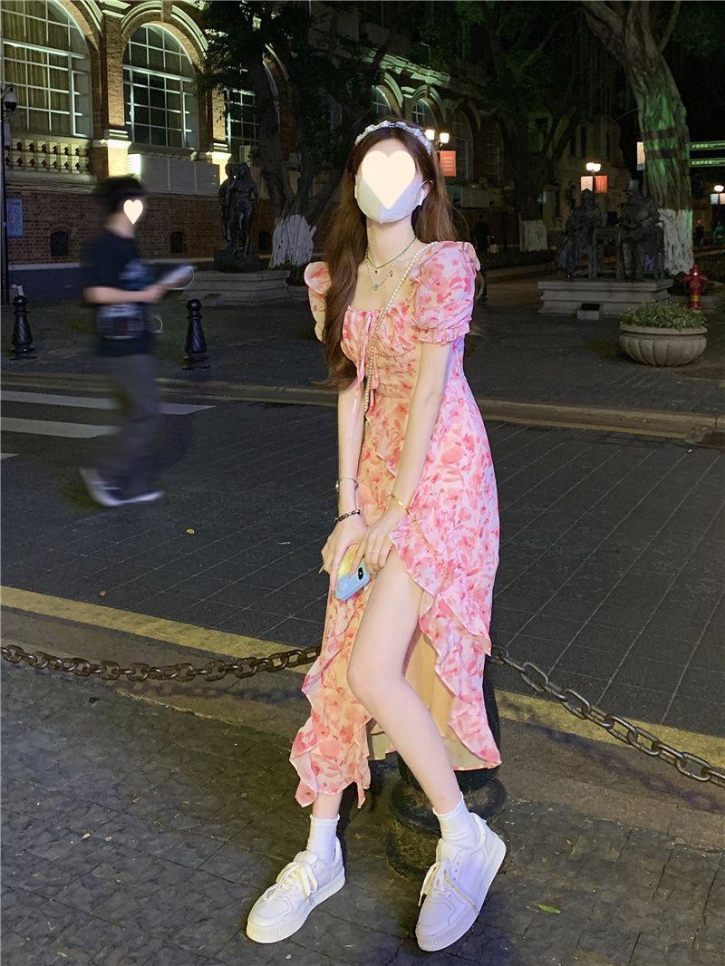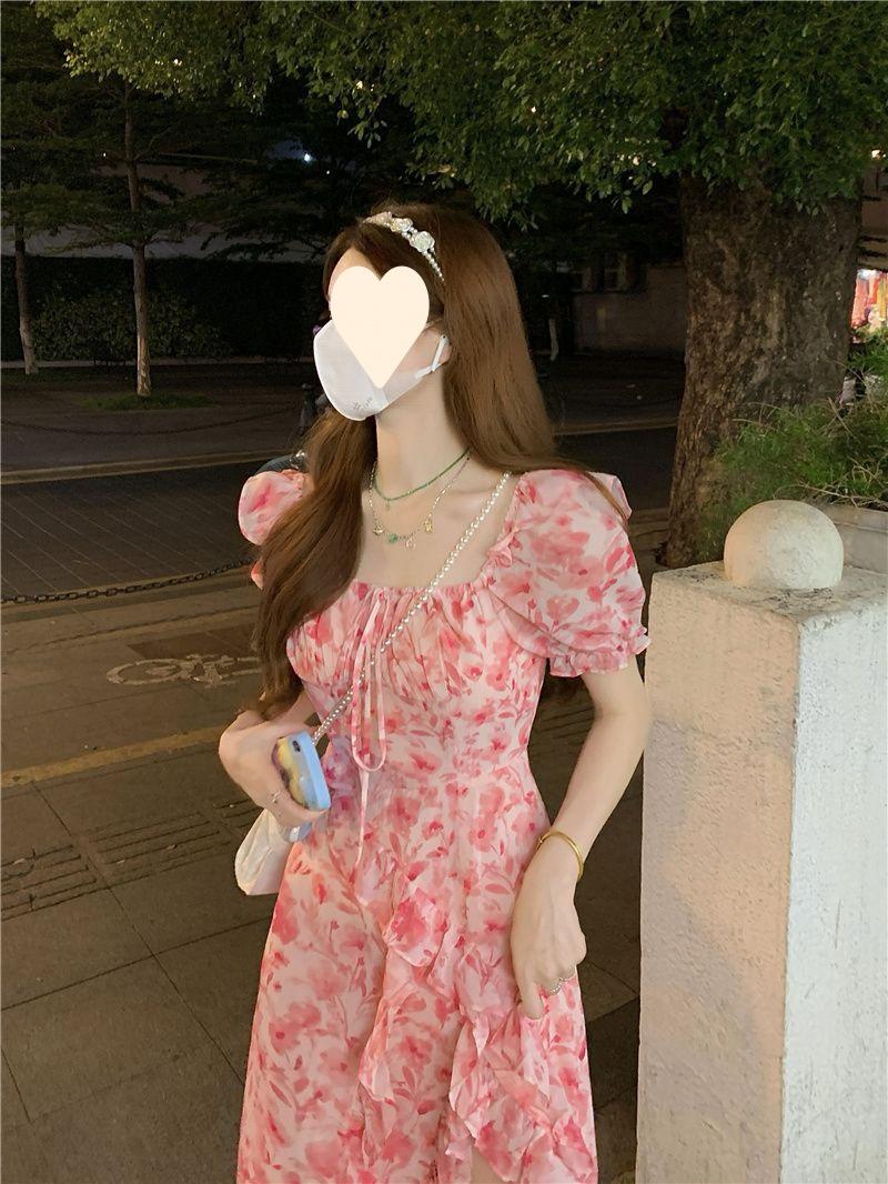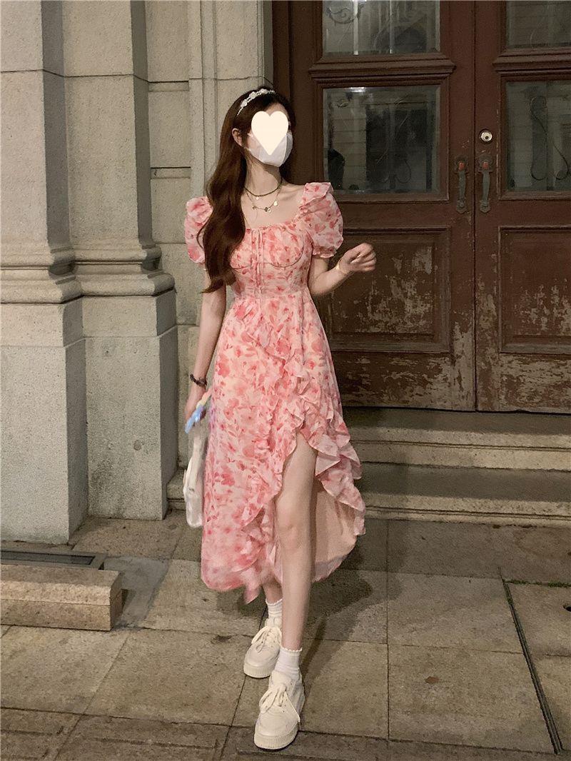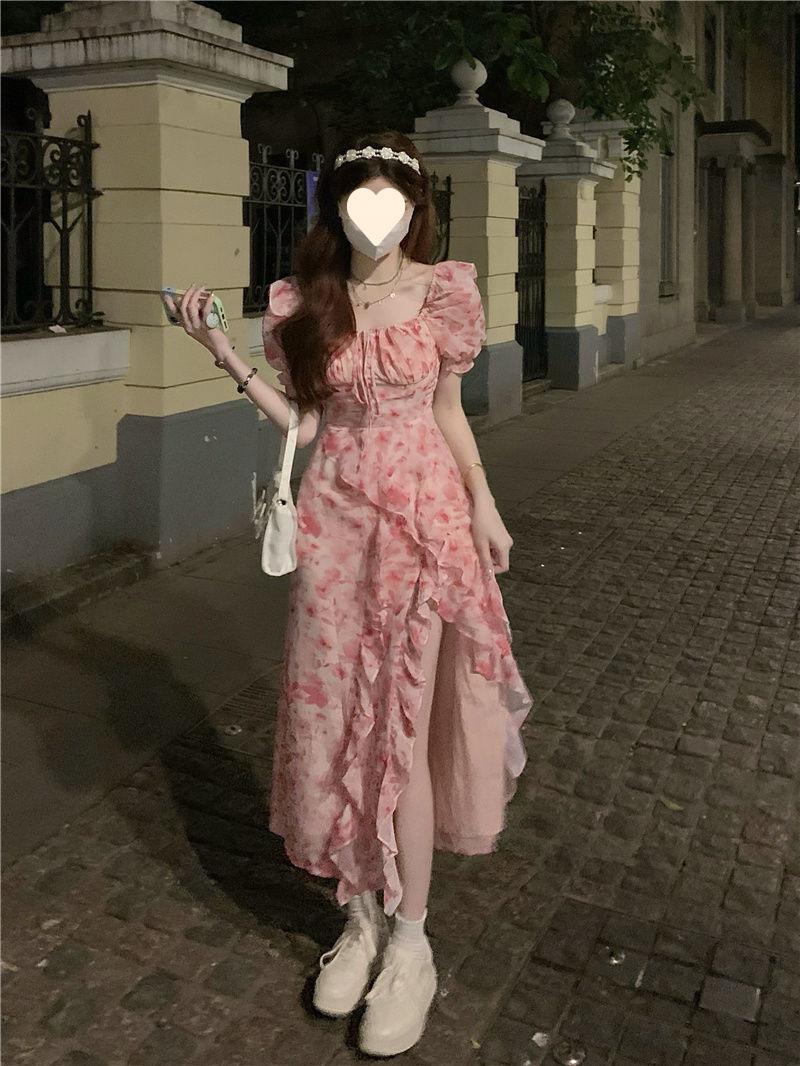 Compra Vestido floral estilo francés para mujer, de verano, talla grande, estilo suave, para chica gordita, cintura ajustada, adelgazante, con volantes, falda larga dividida al por mayor en Joom.pro