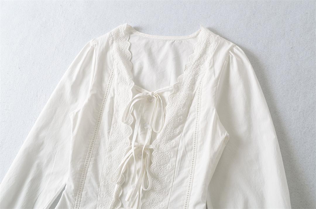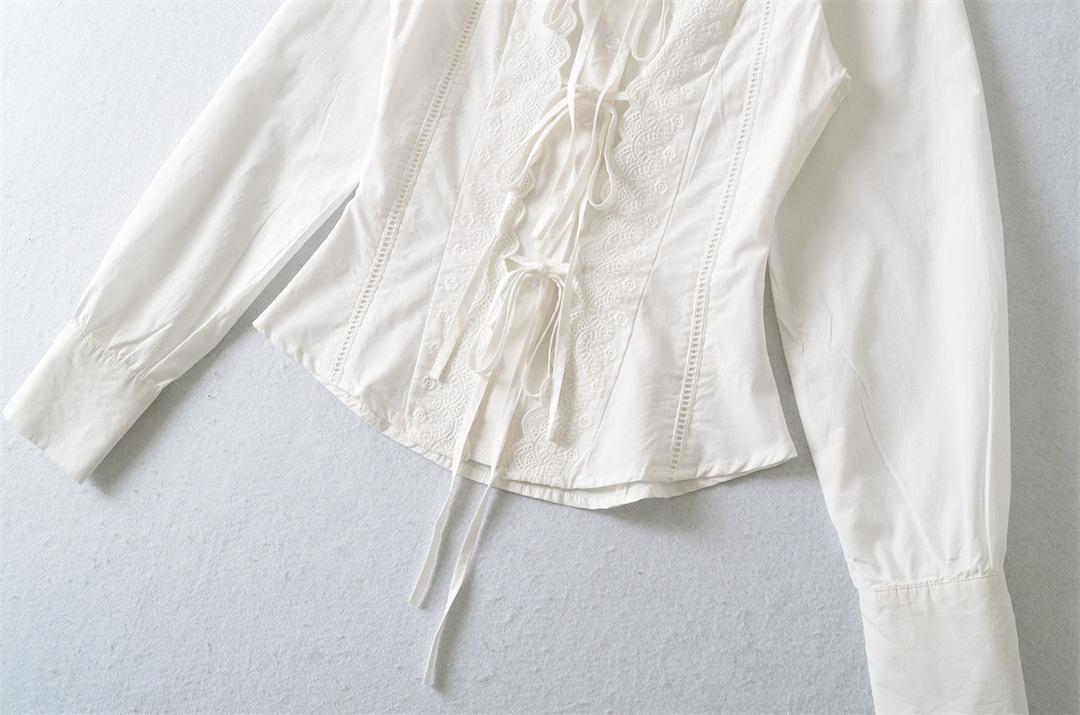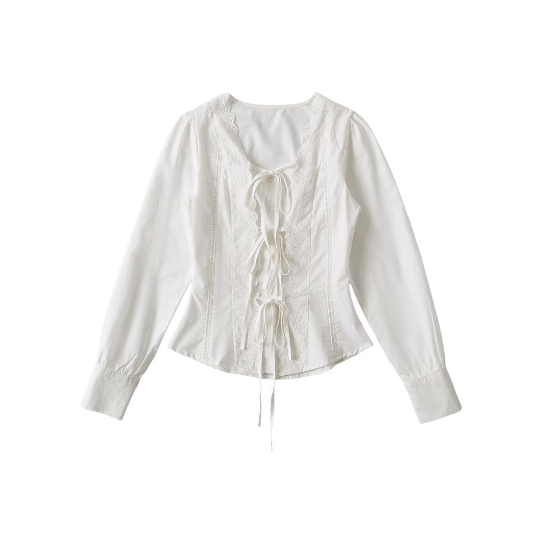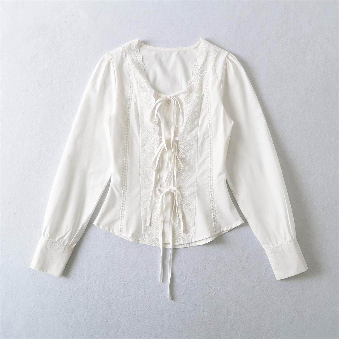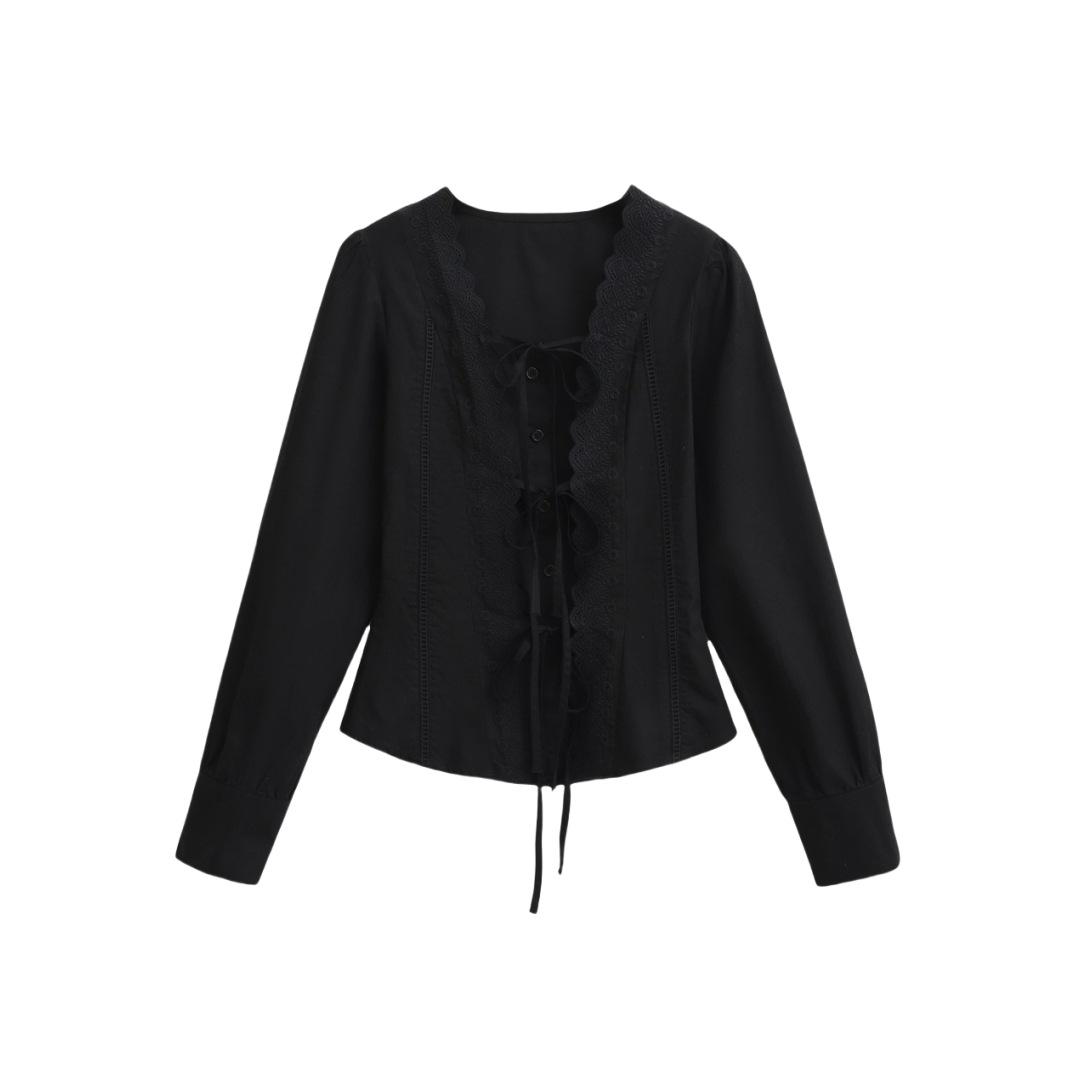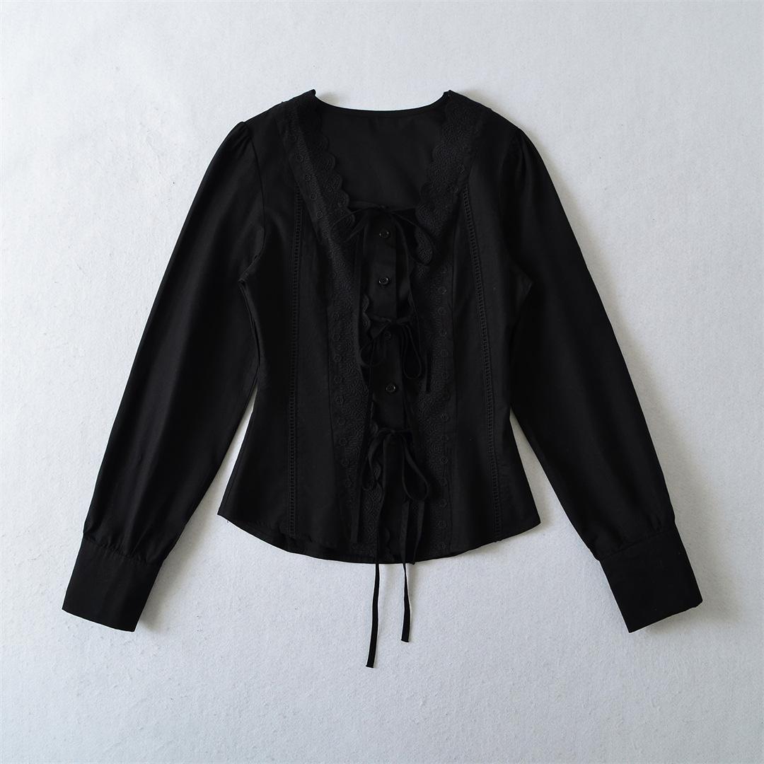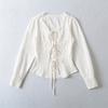 Compra Camisa de Manga Larga con Cuello de Encaje de Color Sólido Diseño para Mujer Chica Sexy Pecho Frente con Cordones Cintura Curvada Dulce Top Pulóver al por mayor en Joom.pro