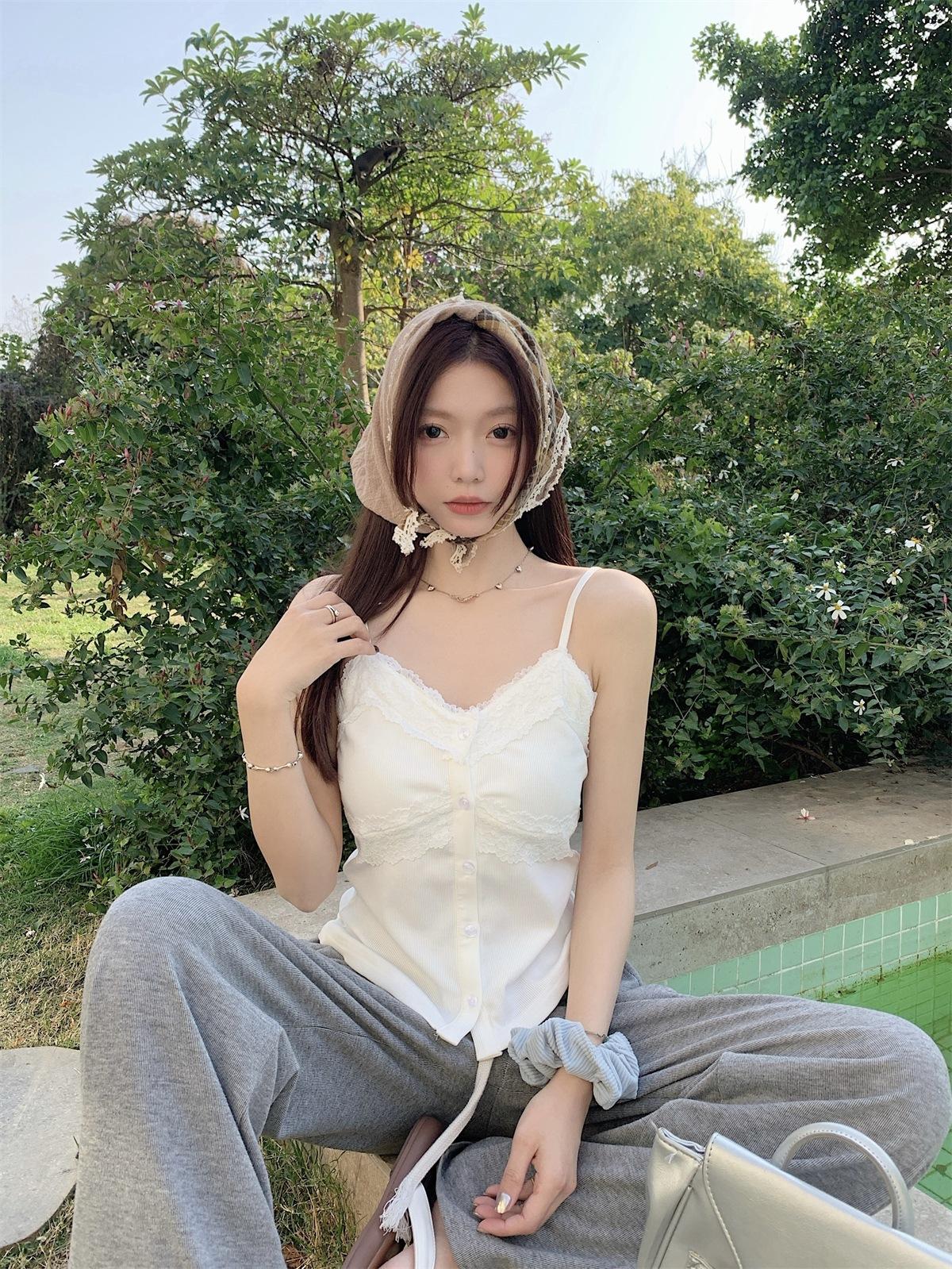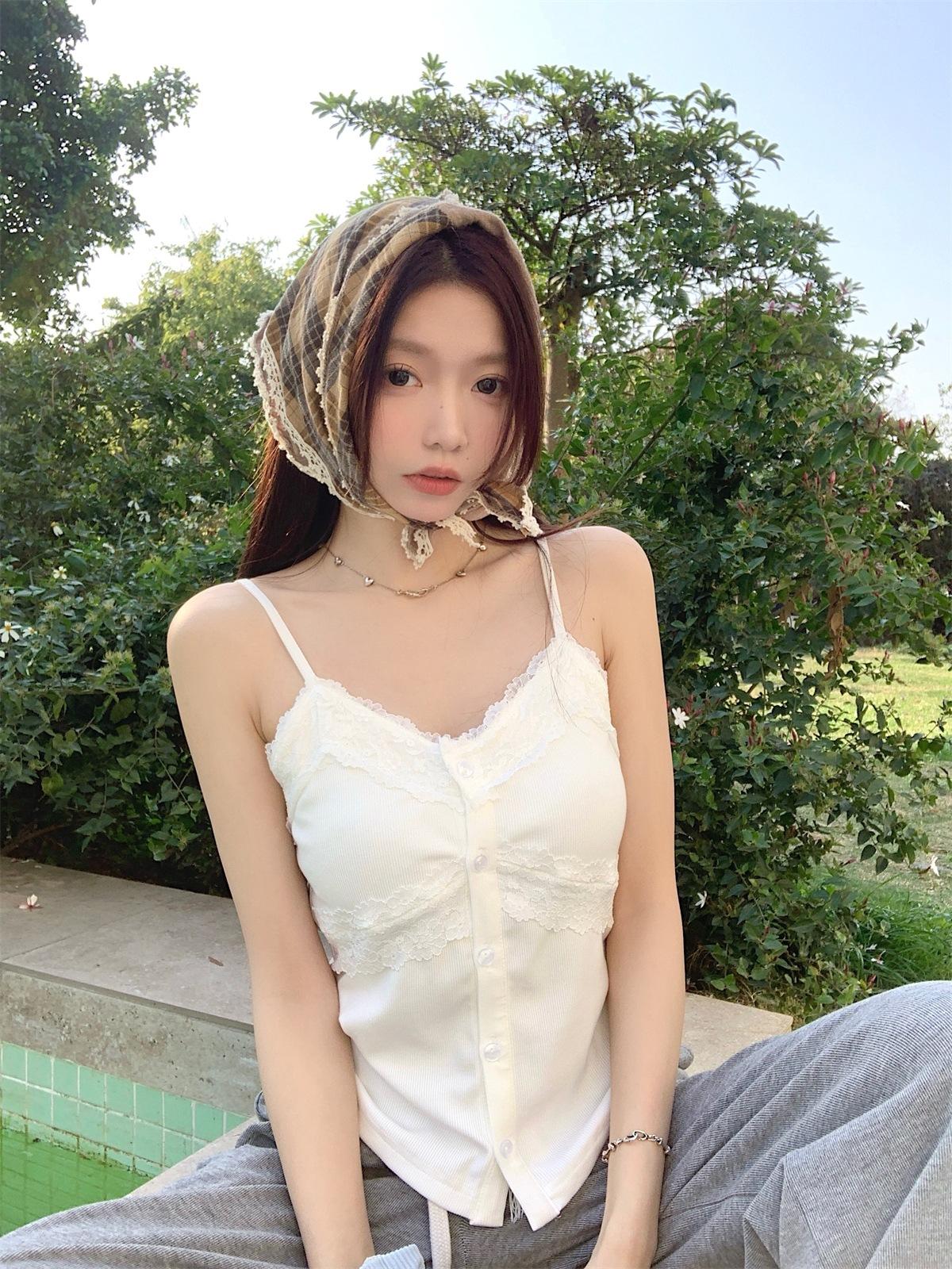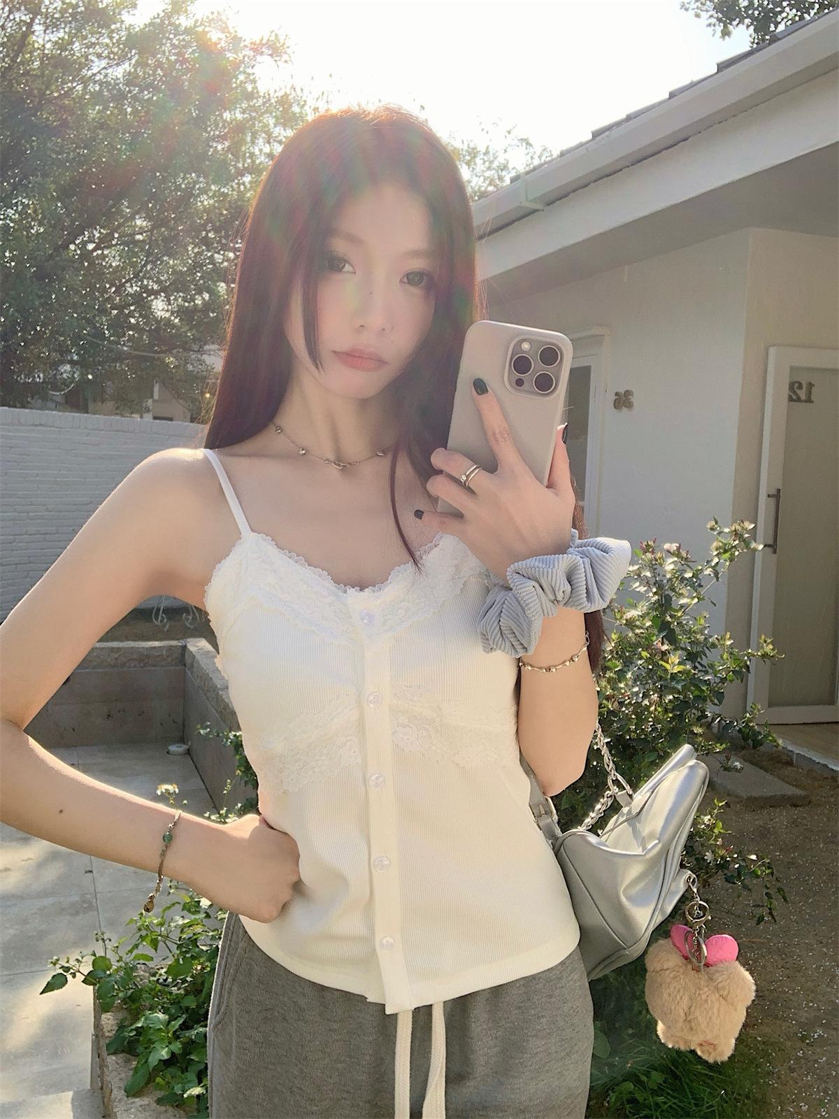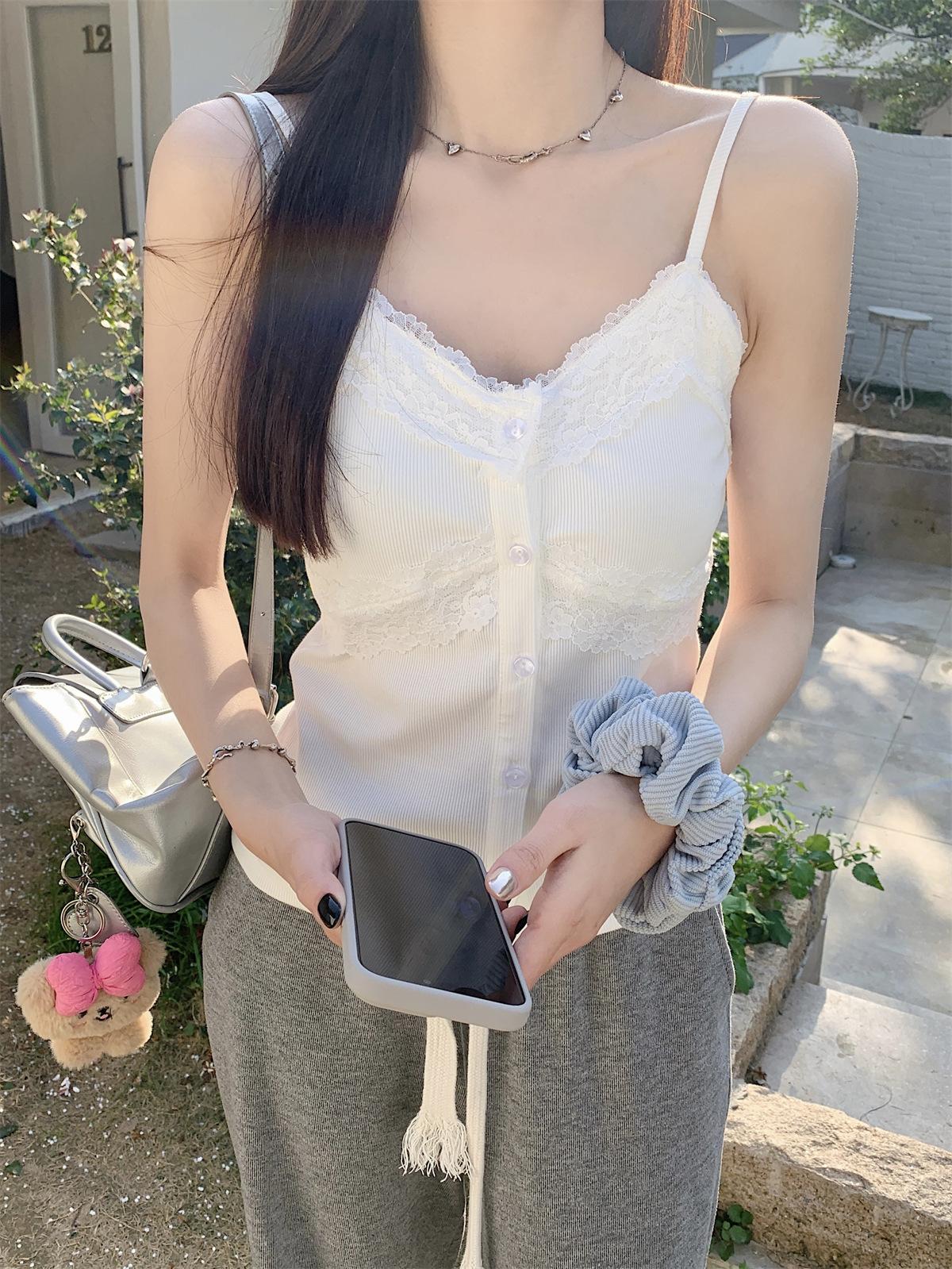 Foto real verano 2025 estilo coreano encaje puro botonadura sencilla tirante ajustable top camisola blanco