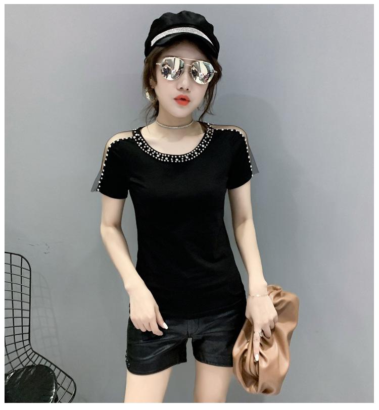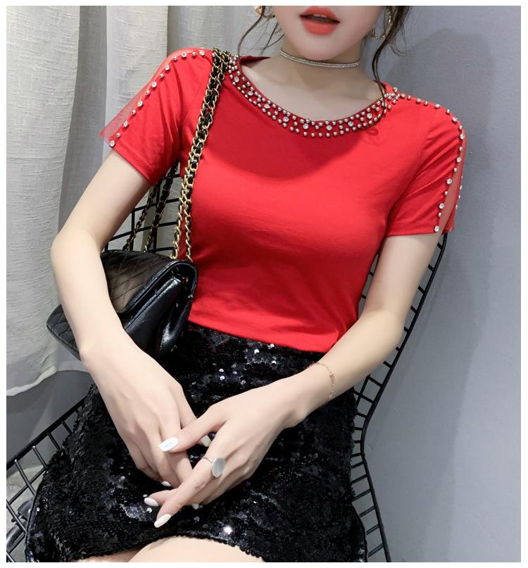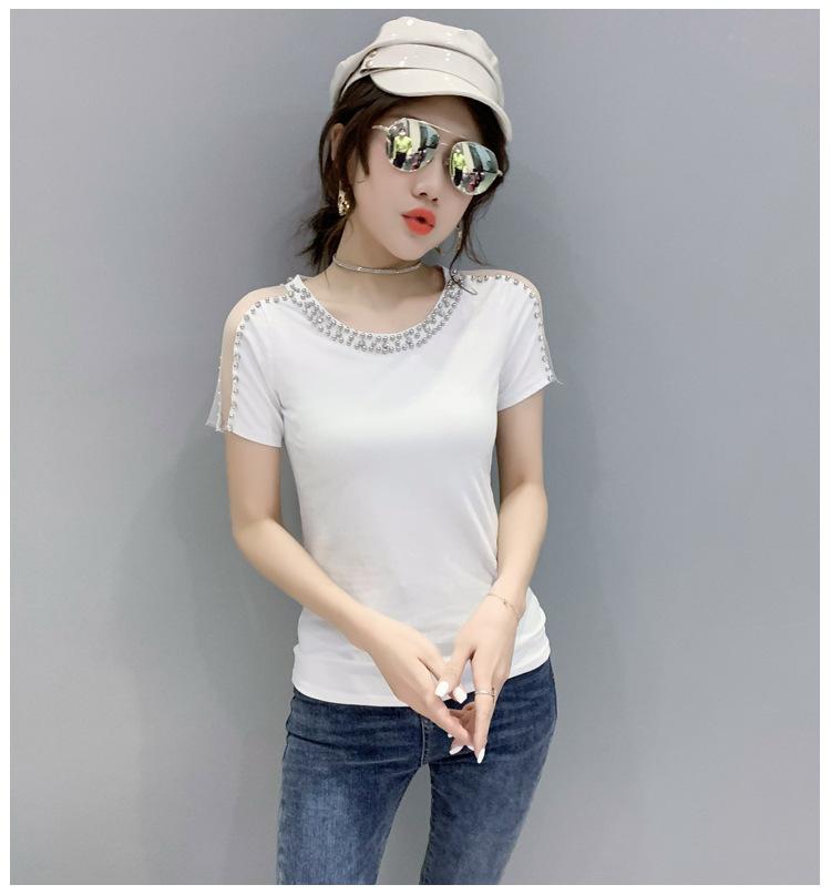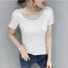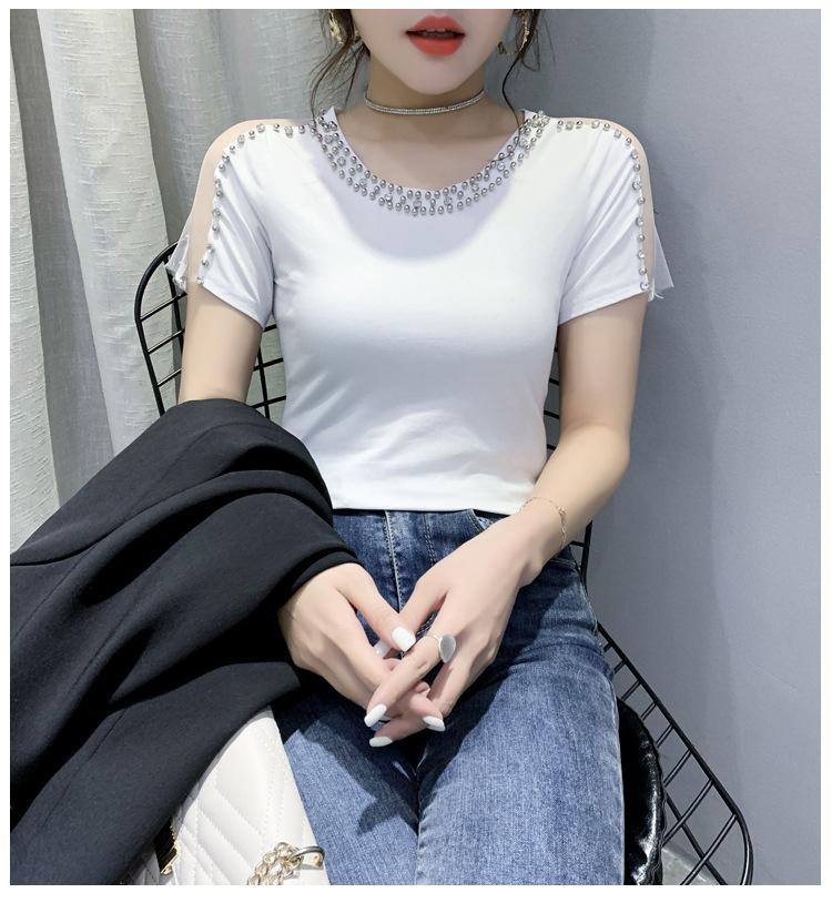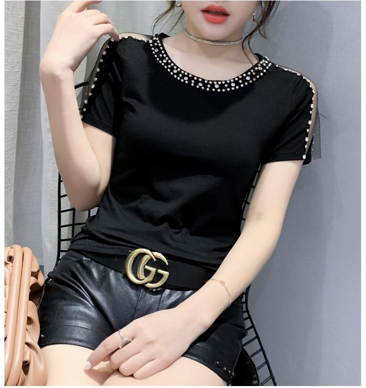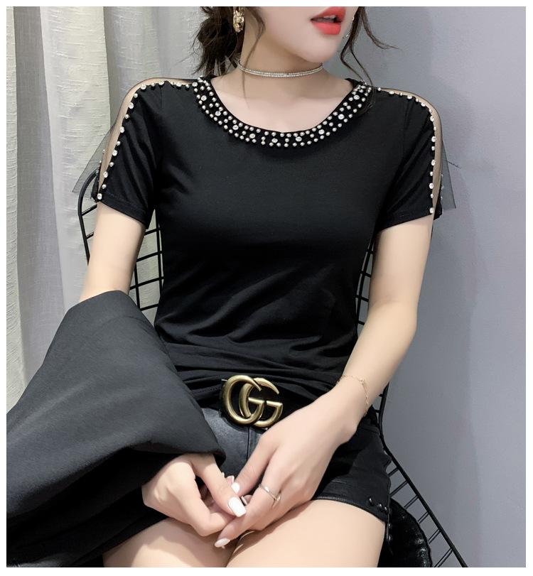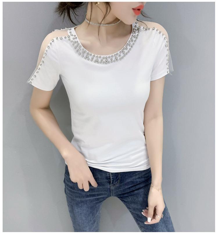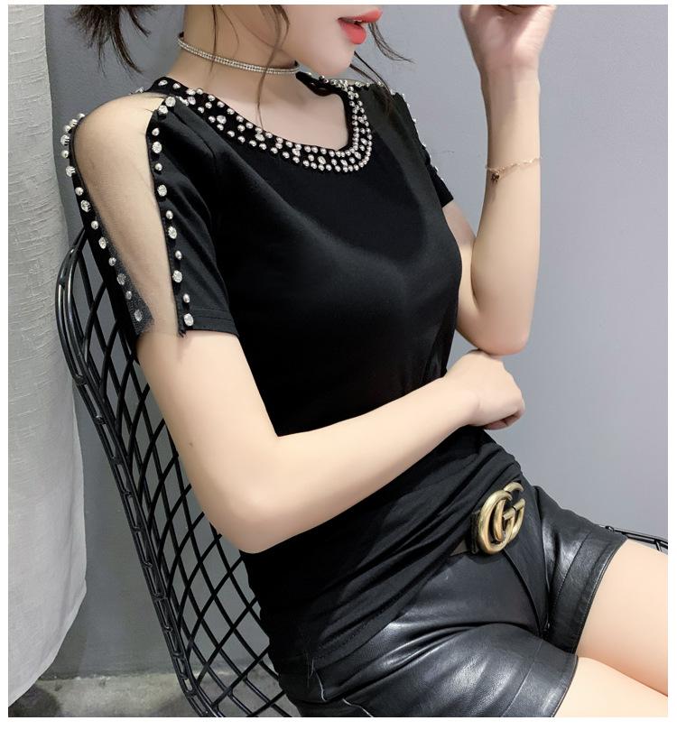 Camiseta sexy de malla con costuras para mujer, de manga corta, diseño de verano 2025, elegante y a la moda con cuentas, camisa pequeña que combina con todo.