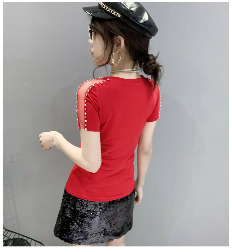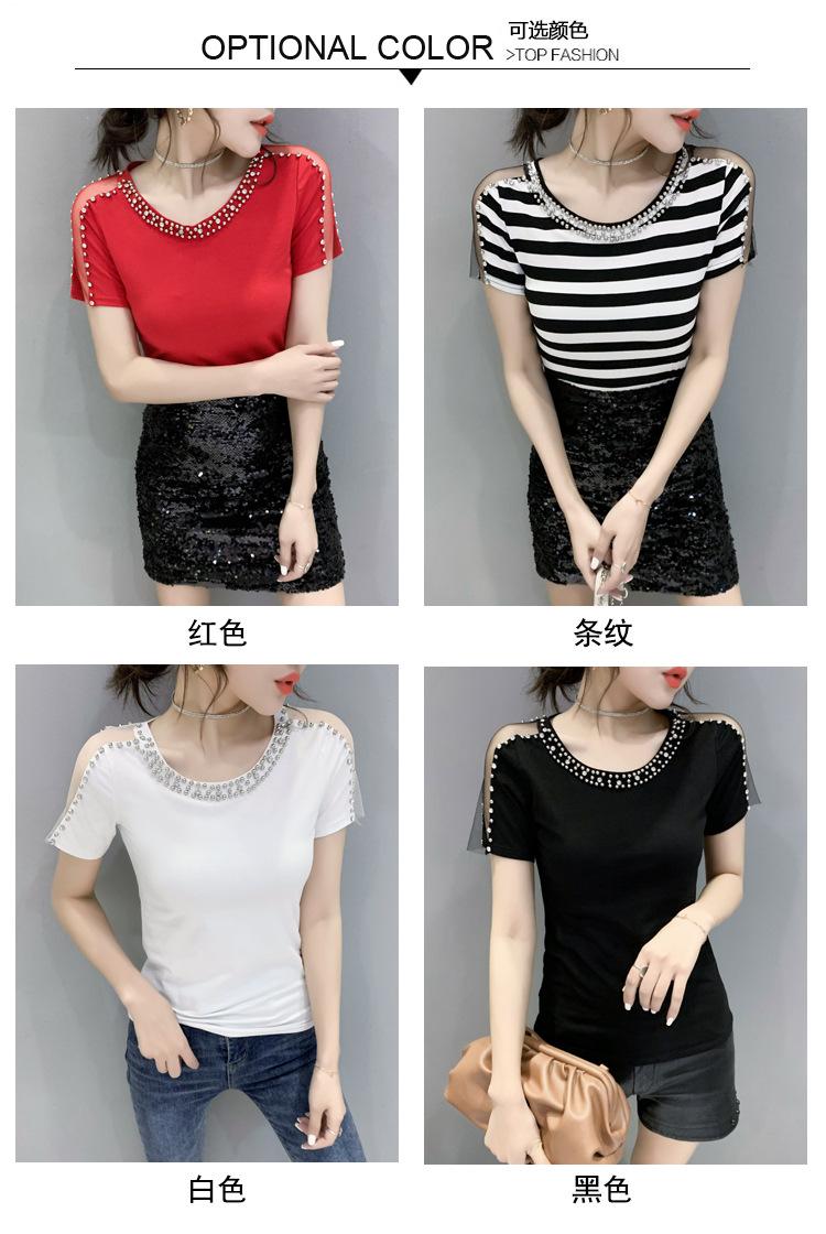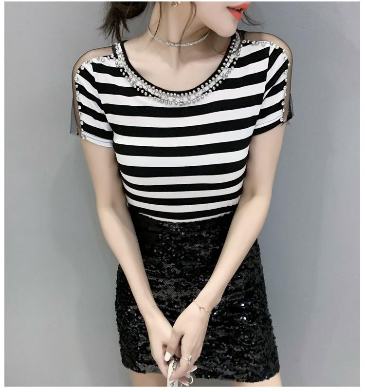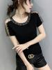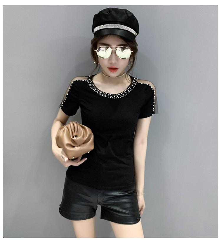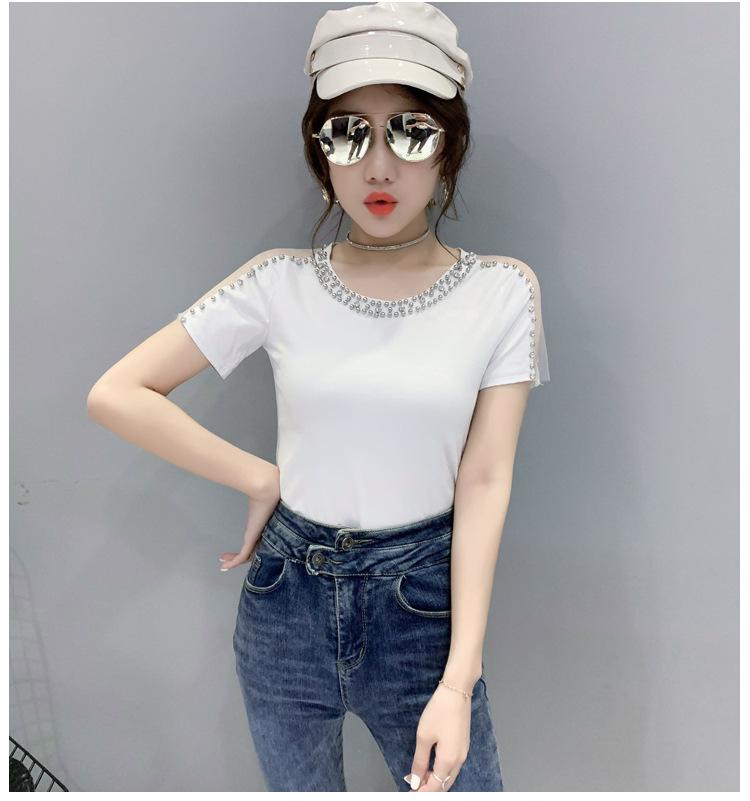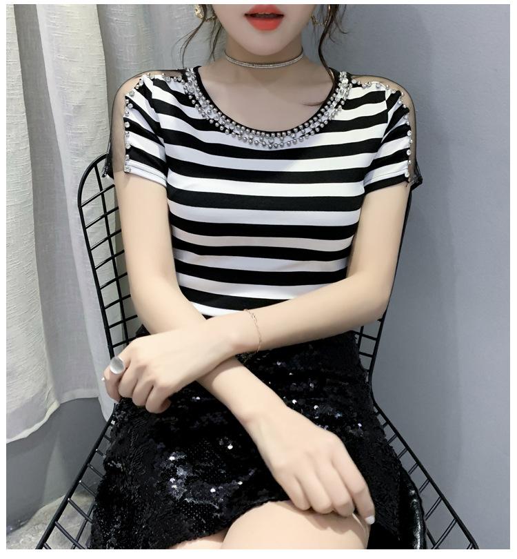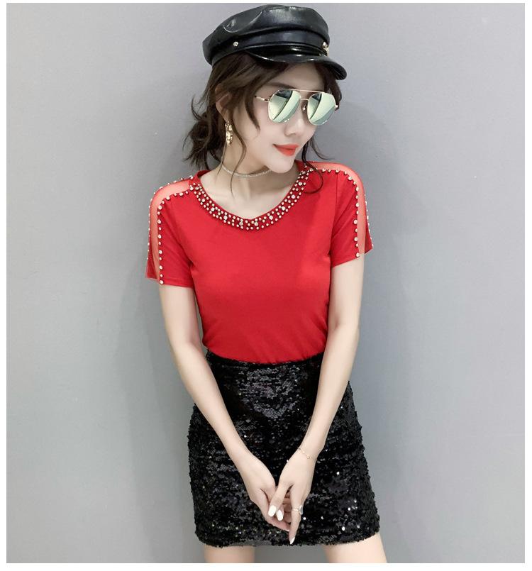 Camiseta sexy de malla con costuras para mujer, de manga corta, diseño de verano 2025, elegante y a la moda con cuentas, camisa pequeña que combina con todo.