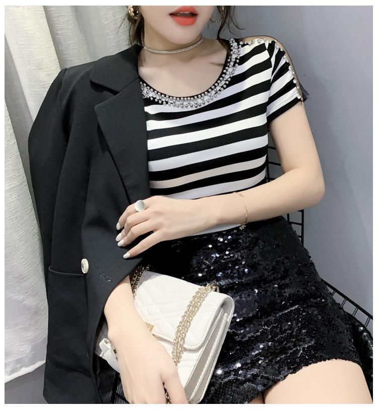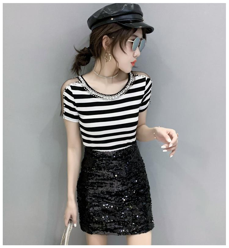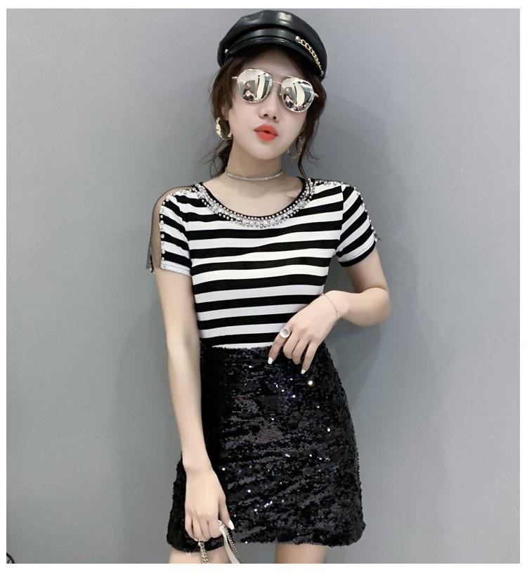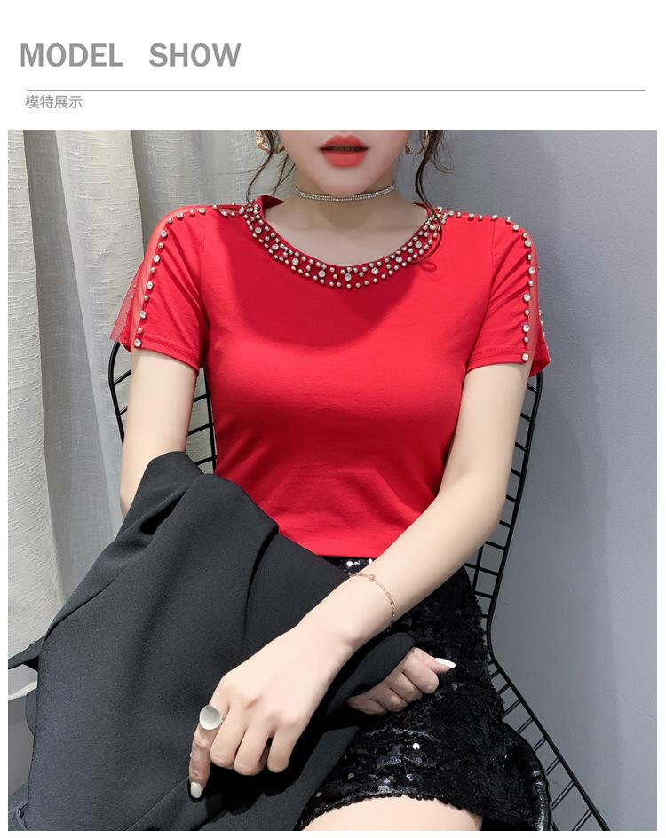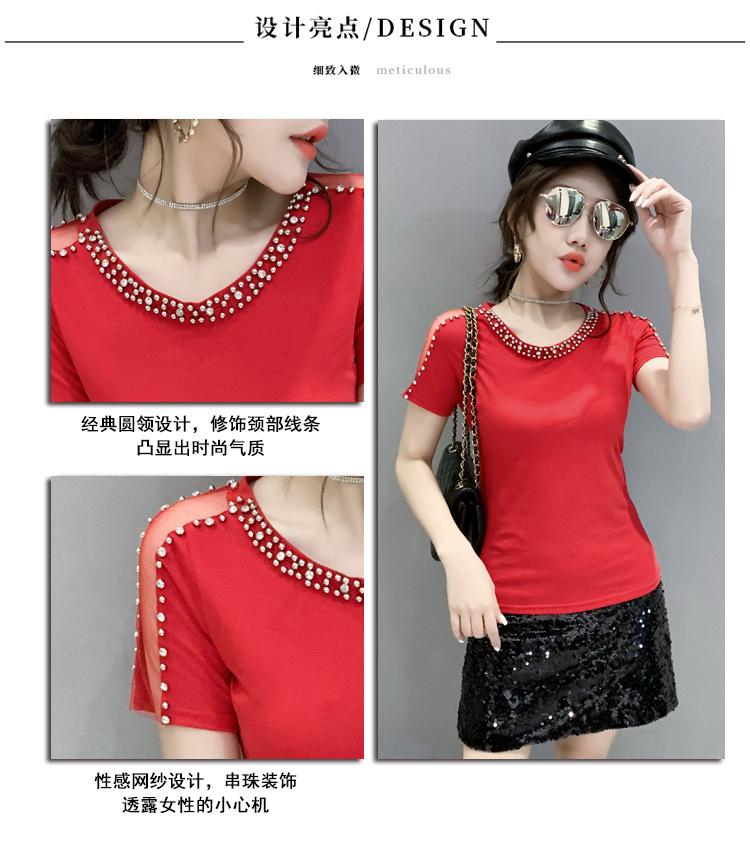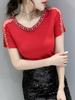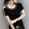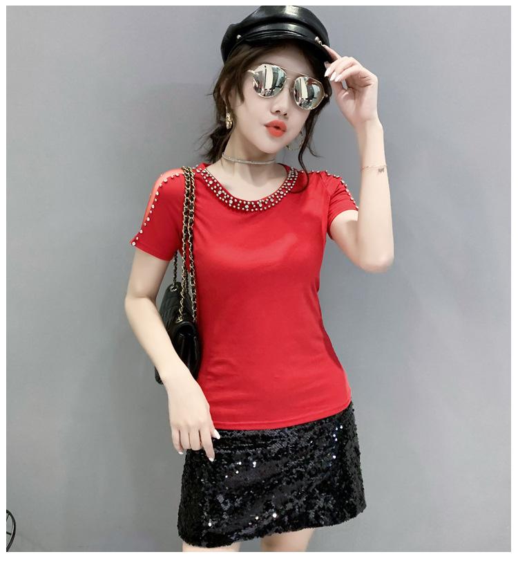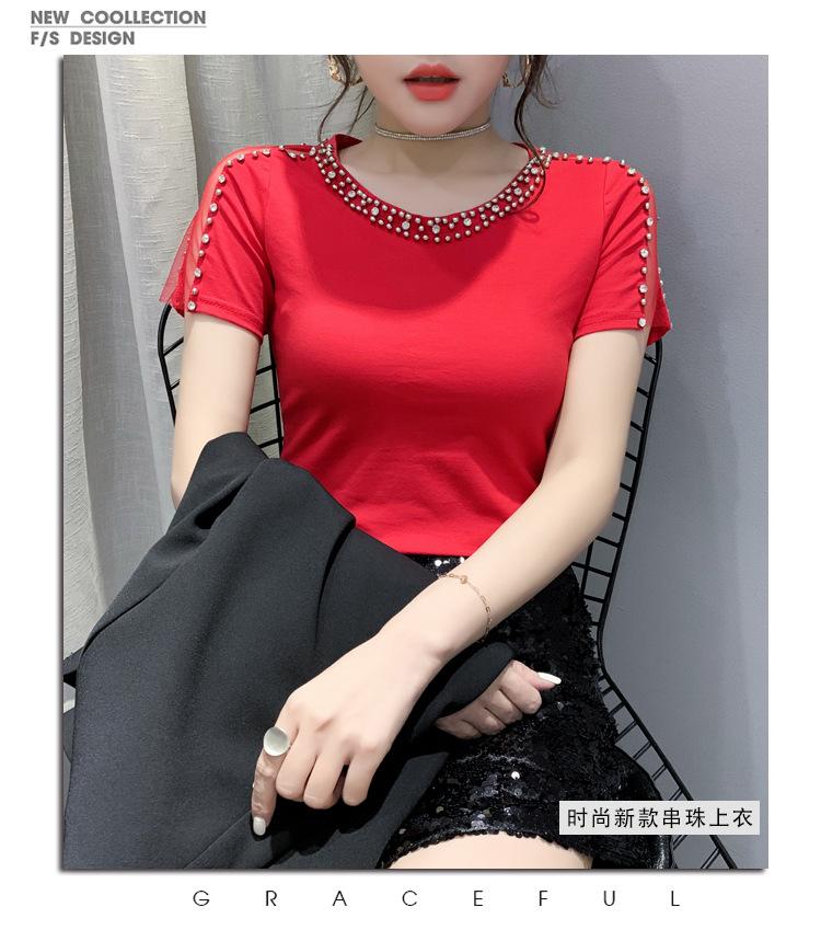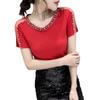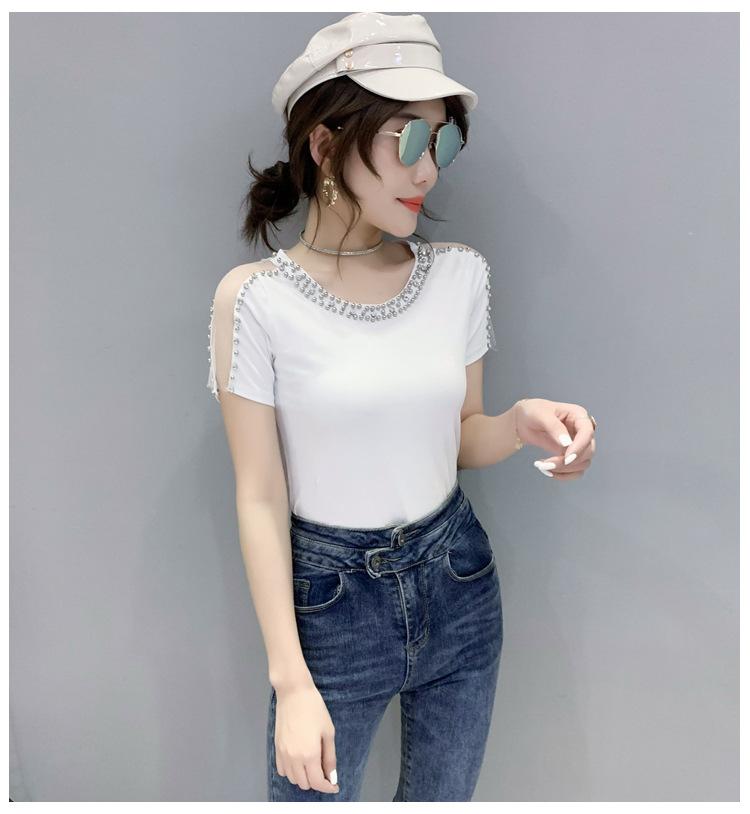 Camiseta sexy de malla con costuras para mujer, de manga corta, diseño de verano 2025, elegante y a la moda con cuentas, camisa pequeña que combina con todo.