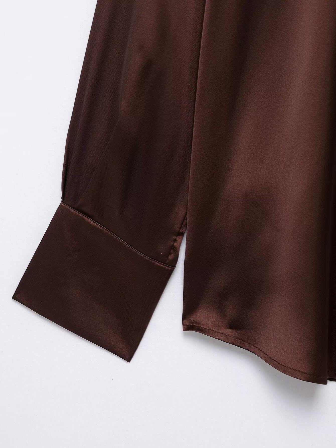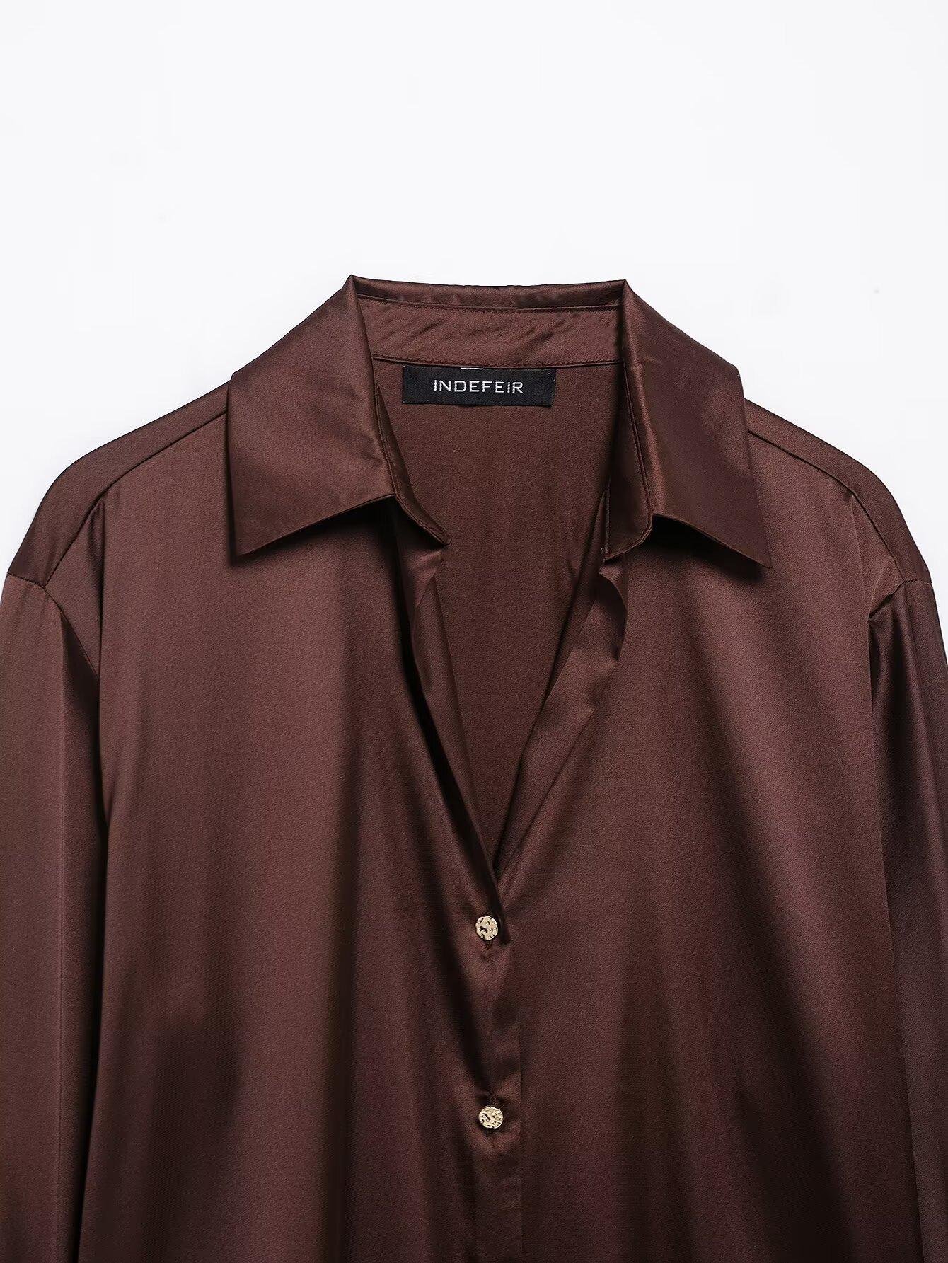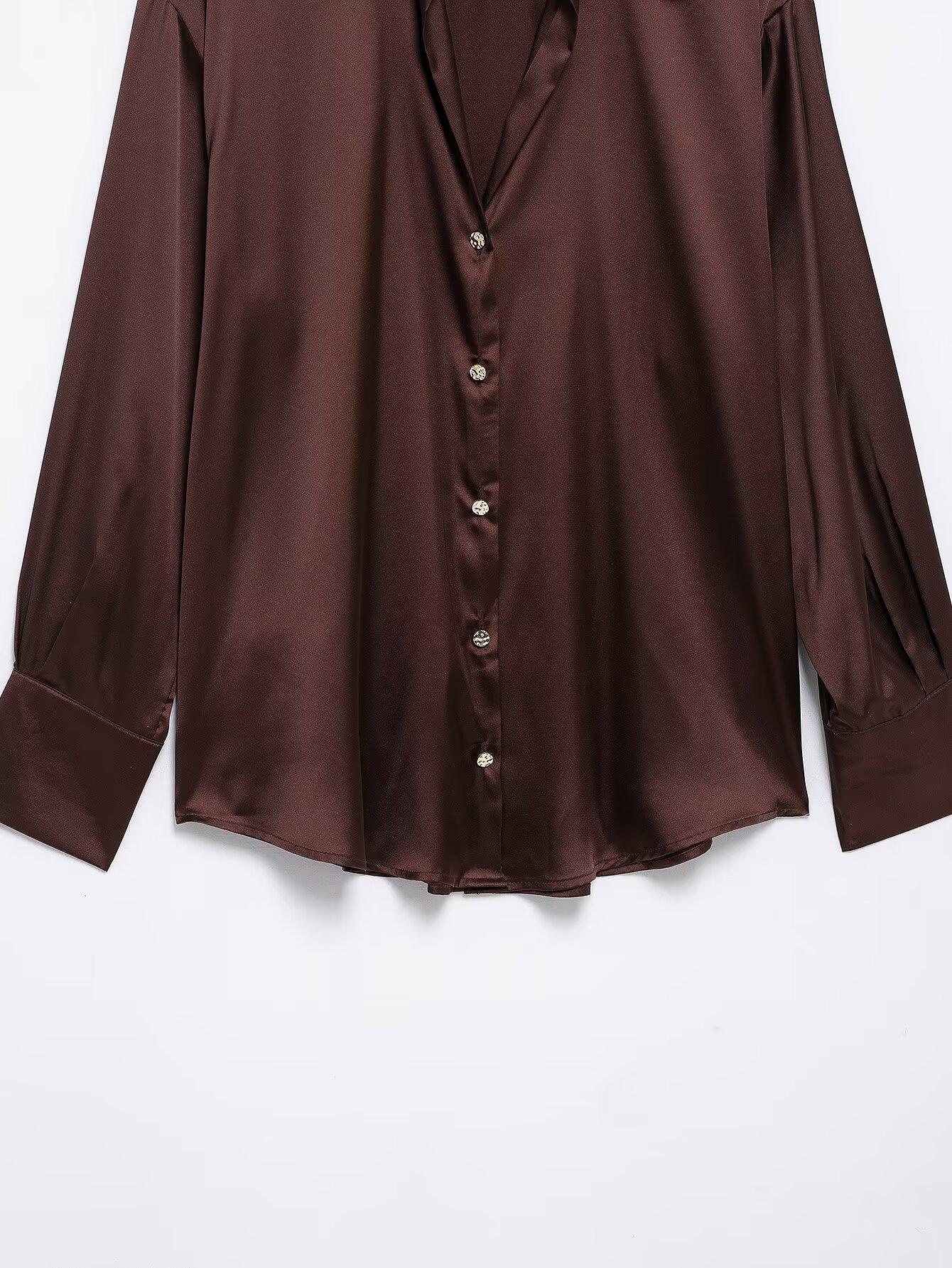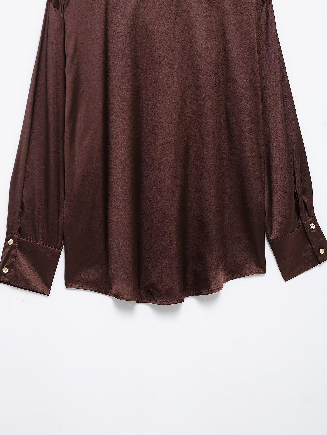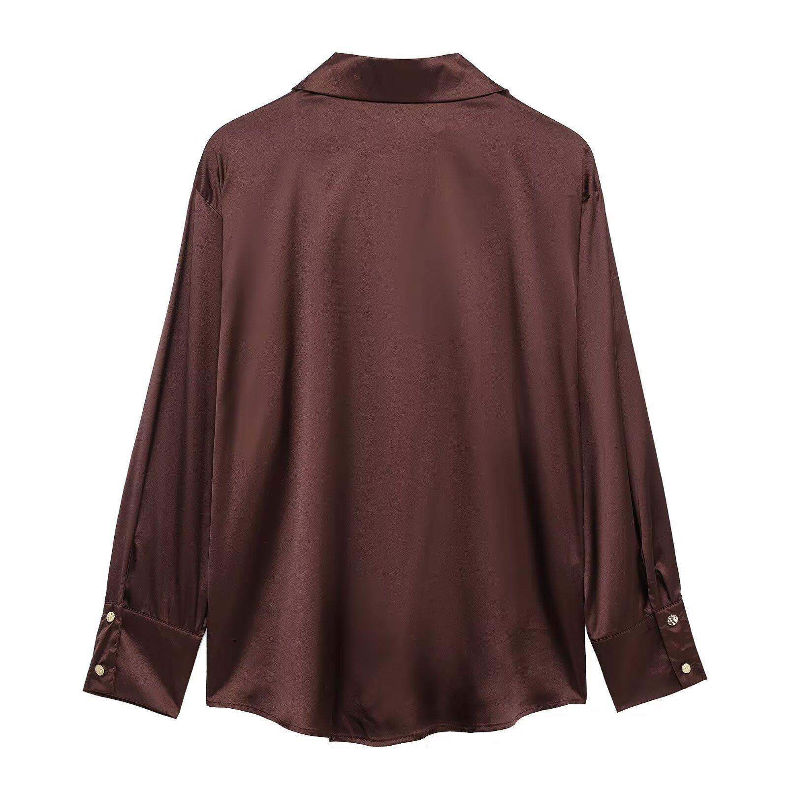 Camisa de satén de seda de manga larga con solapa de color liso, holgada, para mujer europea y americana, primavera 2025