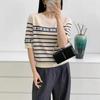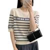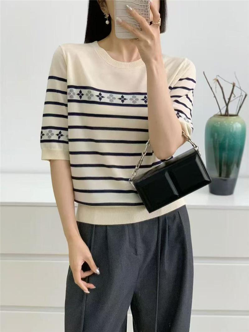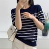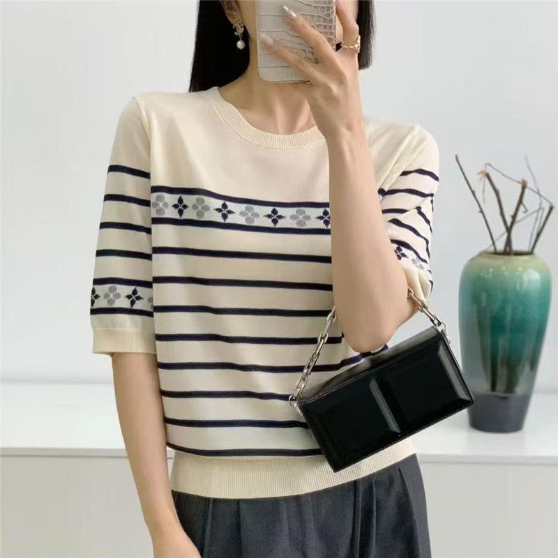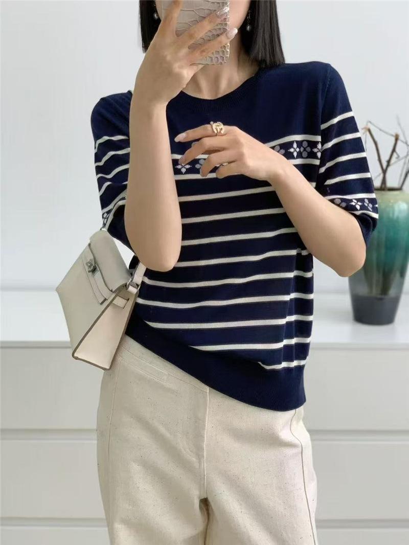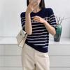 Compra Camiseta de Punto de Manga Corta a Rayas Azul Marino para Mujer, Delgada de Verano, Nuevo Diseño con Sentido Socialité Elegante, Camisa Pequeña Top Trendy al por mayor en Joom.pro
