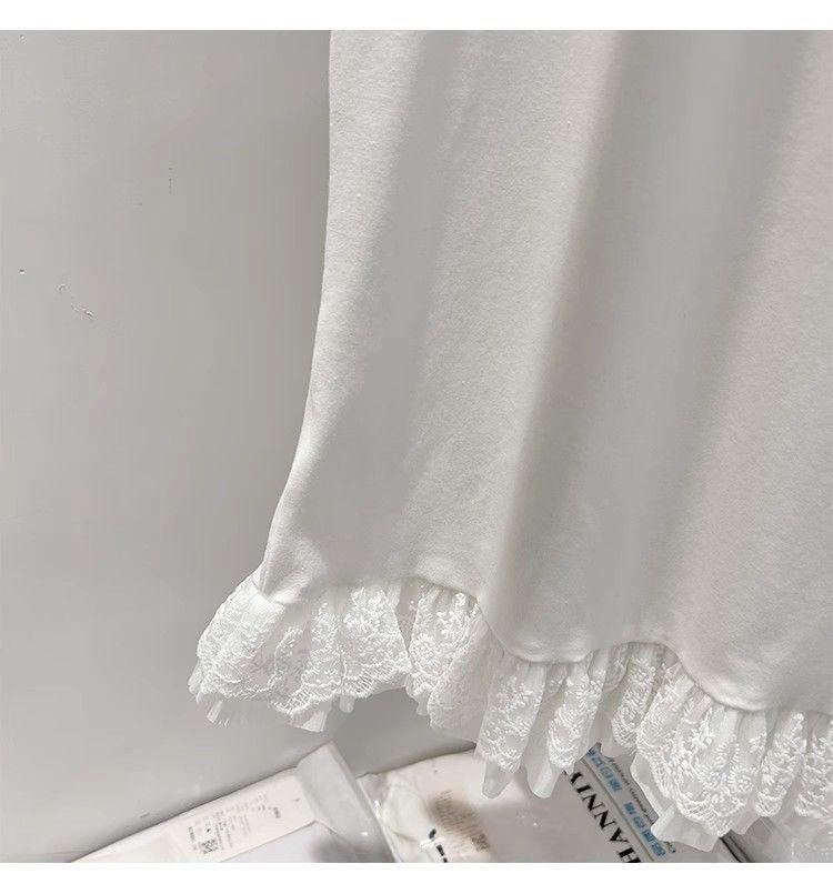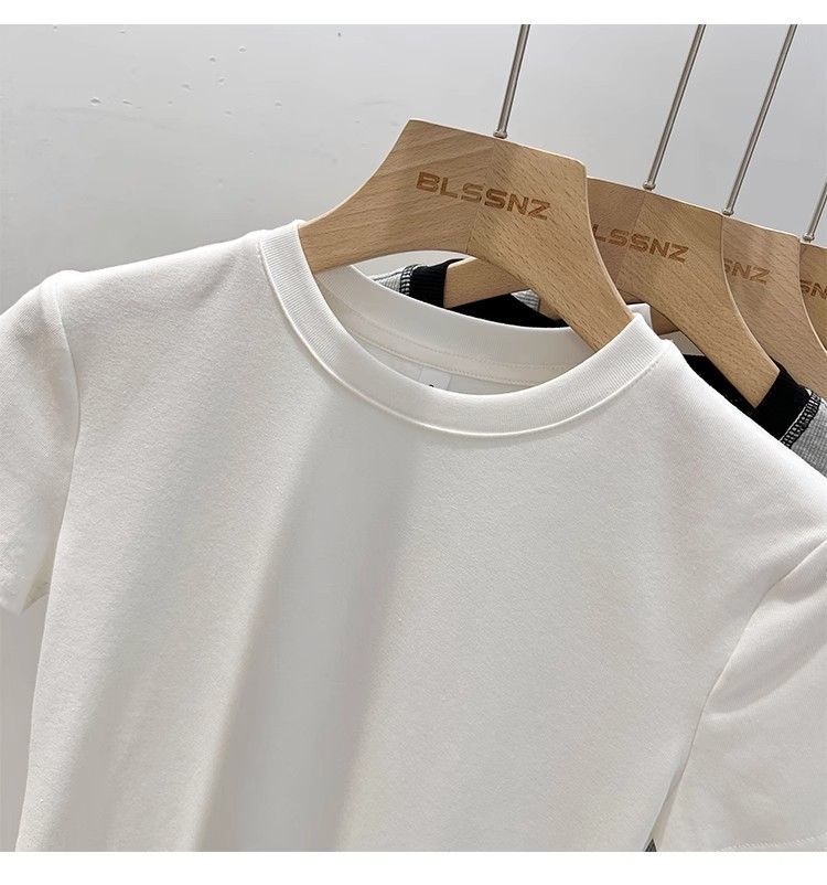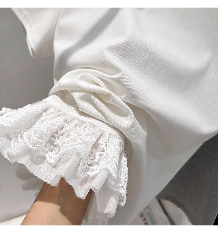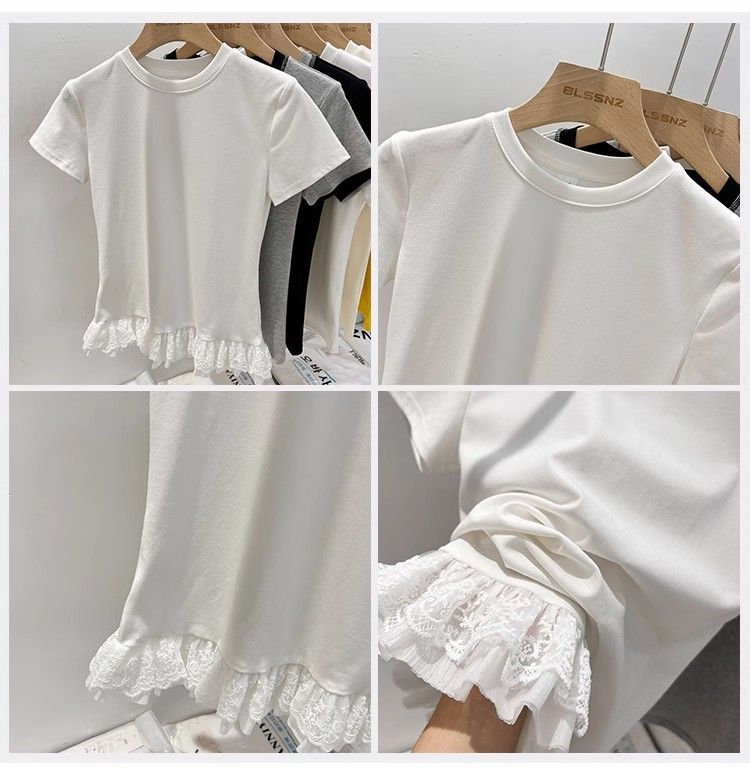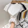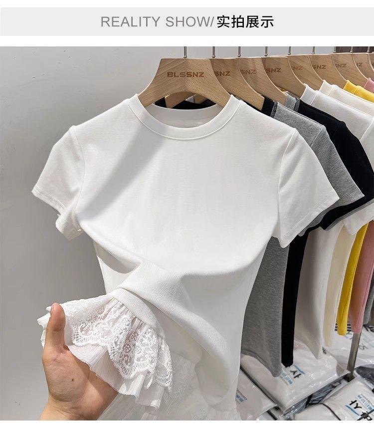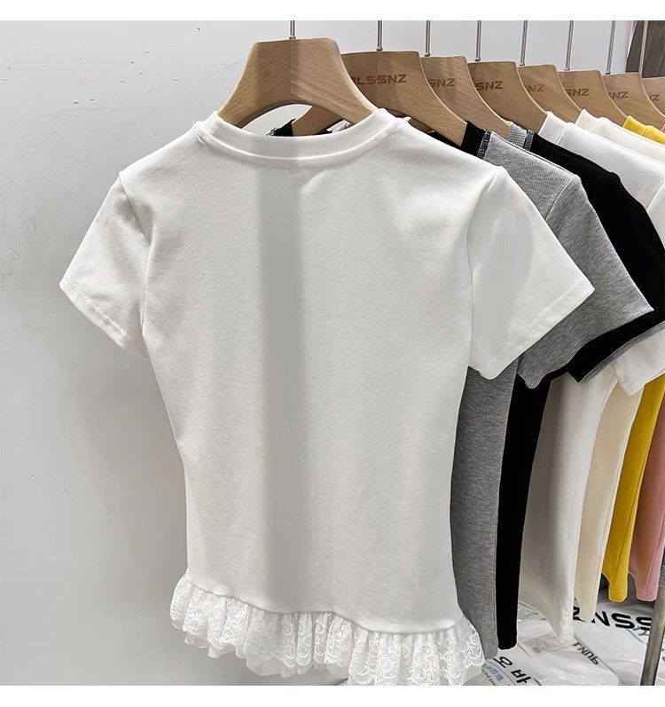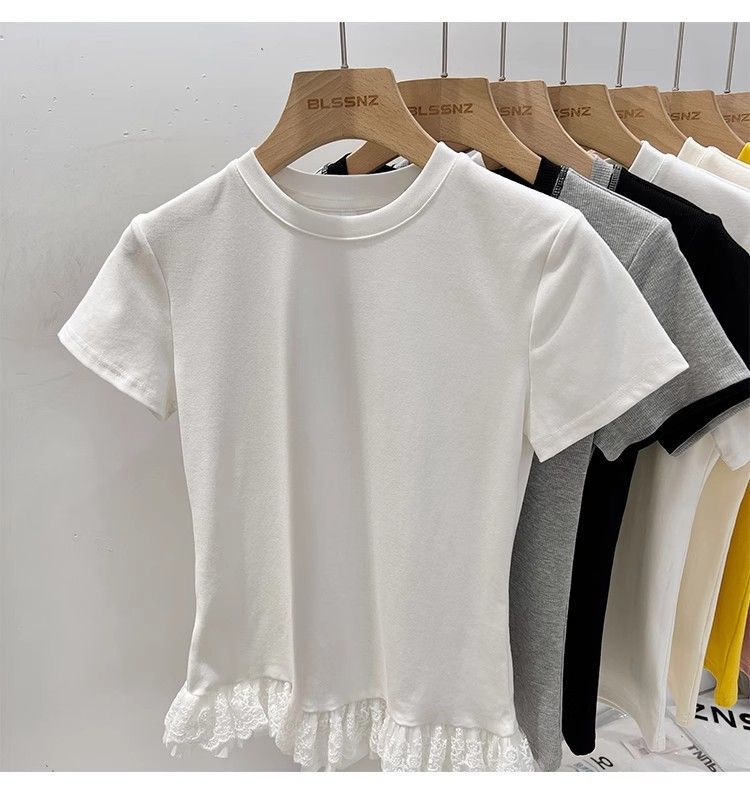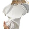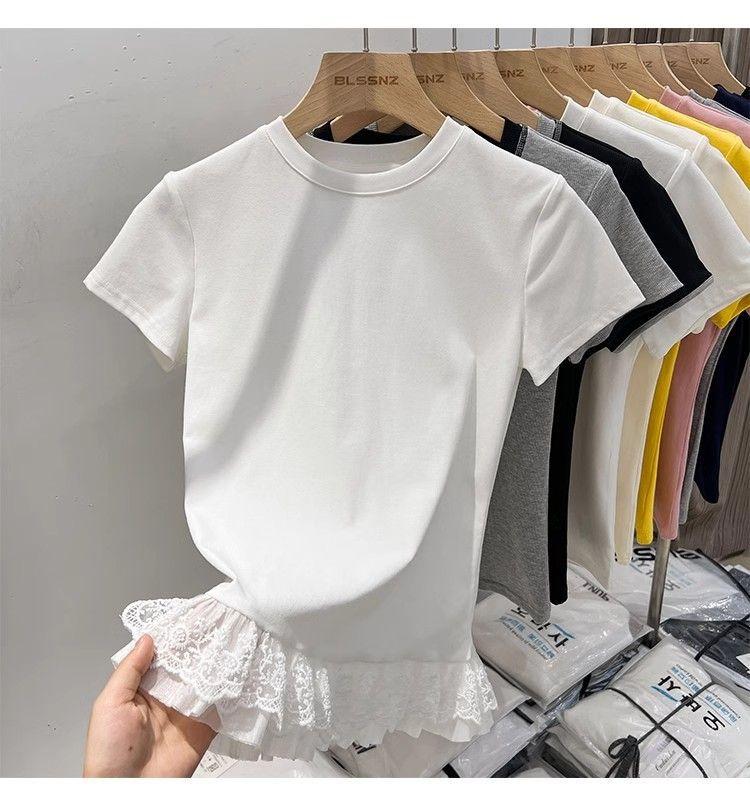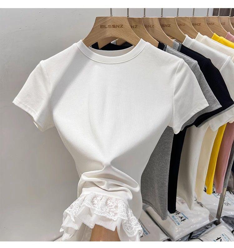 Camiseta blanca de manga corta con costuras de encaje para mujer, estilo nuevo de verano, diseño de estilo occidental, estilo nicho único, corte entallado, manga corta