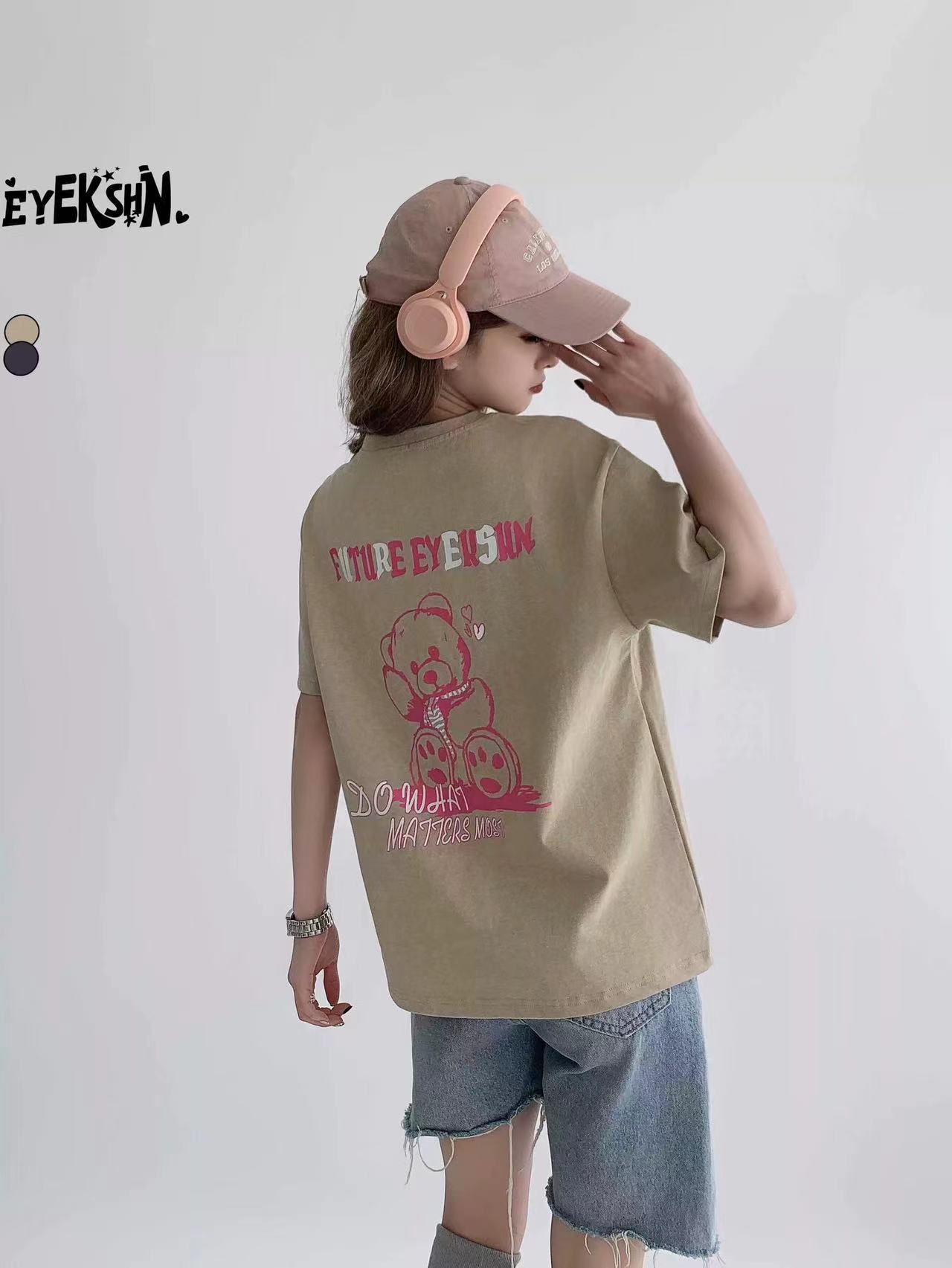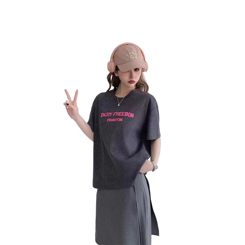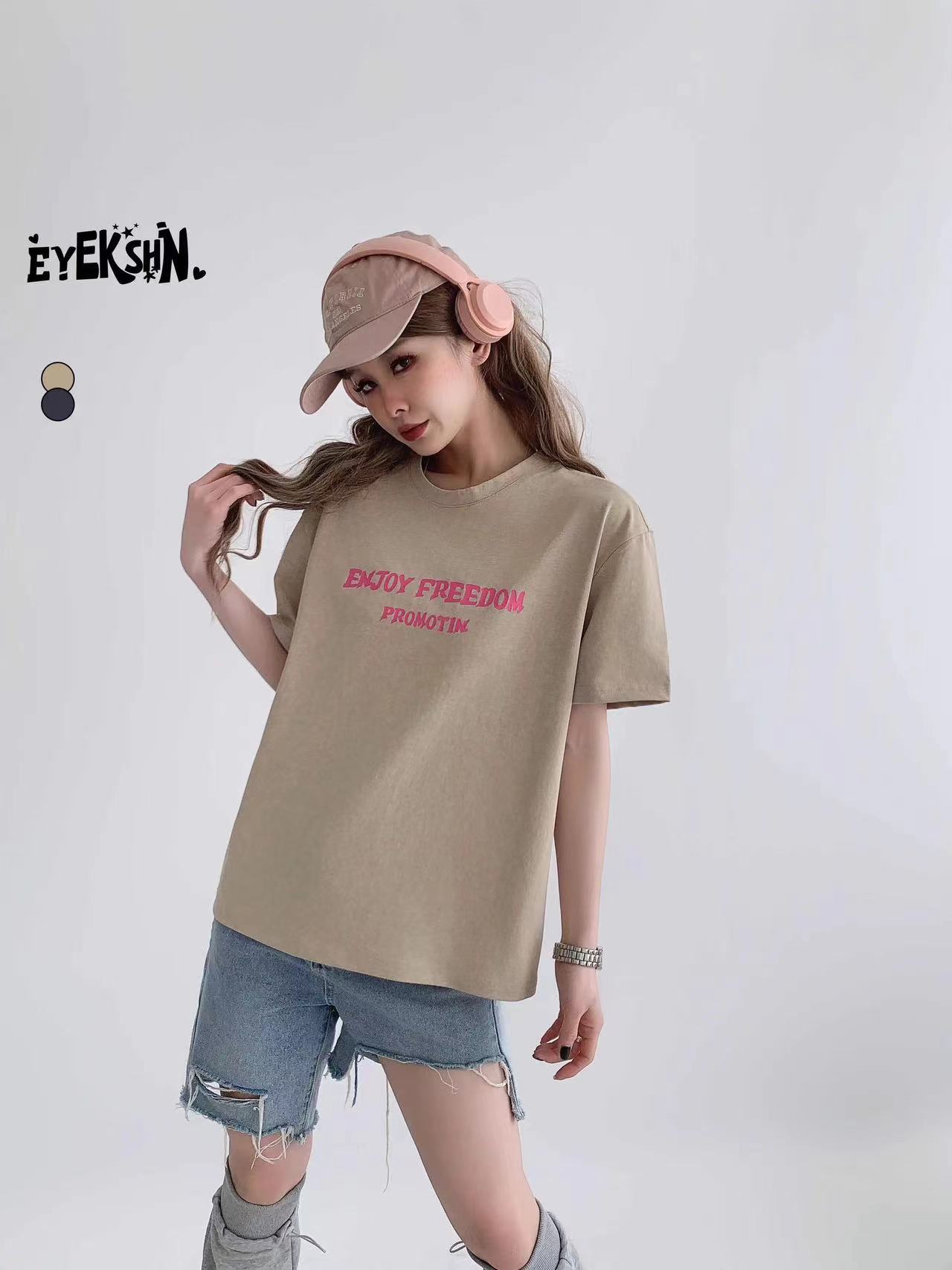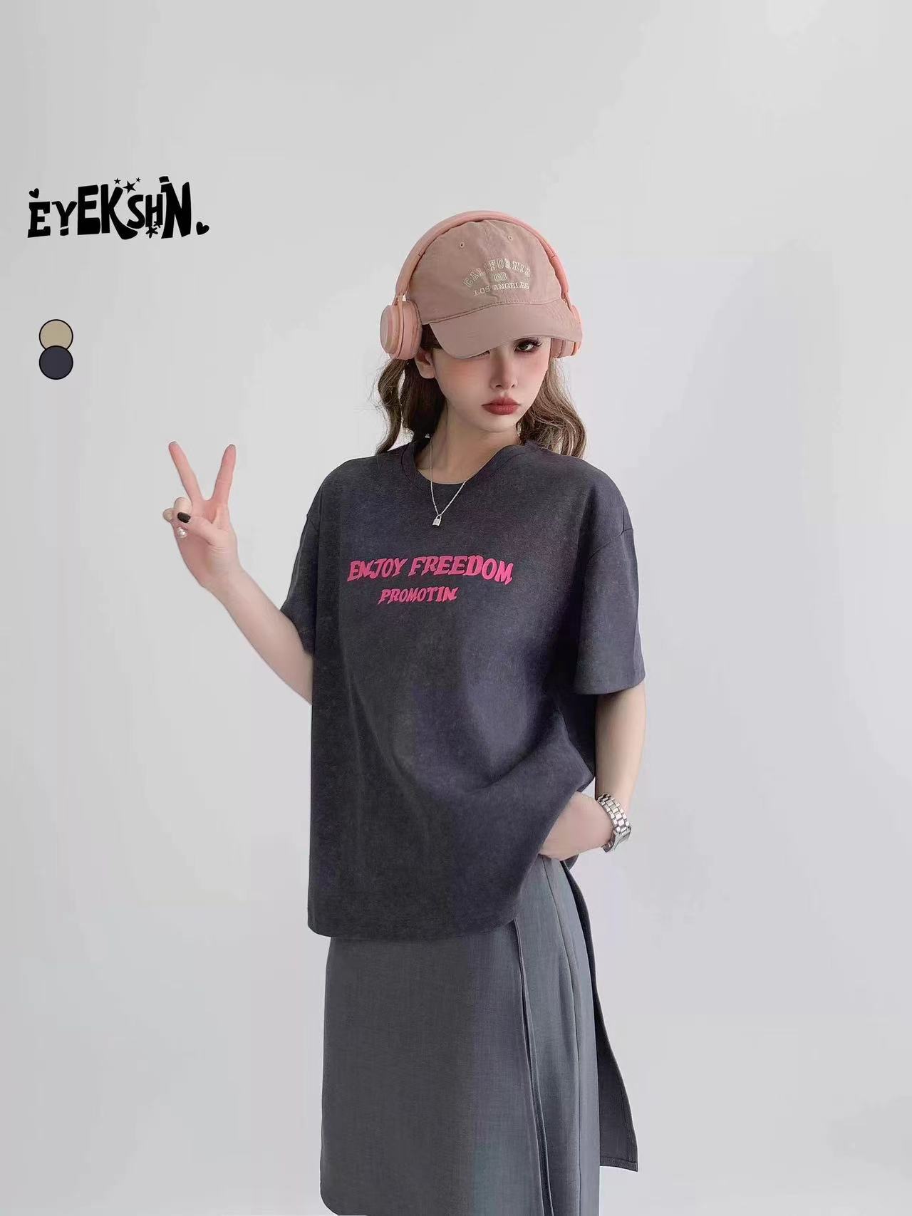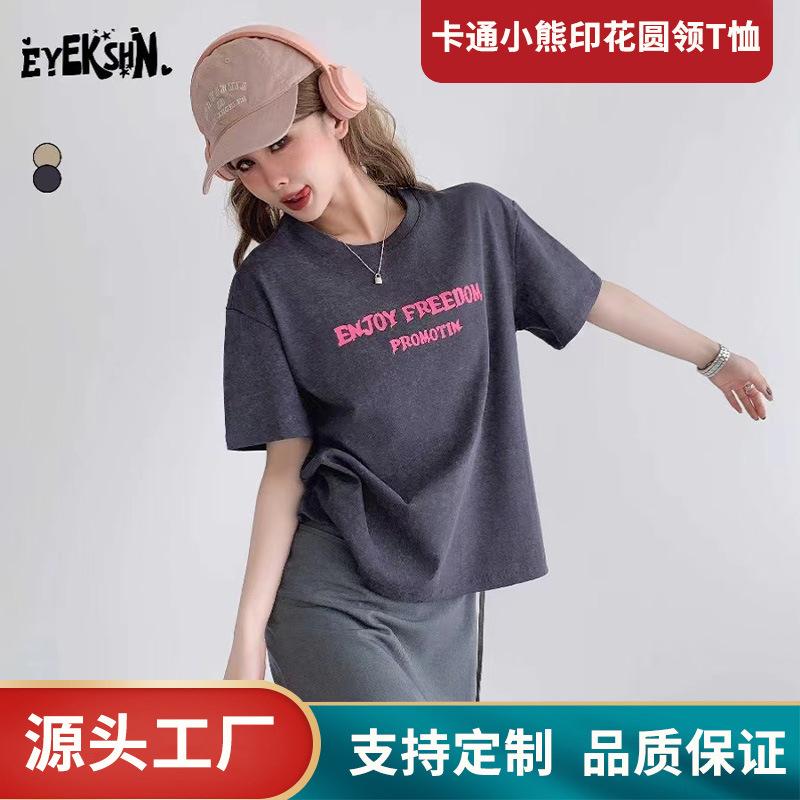 2024 Nueva Camiseta Americana de Manga Corta con Cuello Redondo para Mujer, Estilo Trendy de Verano Estampada de Media Manga, Slim, Holgada y Versátil