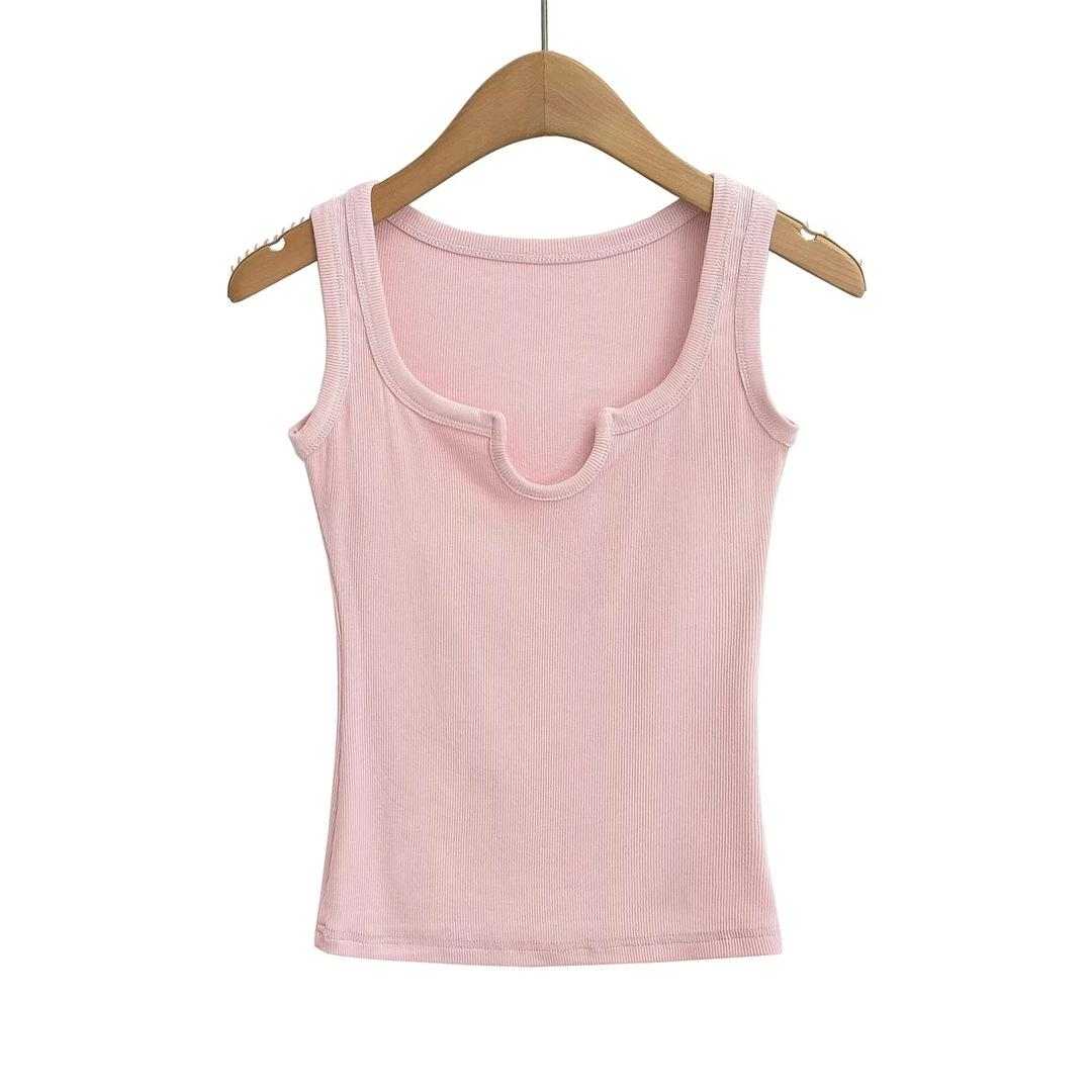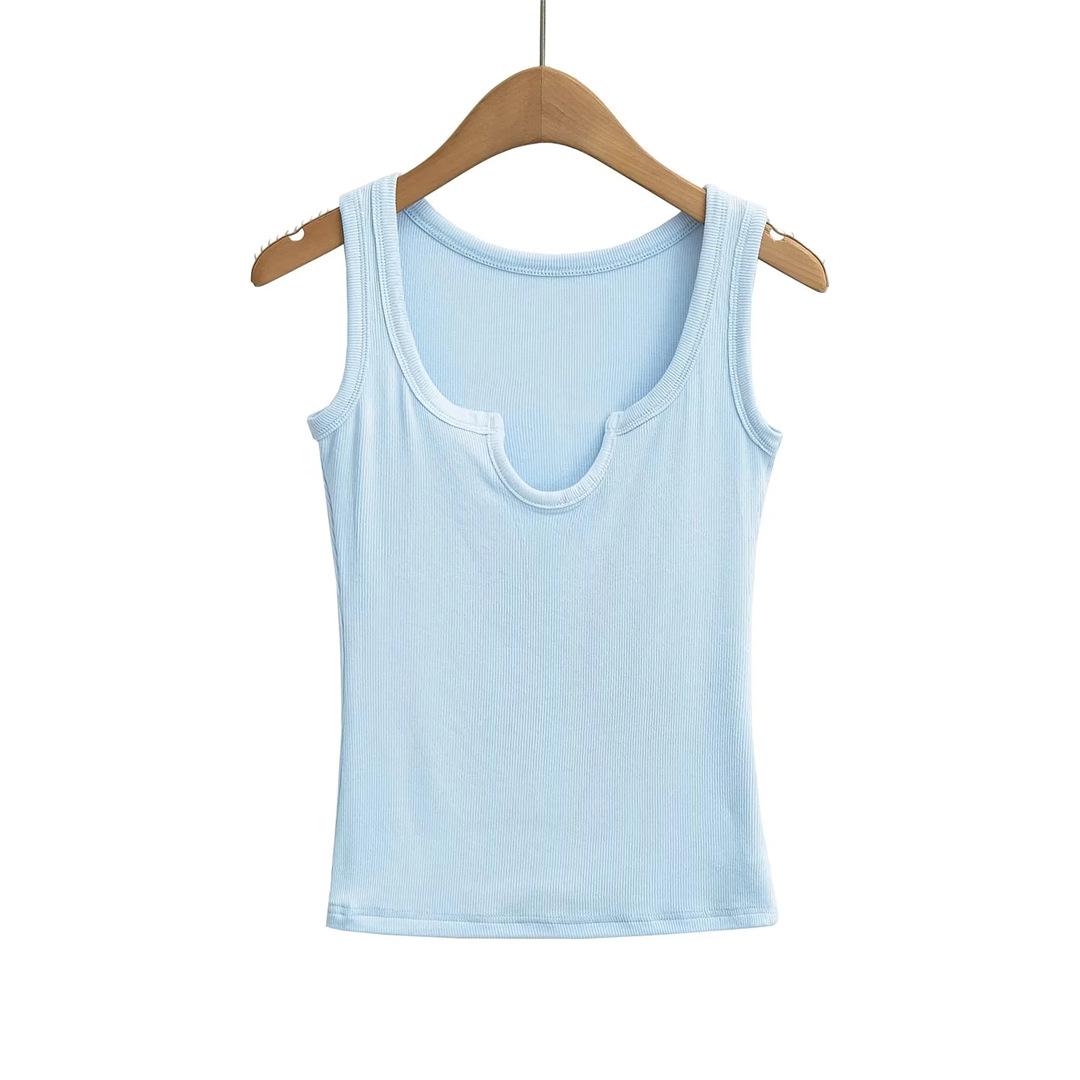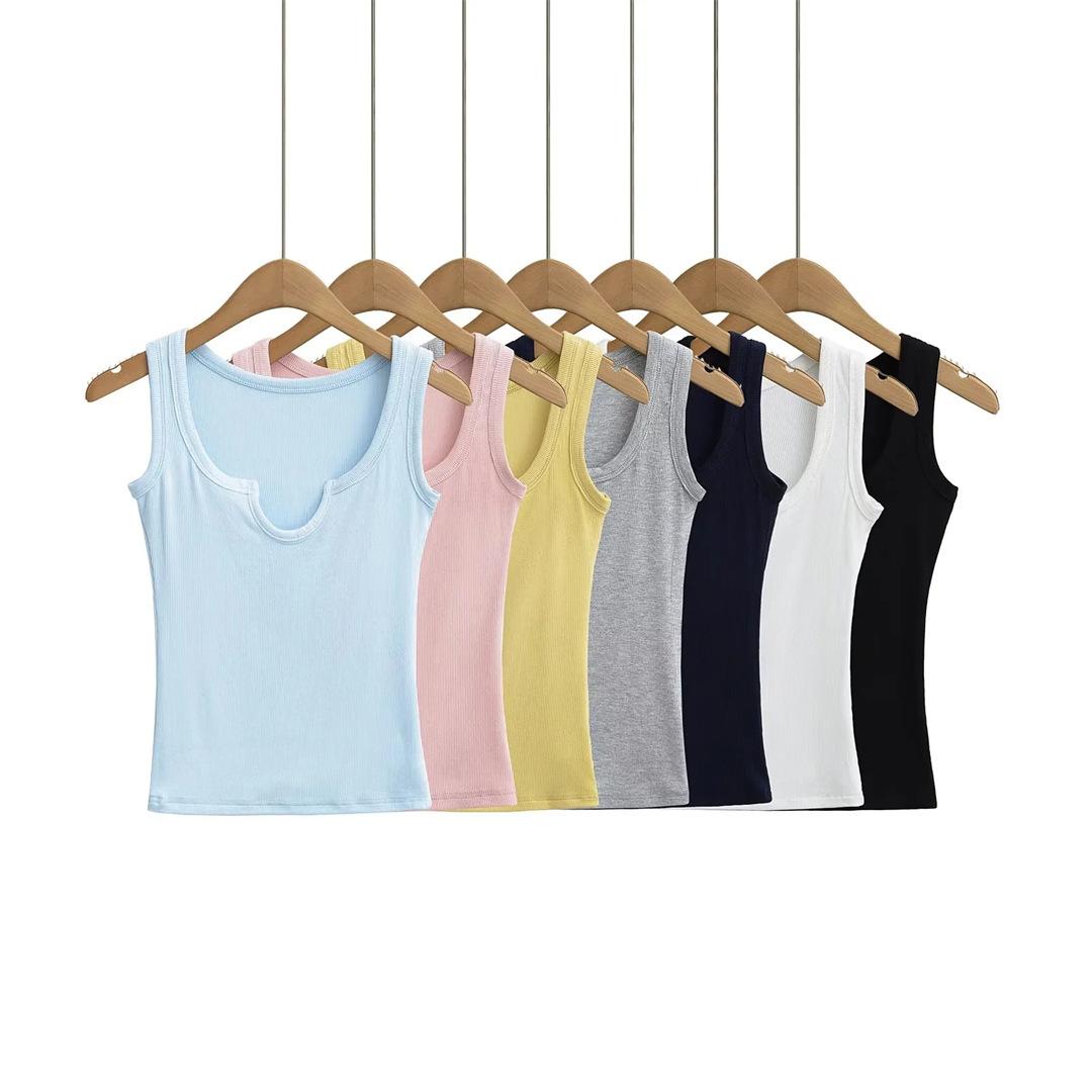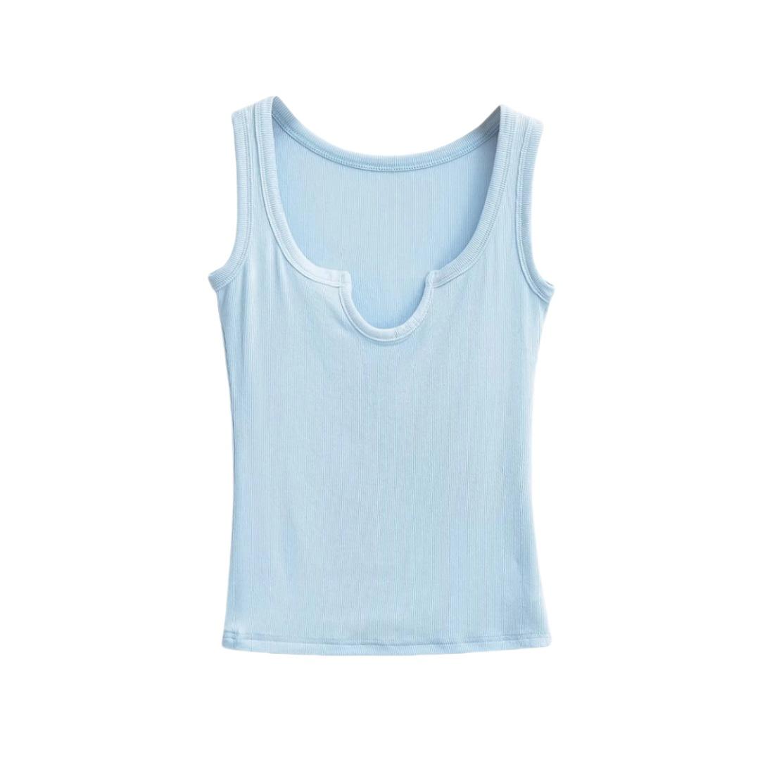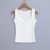 Top corto básico de color liso, estilo americano, sencillo, con escote en U, sin mangas y elástico, ajustado y con pecho pequeño para chica sexy.