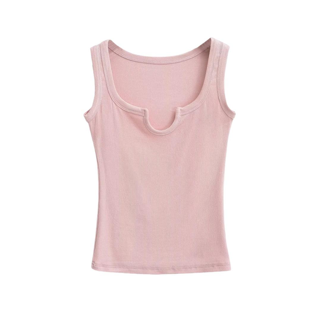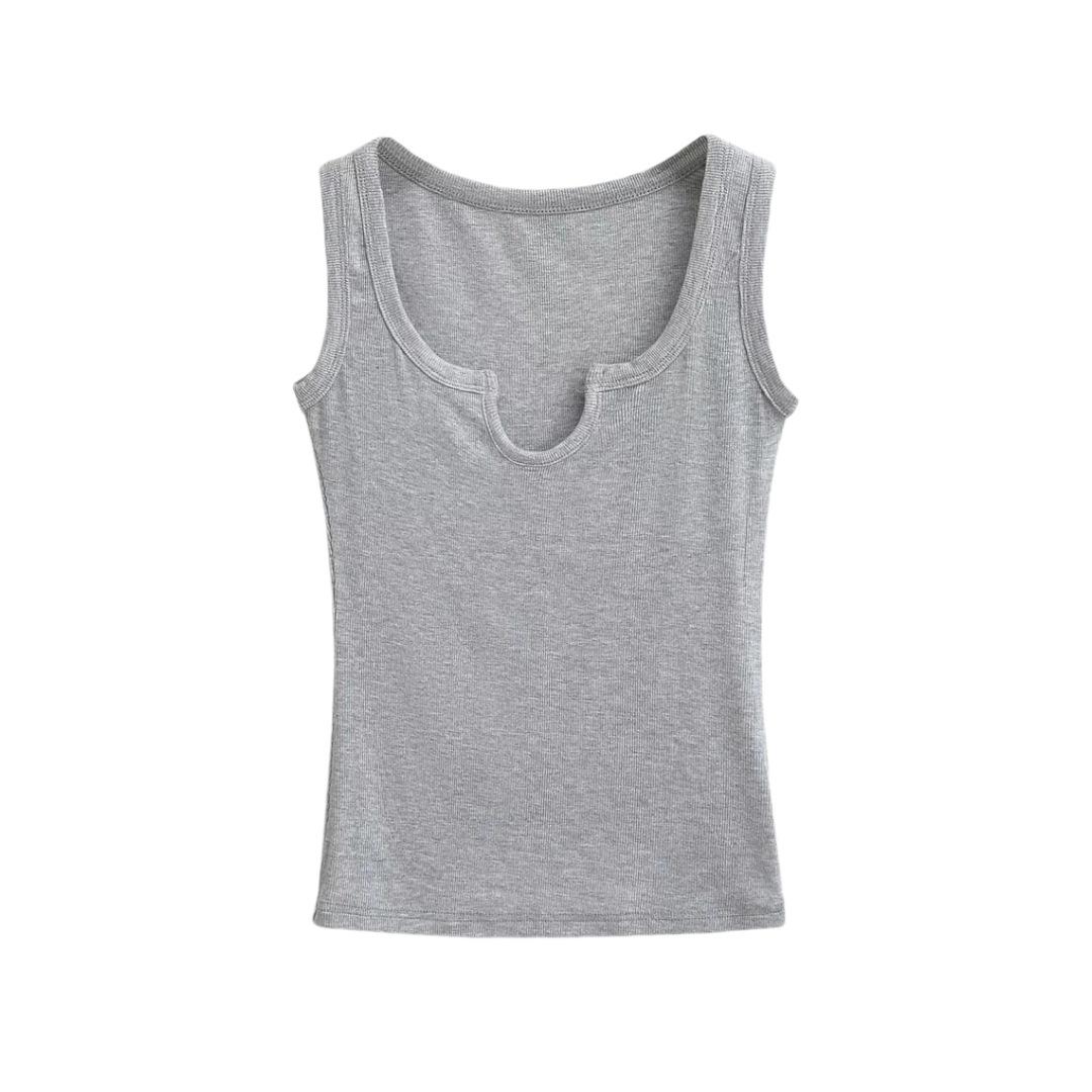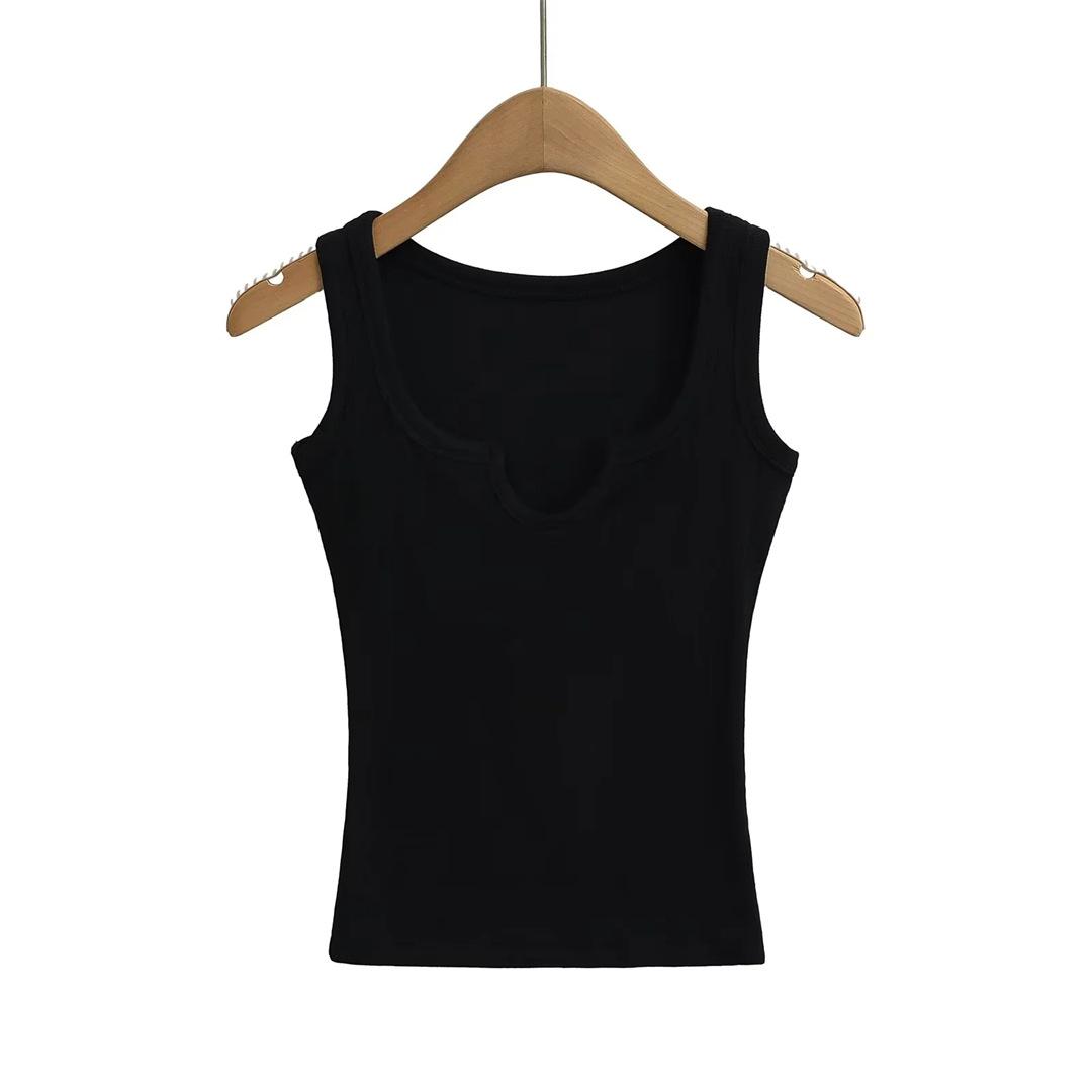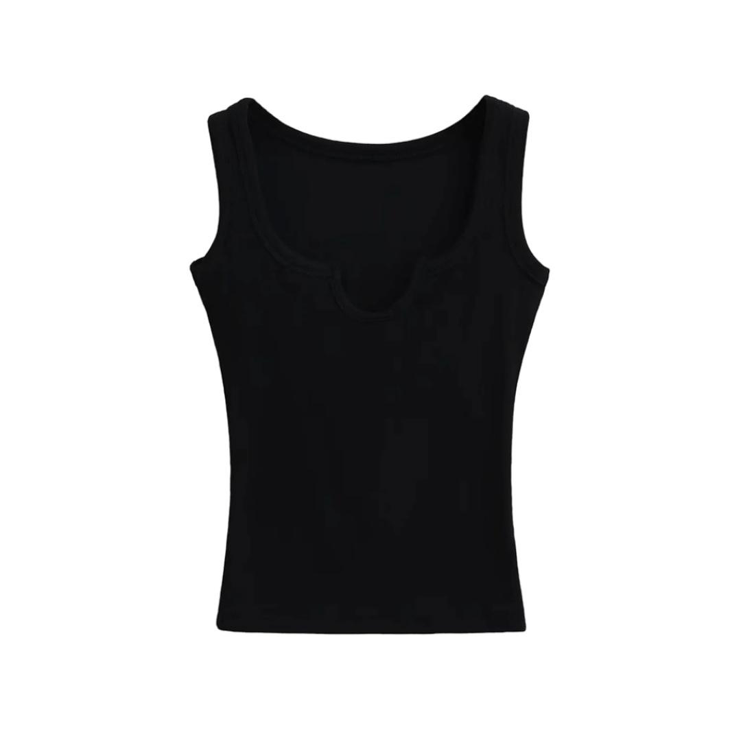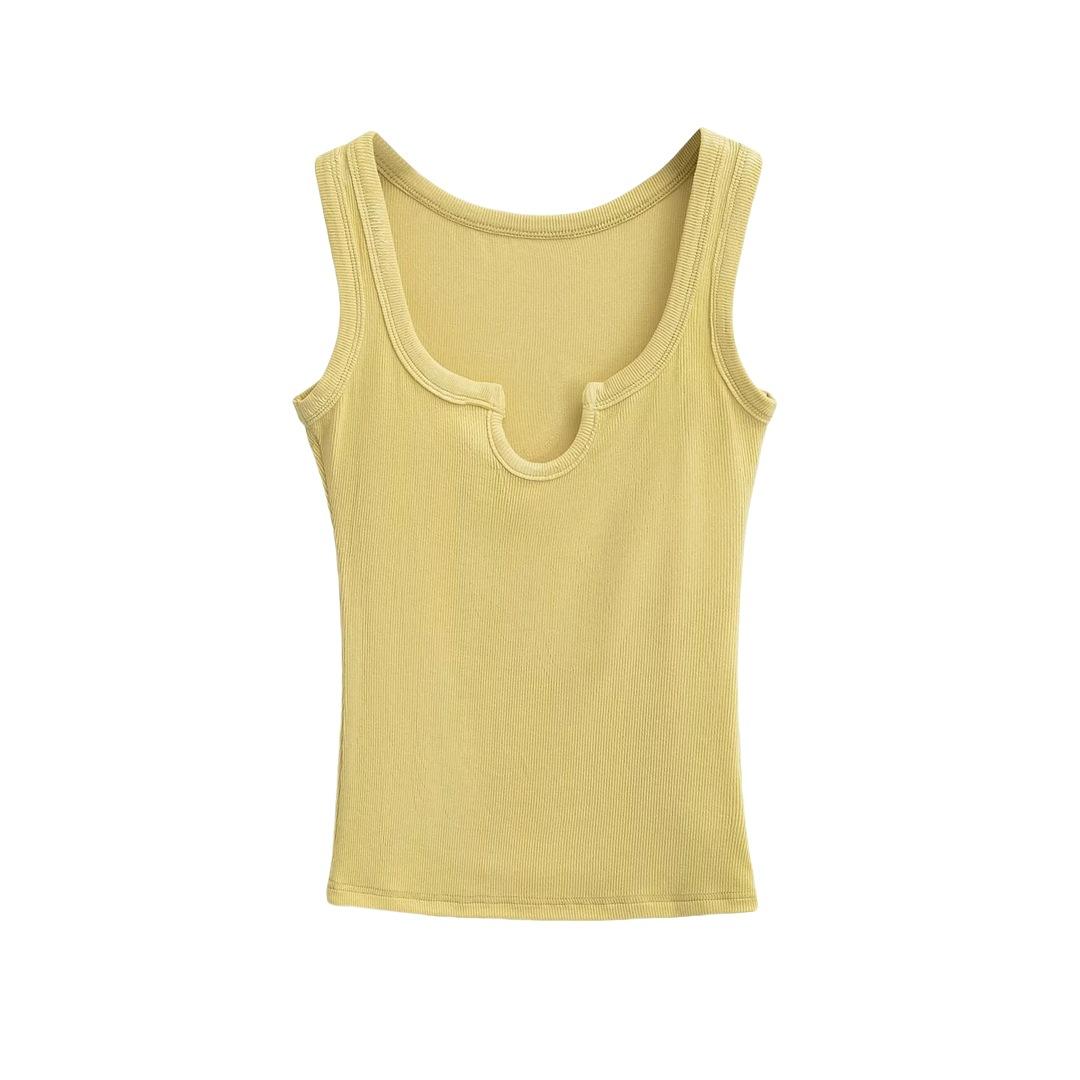 Top corto básico de color liso, estilo americano, sencillo, con escote en U, sin mangas y elástico, ajustado y con pecho pequeño para chica sexy.