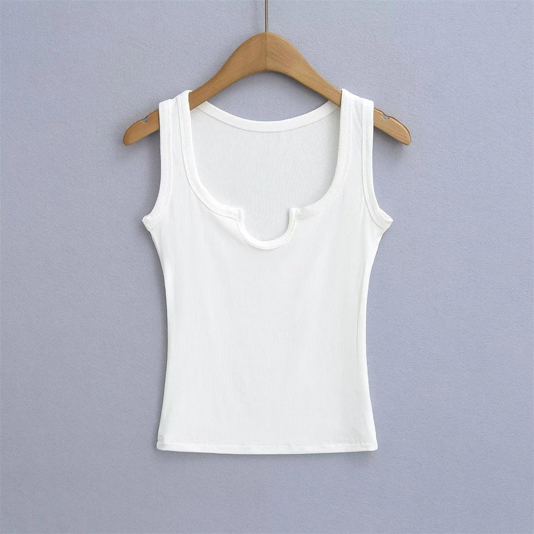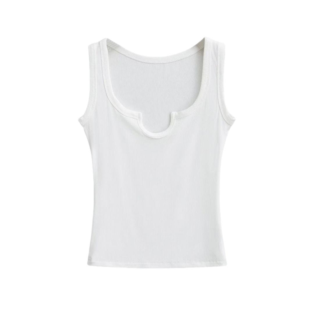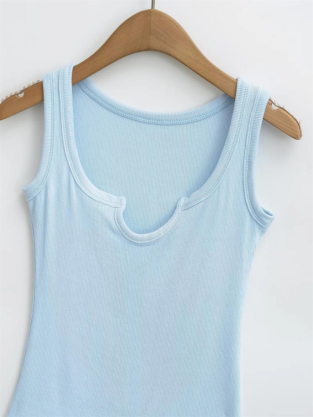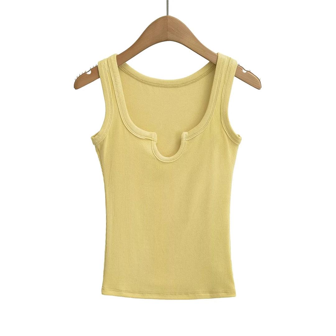 Top corto básico de color liso, estilo americano, sencillo, con escote en U, sin mangas y elástico, ajustado y con pecho pequeño para chica sexy.