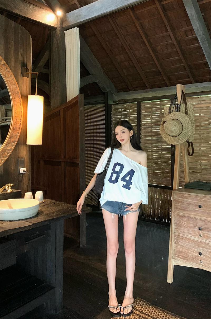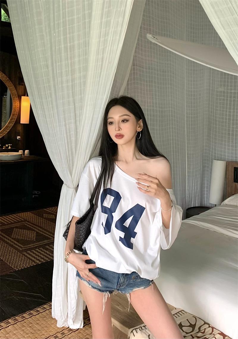 Playera azul marino estampada de hombro oblicuo y manga corta para mujer en verano, holgada, estilo americano hot chic de media manga versátil.