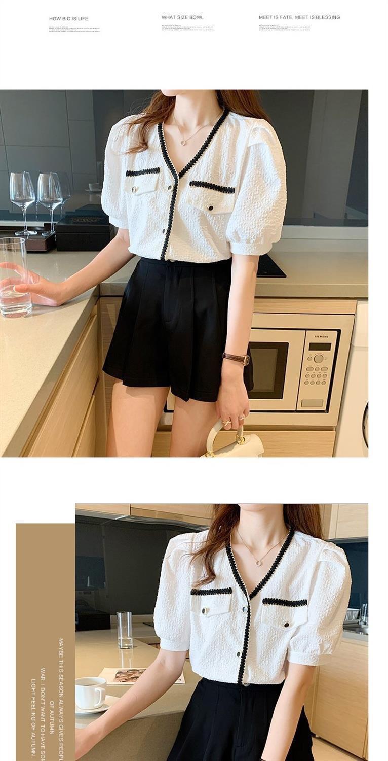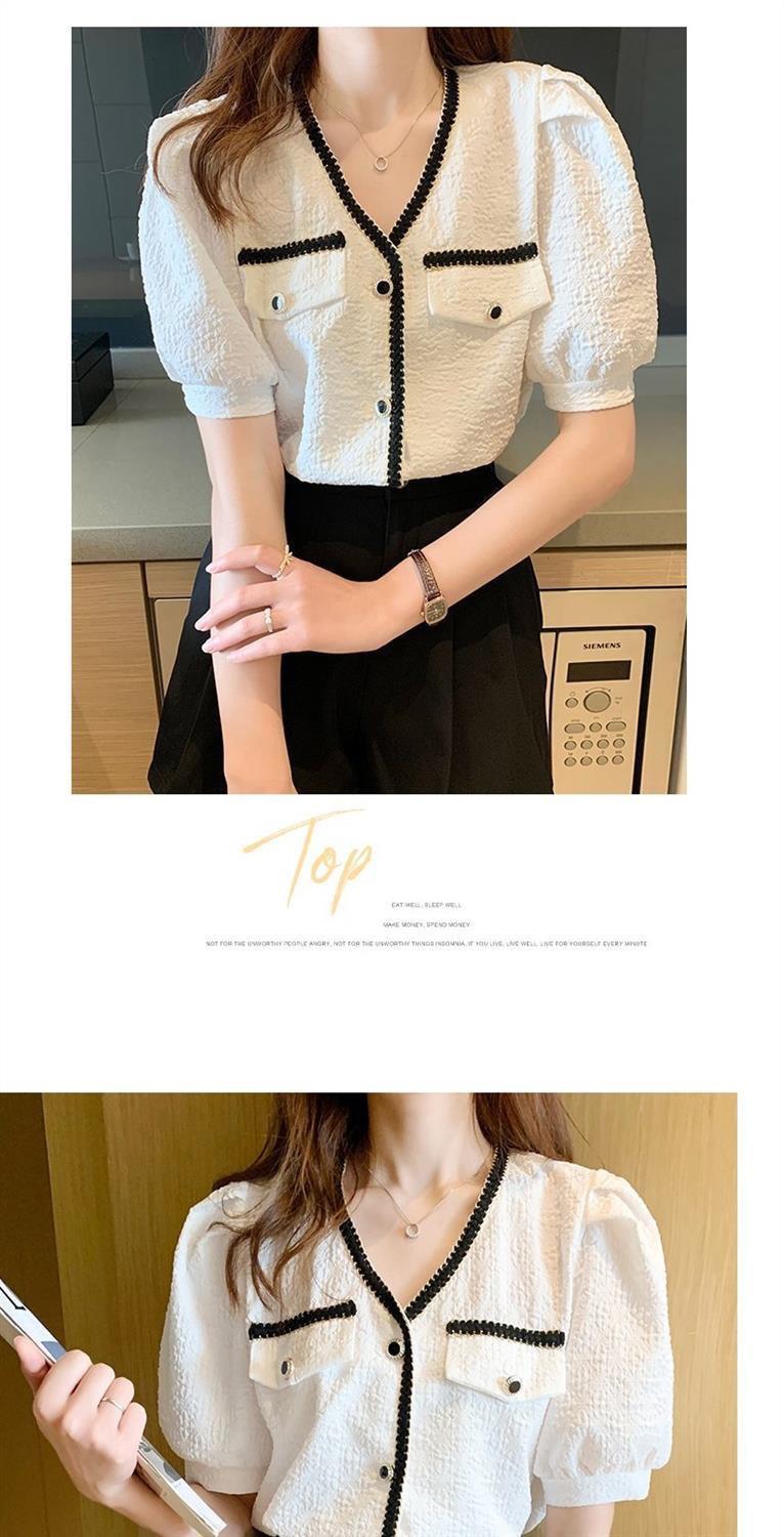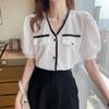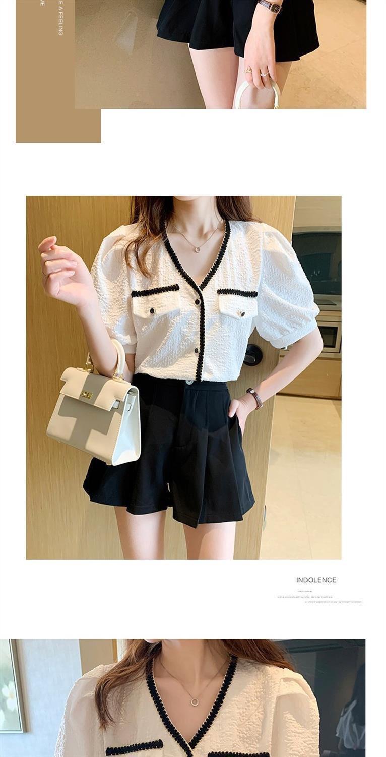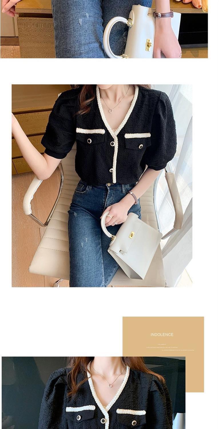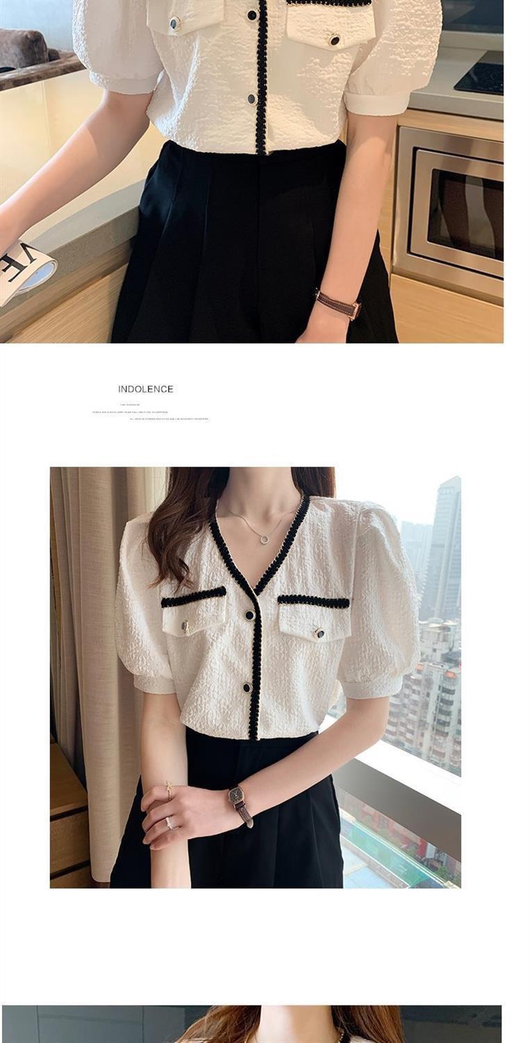 Compra Camisa de gasa estilo Chanel de verano 2022, moderna y versátil, para mujer, top de manga corta, encaje, cuello en V, manga abullonada, a la moda al por mayor en Joom.pro