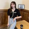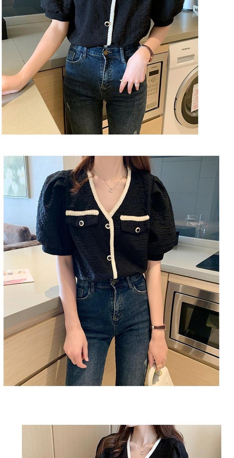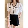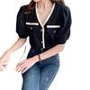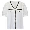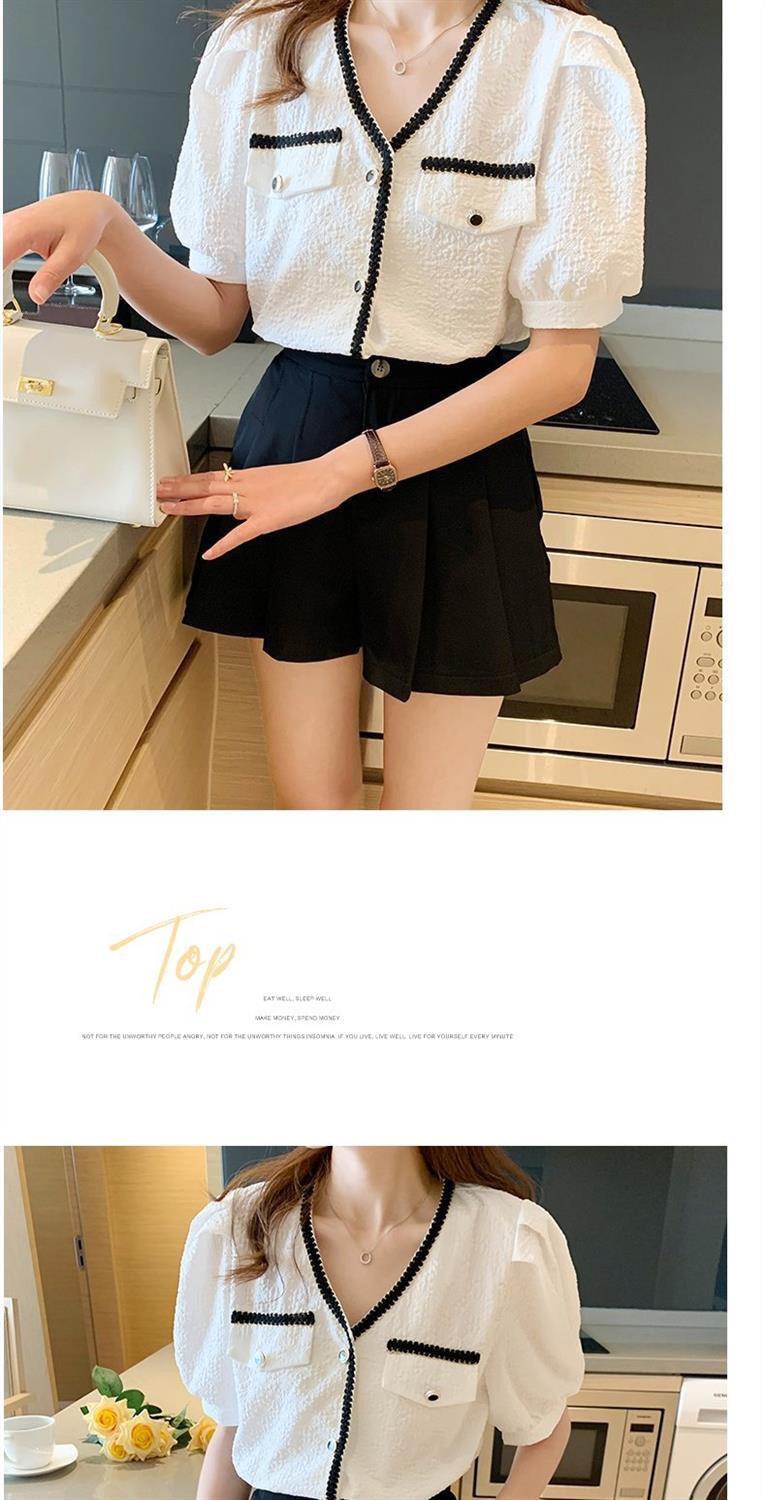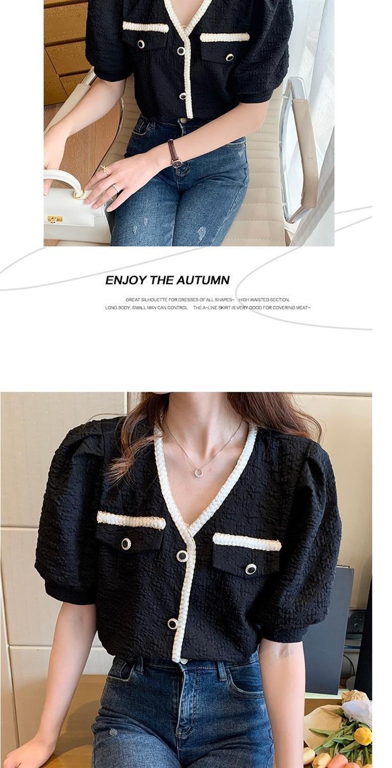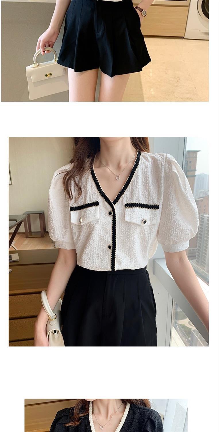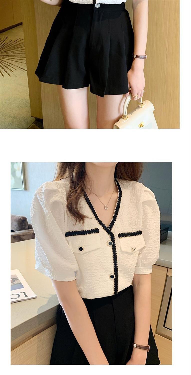 Compra Camisa de gasa estilo Chanel de verano 2022, moderna y versátil, para mujer, top de manga corta, encaje, cuello en V, manga abullonada, a la moda al por mayor en Joom.pro