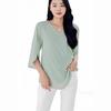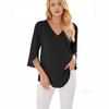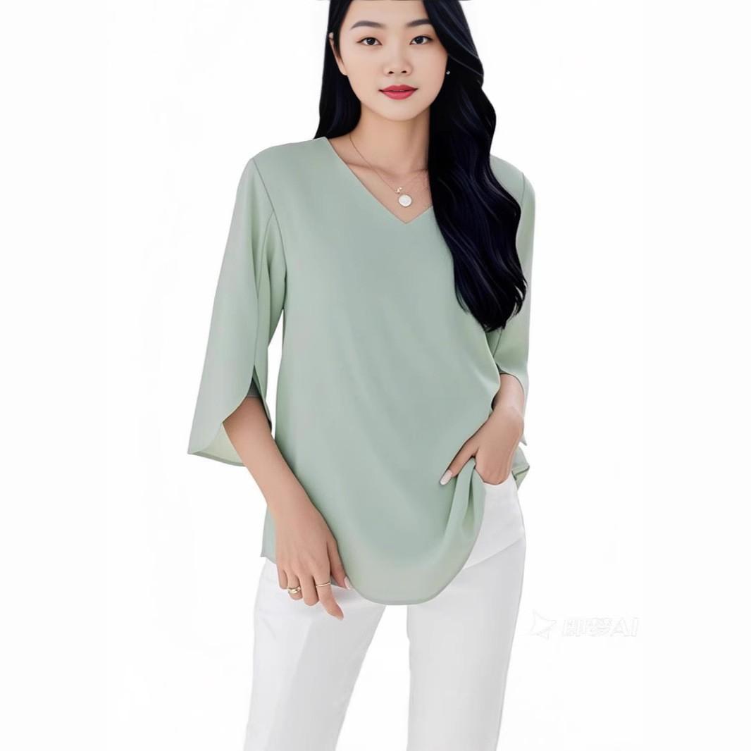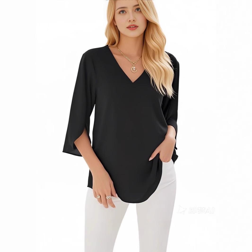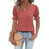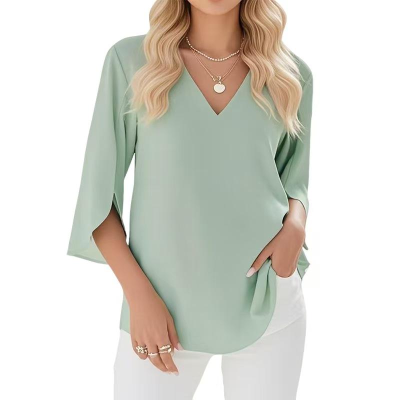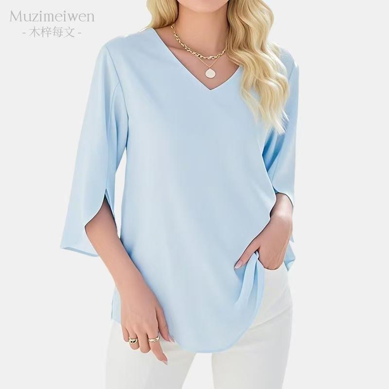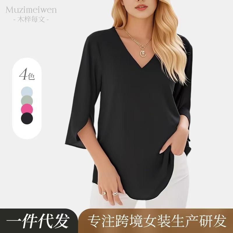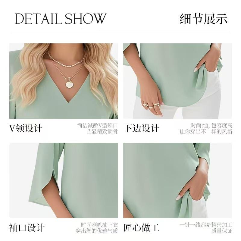 Amazon 2025 Camisa Transfronteriza Europea y Americana Verano Nuevo Cuello V Color Puro Chifón Manga Corta Top Casual Camiseta para Mujer
