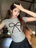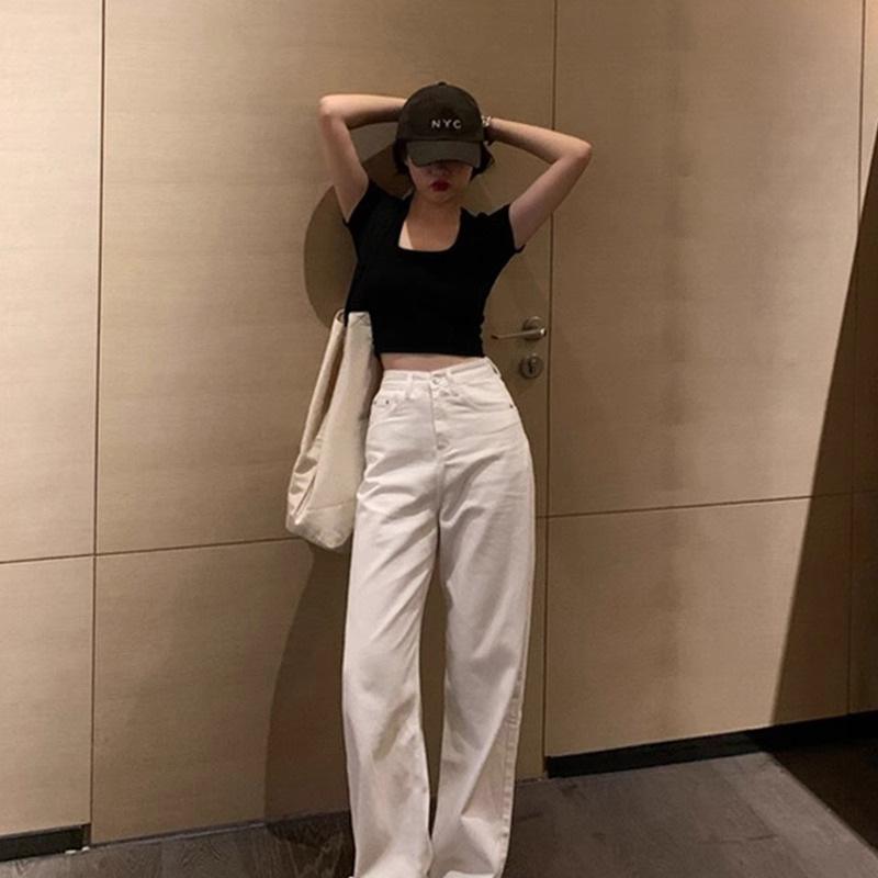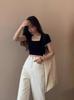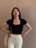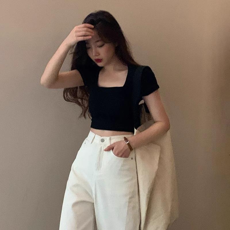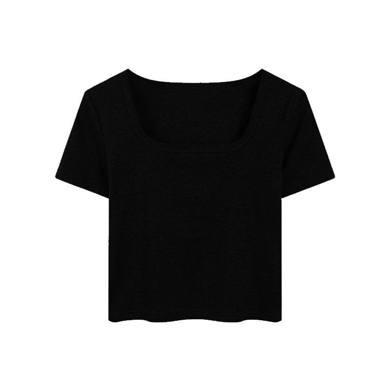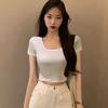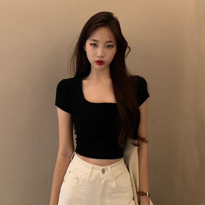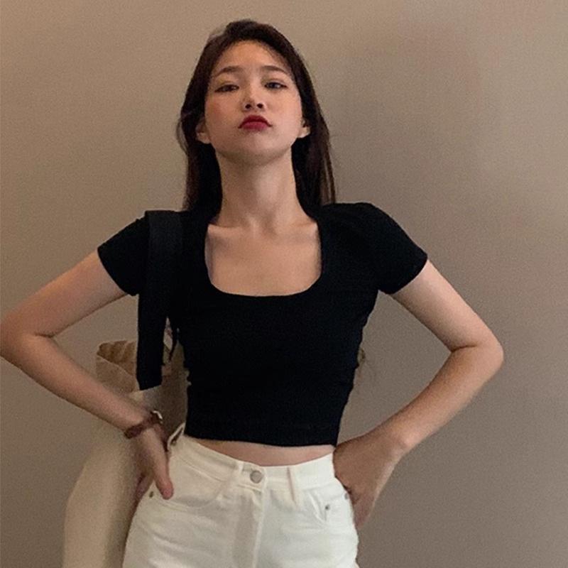 Camiseta de algodón de manga corta con cuello cuadrado y hombros descubiertos, corte entallado, cintura alta, novedad de verano 2024, top corto de moda.